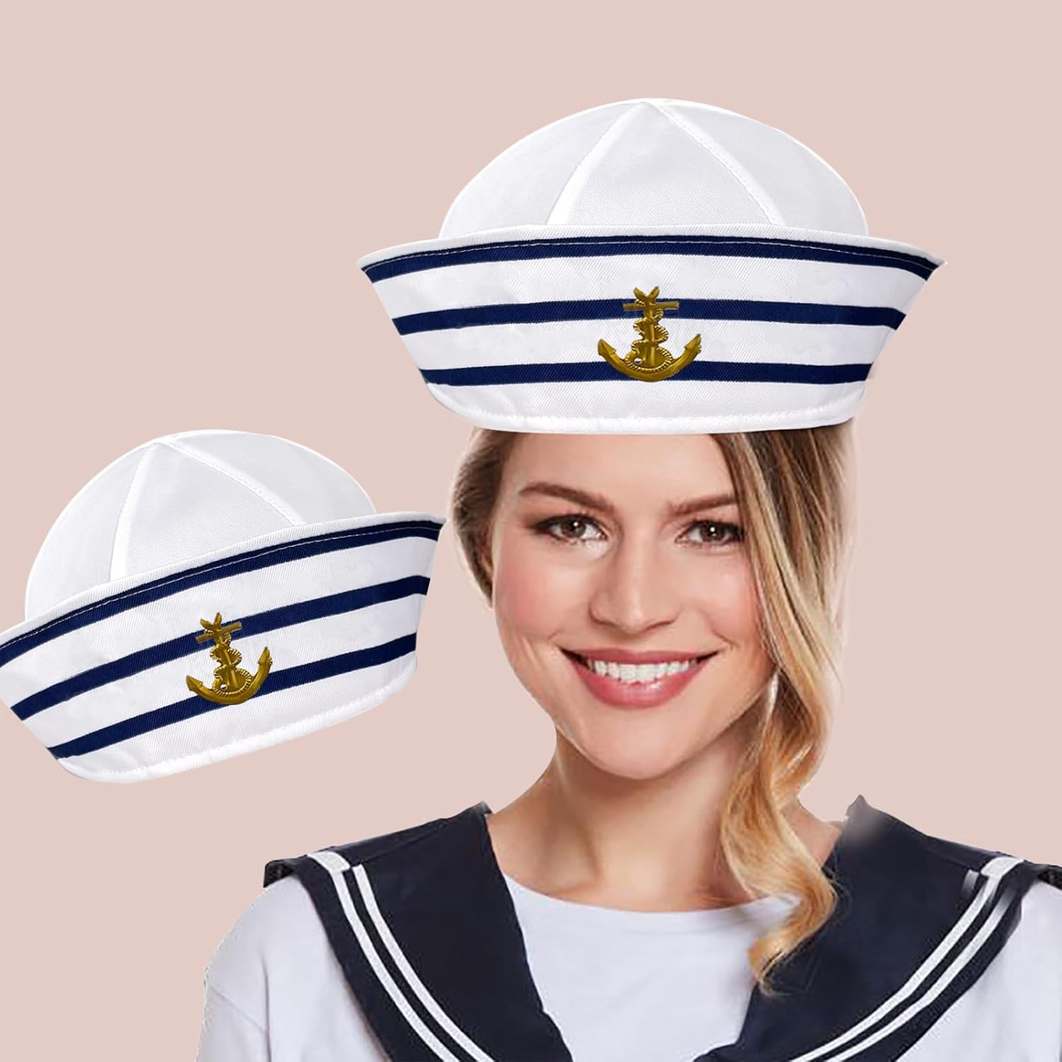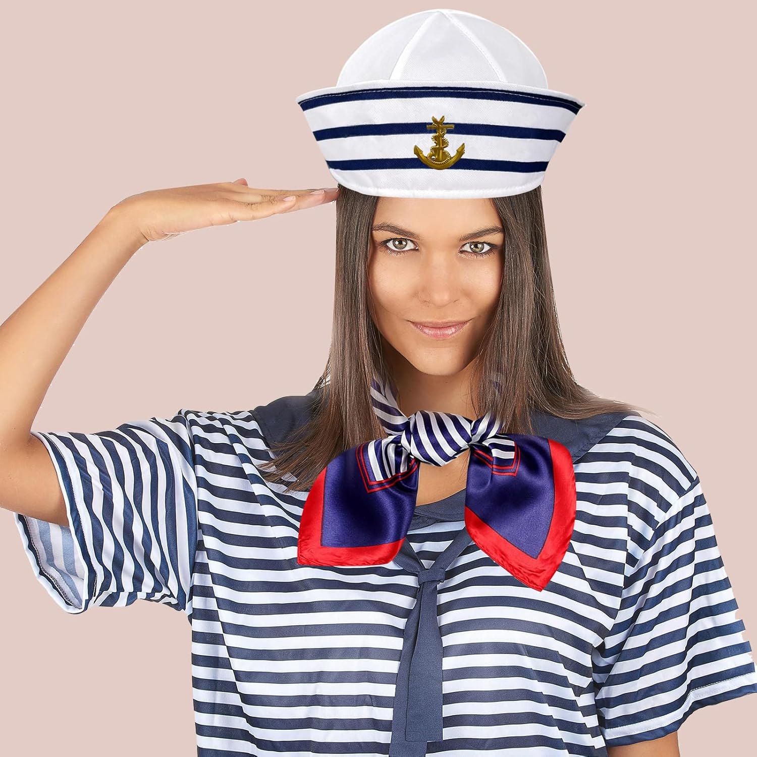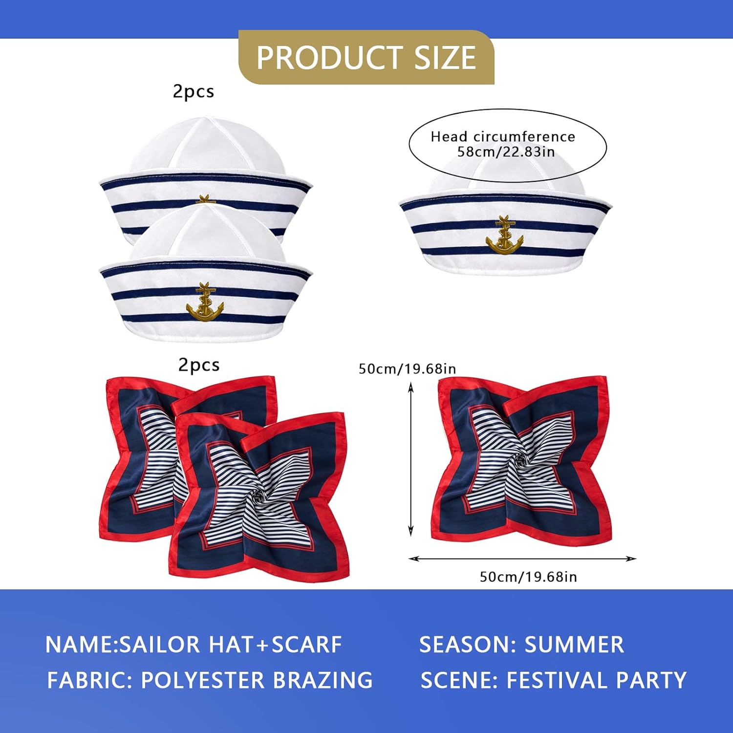 Riceverete: 2 cappelli da marinaio e 2 sciarpe, i cappelli da marinaio sono a righe bianche e blu e le sciarpe sono quadrate con bordi rossi e strisce blu. Materiale confortevole: il cappello da marinaio è realizzato in poliestere e presenta un motivo di barche a vela sulla tesa anteriore del cappello. Anche la sciarpa è in poliestere, confortevole e liscia al tatto. Dimensioni: il cappello da marinaio blu e bianco misura circa 22,05 pollici/ 56 cm di circonferenza, 3,1 pollici/ 8 cm di altezza, adatto alla maggior parte degli adulti e dei bambini più grandi, e può essere fissato con un fermaglio per capelli per adattarsi alle teste più piccole. Divertente set da marinaio: il set da marinaio può essere regalato a te stesso, agli amici e alla famiglia, questo bellissimo costume sarà il pezzo forte della festa. Ambito di utilizzo: Il set da marinaio è adatto per feste in barca nautica, feste in costume, vacanze, pesca, spettacoli teatrali, cosplay, feste in piscina e altro ancora.