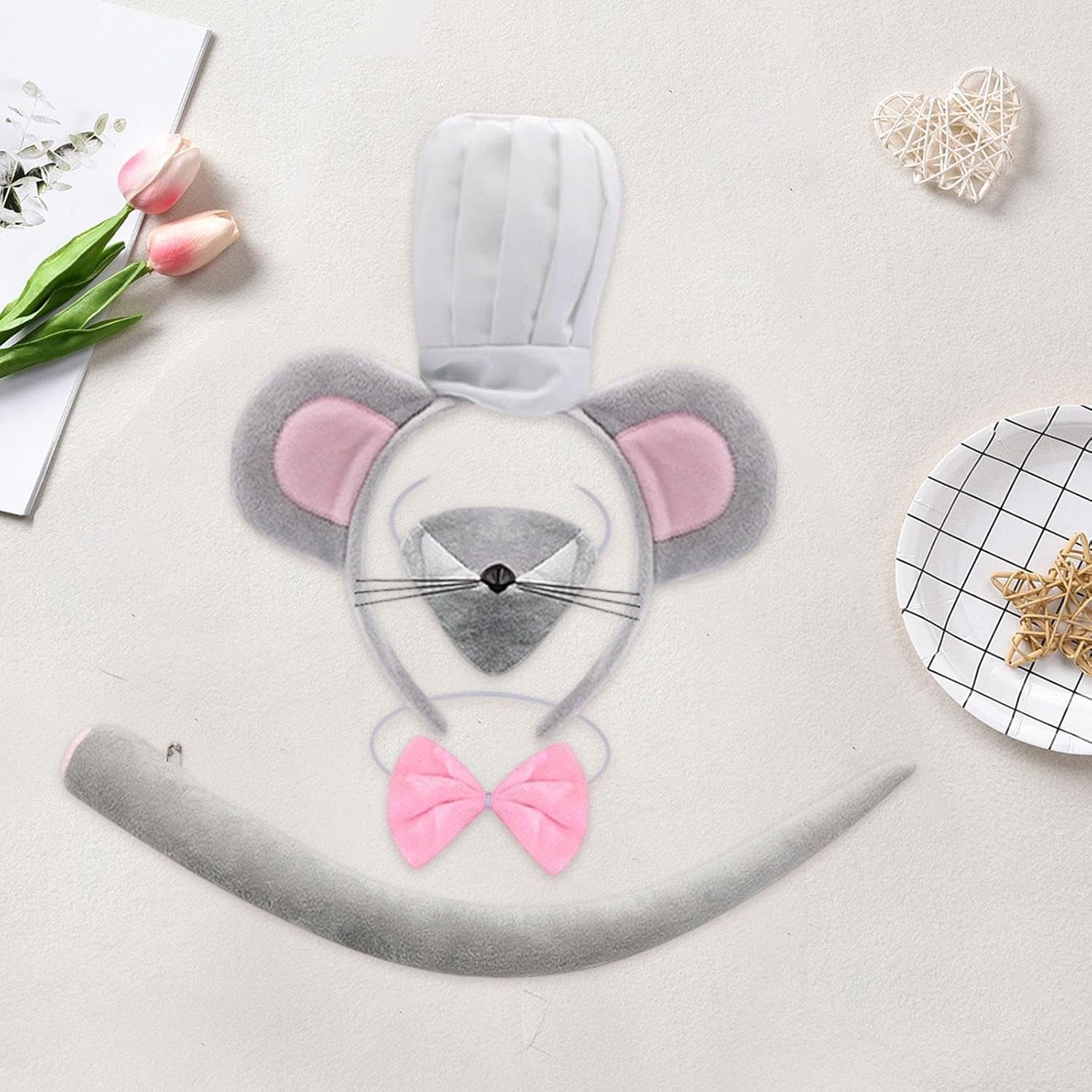 【Tema】Questo set di costumi per animali dà vita a un giocoso personaggio da chef topo, perfetto per Halloween e eventi cosplay. 【Da indossare】: Fascia per capelli con orecchie adatte alla taglia, regali divertenti per. 【Materiale】Fascia per capelli con cappello da chef realizzata in fibra di poliestere di alta qualità, che garantisce comfort e durata per le persone attive Ideale per feste di Halloween, recite scolastiche, giornate in costume a tema o giochi fantasiosi a casa. 【Taglia】La fascia misura 25 cm x 23 cm (9,84" x 9,06") ed è progettata per adattarsi comodamente ai bambini senza scivolare