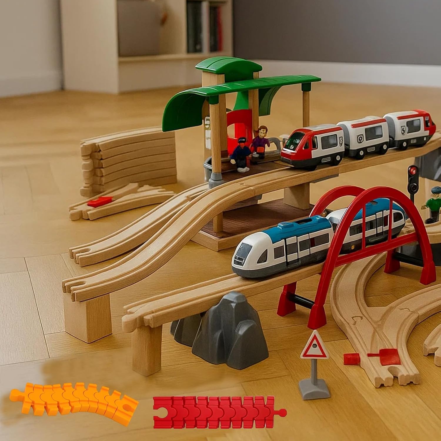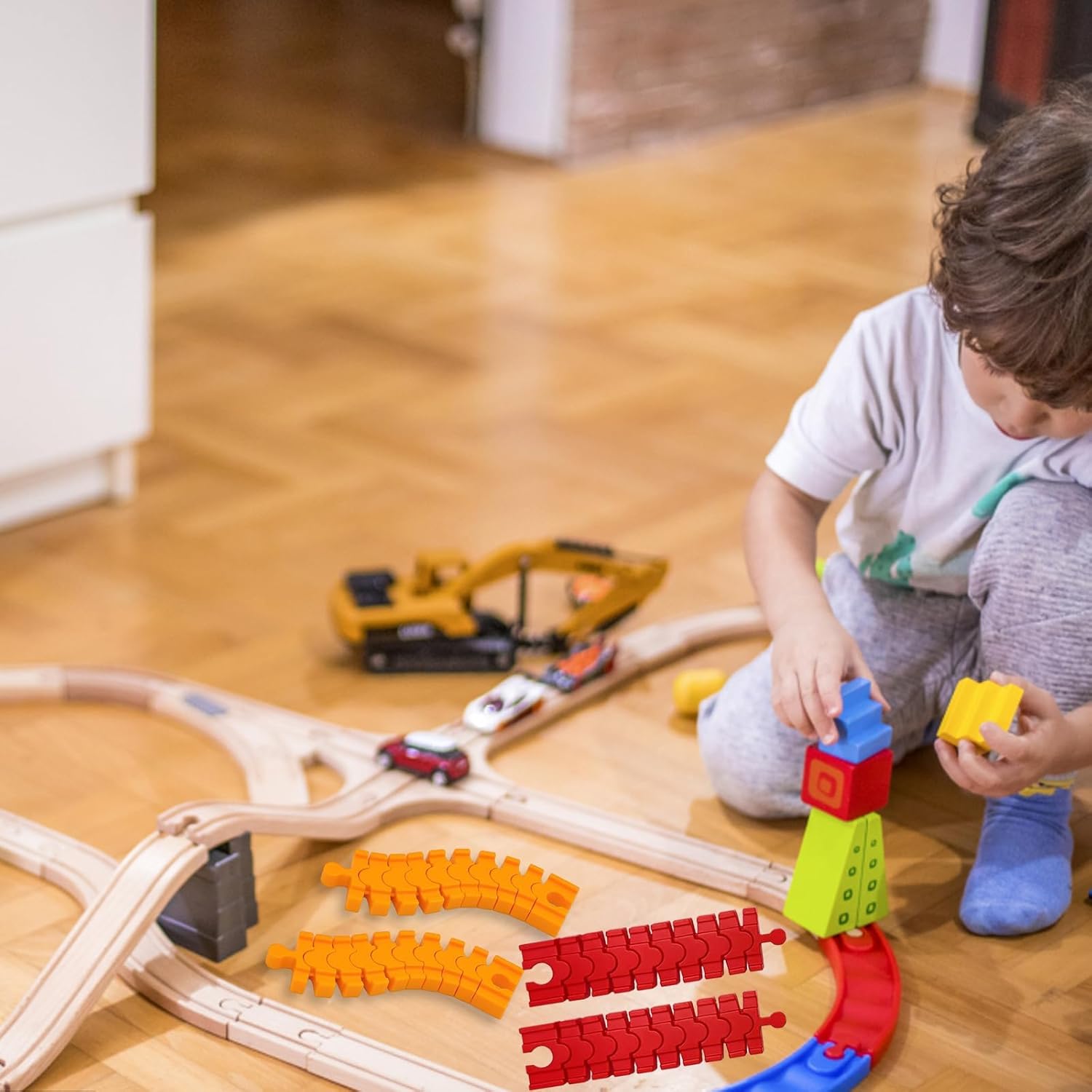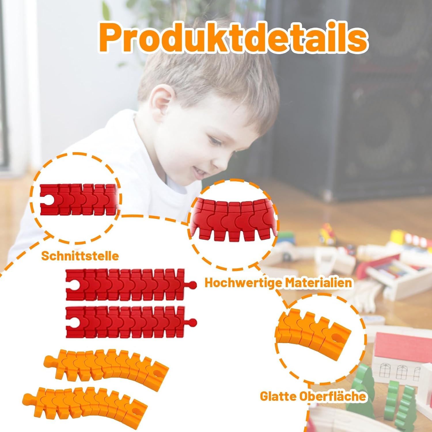 Ferrovia in legno: questi 4 binari per treni in legno offrono molteplici possibilità di gioco; le robuste guide in legno promuovono le abilità motorie e le idee di gioco creative; ideale per l'espansione dei set ferroviari in legno esistenti. Accessori ferroviari in legno: i connettori per binari consentono un montaggio facile e sicuro; l'uso flessibile supporta diversi scenari di gioco; perfetto per attività familiari e ambienti di gioco educativi. Binari in legno: realizzati in materiale resistente per una lunga durata; incoraggia ore di divertimento da soli o con gli amici. Facile da usare: i binari sono facili da collegare e separare; Supporta lo sviluppo del pensiero spaziale e delle abilità logiche. Valore educativo del gioco: promuove lo sviluppo cognitivo e l'interazione sociale; Ispira la costruzione creativa e le esperienze di gioco condivise; un regalo senza tempo per i giovani appassionati di ferrovia.
