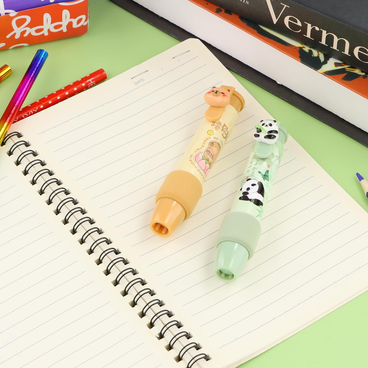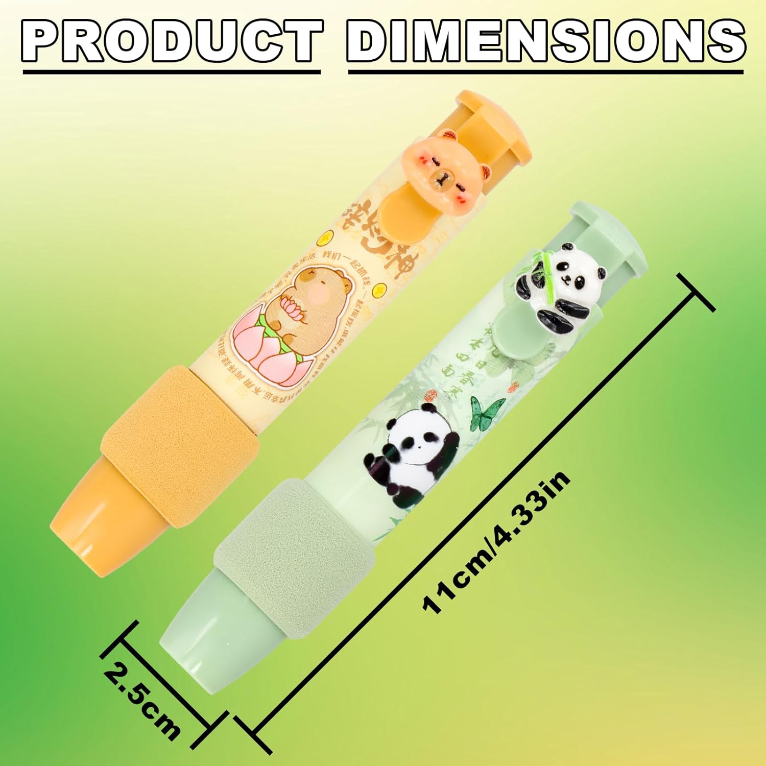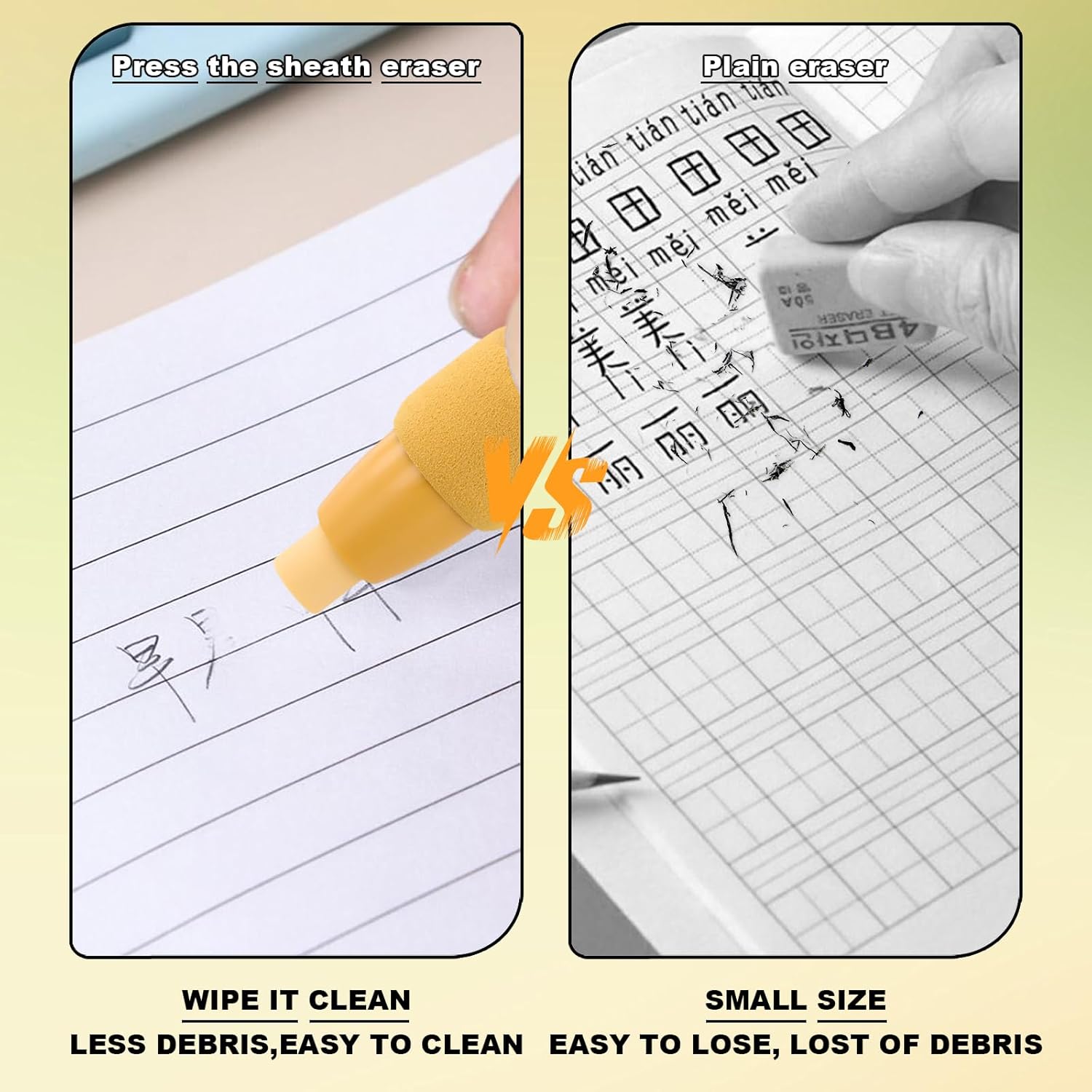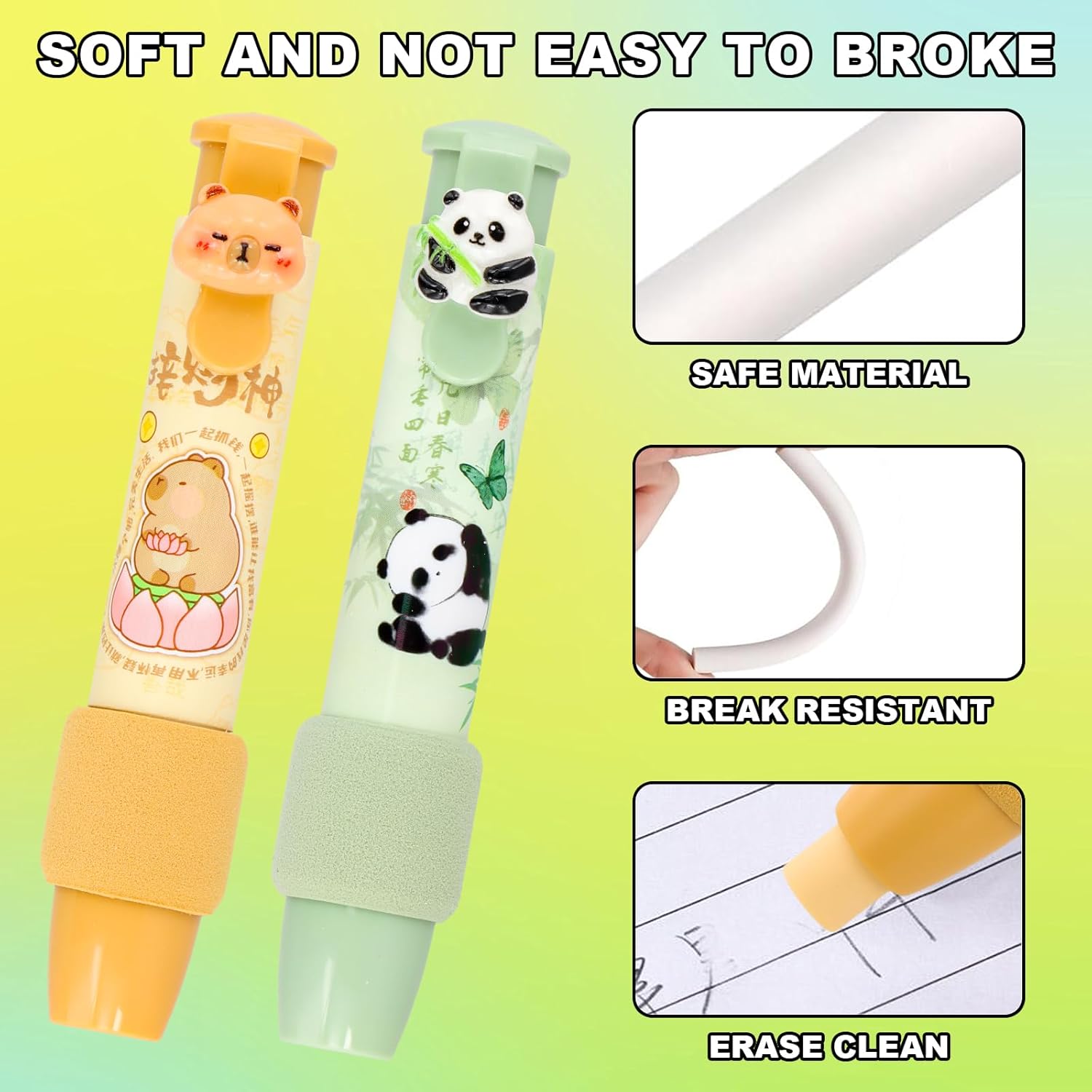 Design pratico e conveniente: il set da 4 pezzi di gomma a forma di penna retrattile ha 2 gusci di penna di colore diverso. Questo design rende più facile tenere traccia della gomma. Design e dimensioni retrattili: con un semplice clic, la gomma elettrica è pronta per l'uso e può essere regolata in base alle tue esigenze. Le dimensioni della penna e della gomma sono progettate per l'uso quotidiano e il trasporto. Lunghezza gusci penna: 110 mm; Lunghezza gomme: 80 mm Materiale e durata: la penna gomma è realizzata in plastica resistente, leggera e flessibile da usare. È perfetta per un uso prolungato e può resistere alle condizioni esterne. La gomma impastabile mantiene la sua qualità a lungo. Cancellazione efficace e precisione: la gomma retrattile funziona come una penna a scatto, offrendo un facile utilizzo e una cancellazione pulita. La piccola punta della gomma consente la rimozione precisa degli errori senza danneggiare la carta, rimuovendo efficacemente i segni di matita. Applicazioni e opzione regalo: la gomma per matita retrattile è adatta a vari ambienti, tra cui scuole, uffici e case. È un'eccellente opzione regalo per bambini, studenti e insegnanti.