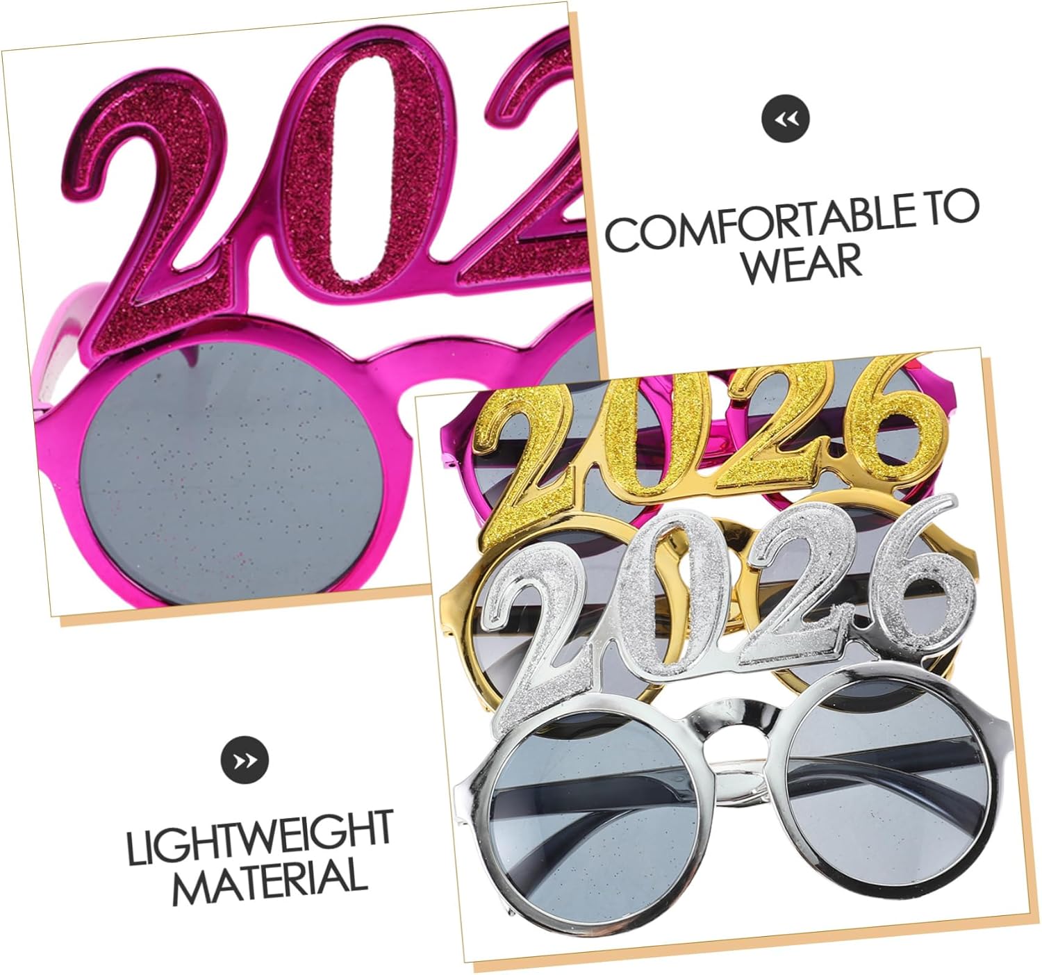 dei pacchetti 4 bicchieri di Capodanno Caratteristiche -Comfort leggero: realizzati con materiali leggeri, questi occhiali offrono una vestibilità comoda, perfetti da indossare durante tutta la festa di Capodanno. -Dimensioni: 14,50X14,00X10,50 cm/5,70X5,50X4,13 pollici Occhiali da sole per il capodanno 2026 -Design festivo: occhiali da capodanno 2026, occhiali da laurea 2026, occhiali con numeri glitterati, forniture per feste di capodanno, accessori di scena fantasiosi. Questi occhiali con numeri 2026 sono progettati per aggiungere un'atmosfera festosa e divertente alla tua festa di capodanno, rendendola più piacevole. -Colore: occhiali con numeri 2026 assortiti -Materiale: occhiali da sole originali in plastica - Foto in evidenza: distinguiti in ogni foto con questi occhiali divertenti e originali, assicurandoti di catturare e ricordare ogni momento della tua festa di Capodanno. -Portatili e condivisibili: facili da trasportare e condividere, questi occhiali rendono semplice per tutti unirsi all'entusiasmo del conto alla rovescia del nuovo anno. Informazioni sulle merci bomboniere per feste di laurea Sono perfetti per cabine fotografiche, bomboniere e per garantire che tutti si divertano. Occhiali da sole 2026 Con il loro design unico e la vestibilità comoda, questi occhiali sono ideali per aggiungere un tocco di divertimento al tuo evento. Occhiali da sole 2026 I nostri occhiali originali sono perfetti per qualsiasi occasione festiva, feste di Capodanno alle celebrazioni di laurea