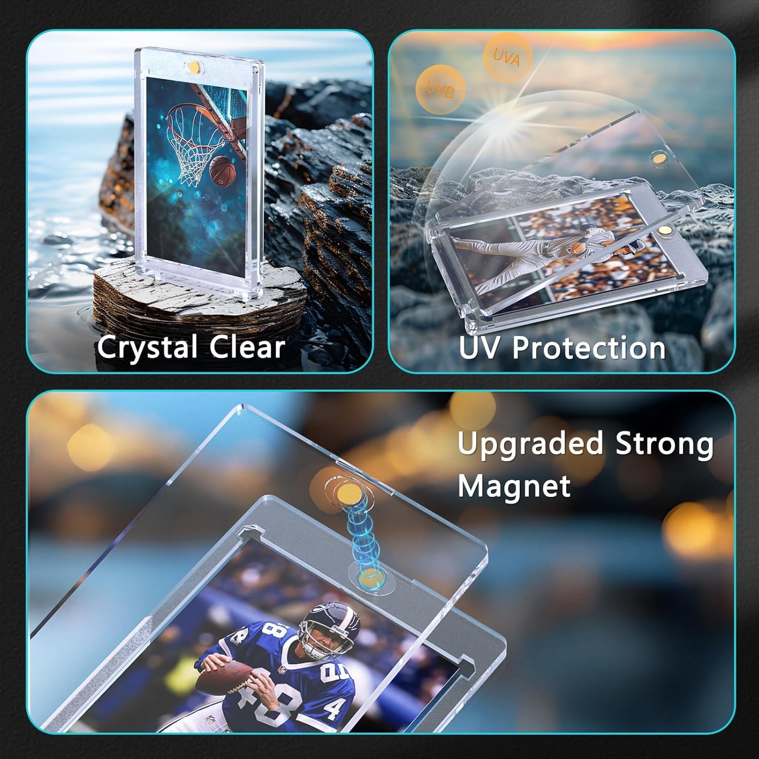 ✅【Porta Tessere Magnetico Pratico】Questo set include 4 porta tessere magnetico 35PT e 4 supporti per carte neri. perfetti per conservare e visualizzare carte da gioco o da collezione di dimensioni standard. ✅【Chiusura Magnetica Sicura】La parte superiore della custodia protettiva magnetica è dotata di una chiusura magnetica rotonda, che garantisce massima sicurezza e facilità di apertura e chiusura senza strumenti. La protezione 35PT protegge efficacemente da acqua, polvere, impronte digitali, pieghe e graffi. ✅【Protezione UV e Angoli Diamantati】La custodia protettiva è realizzata in polistirene (PS) con additivi di protezione UV per una maggiore durata. Gli angoli diamantati prevengono la piegatura dei bordi delle carte, mantenendole in perfette condizioni. ✅【Trasparenza Totale】Entrambi i lati della custodia magnetica sono trasparenti, permettendo di visualizzare i dettagli delle carte senza rimuoverle. Ideale per la scansione di codici a barre o QR, le informazioni sulle carte sono visibili a colpo d'occhio. ✅【Versatilità】Questi porta tessere magnetico 35PT sono perfetti per carte TCG, MTG, carte da collezione o carte sportive. Ideali come regali per bambini, premi per compiti o per collezionisti e giocatori che desiderano proteggere le loro carte preziose.