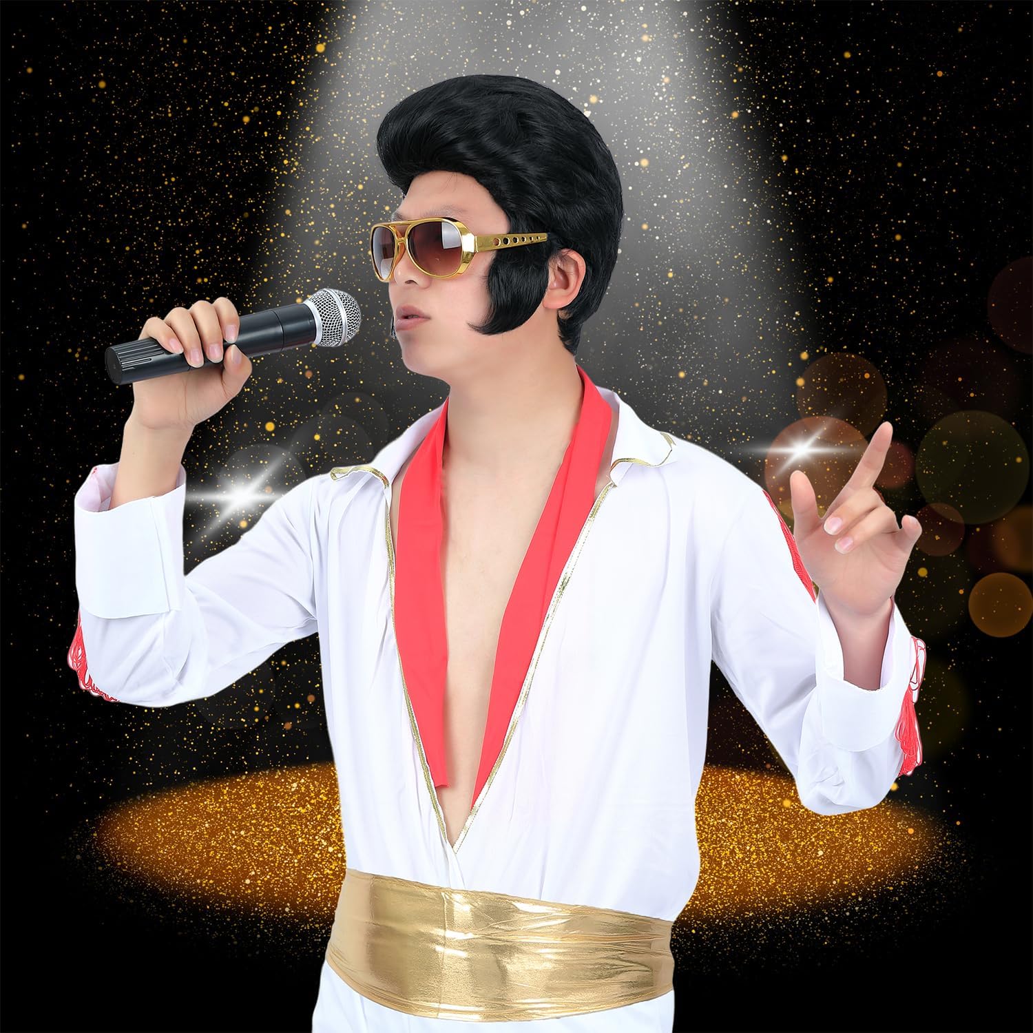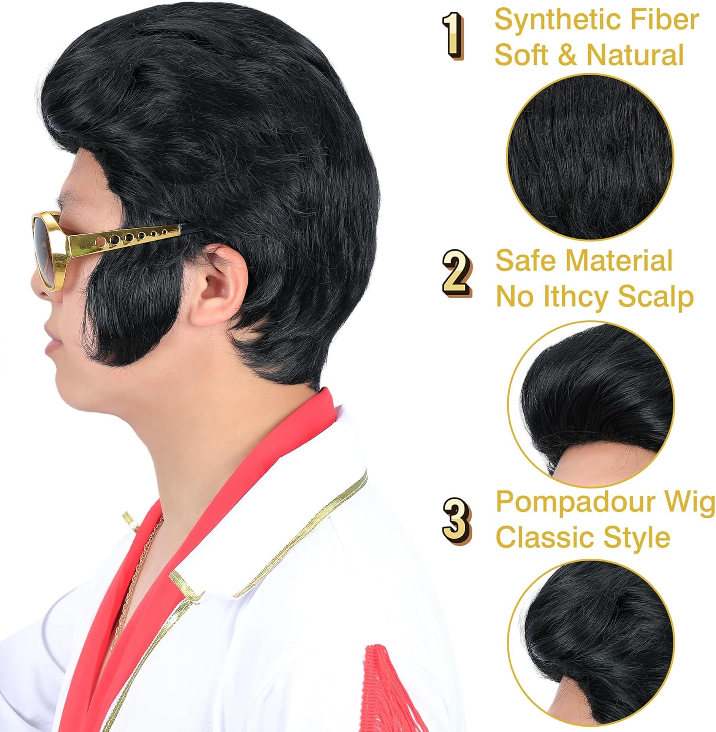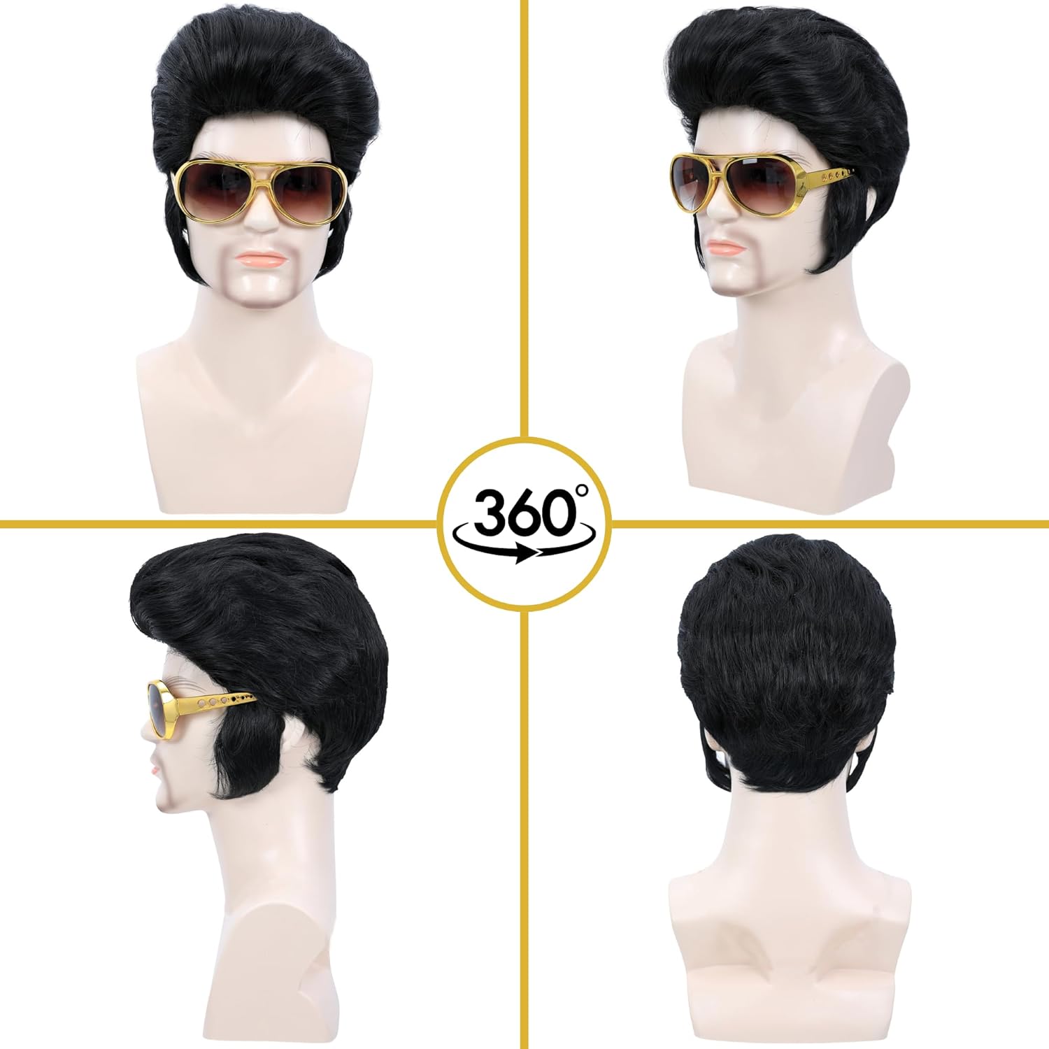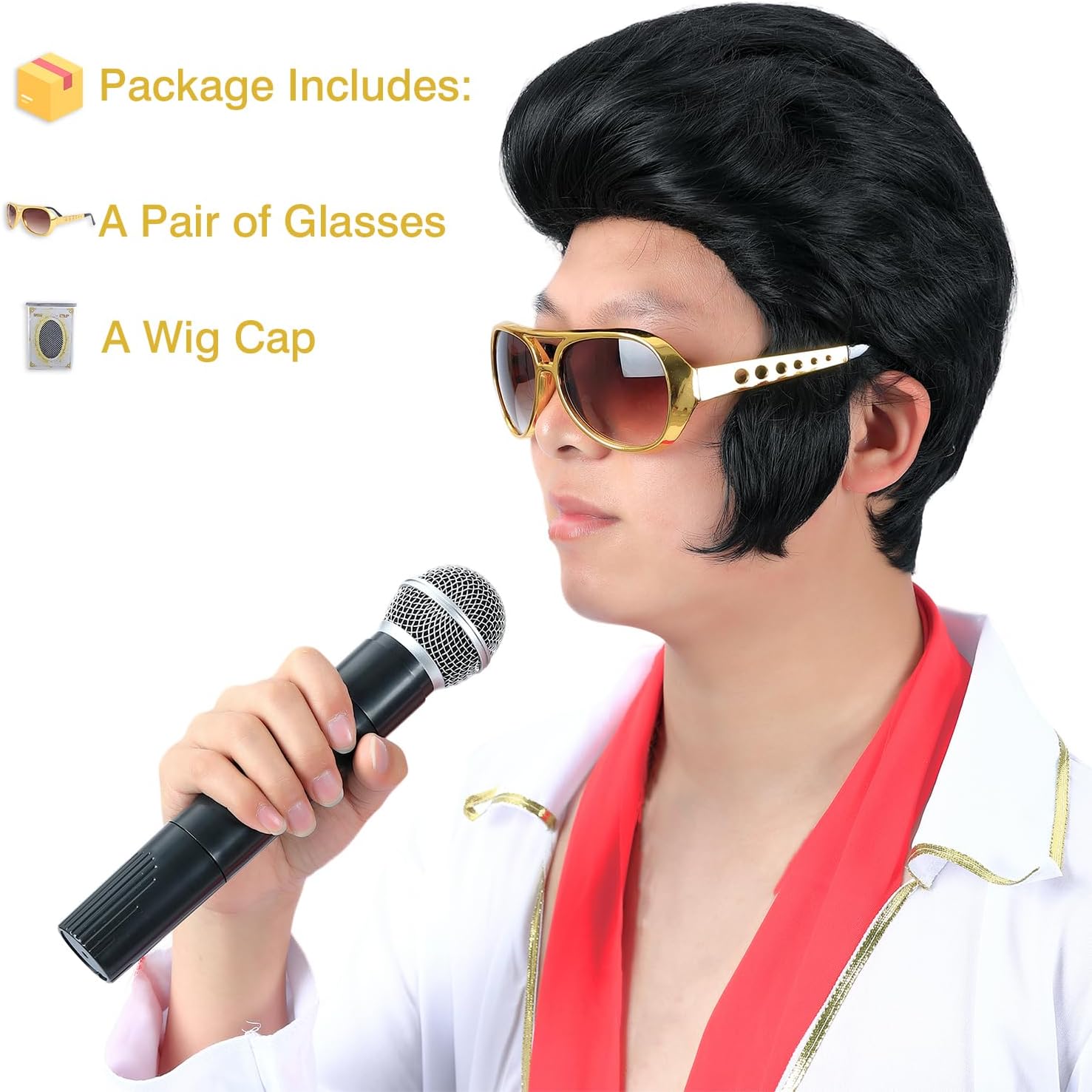 Marca: Amzcos Amzcos Set Da 4 Pezzi Parrucca Da Leggenda Rock Anni '50 E '60 Con Occhiali Da Sole E Collana Per Uomo Parrucca Per Costume Da Cantante Rock And Roll Per Halloween Party Cosplay Parrucca