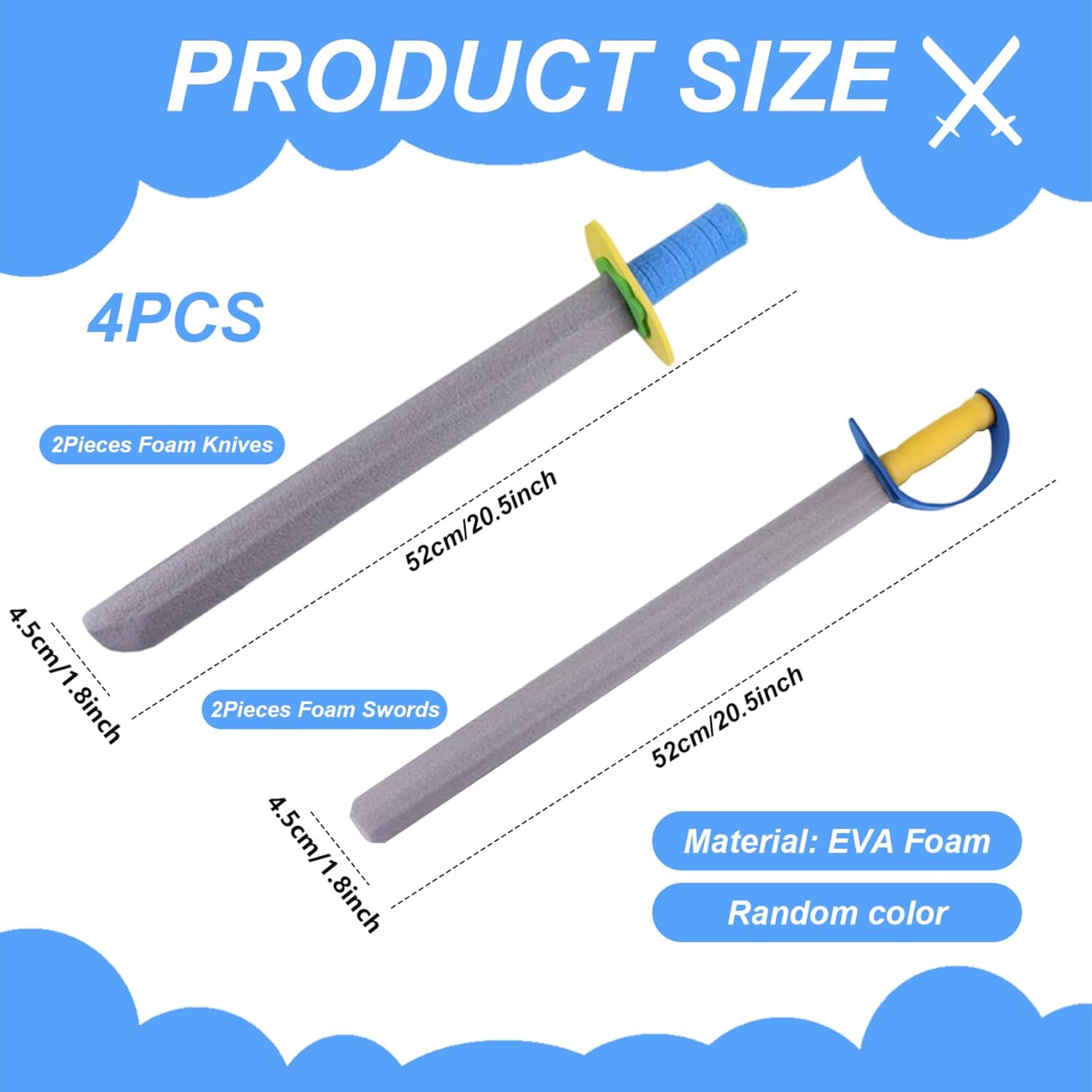 Autentico look da pirata: caratterizzate da colori vivaci e uno stile realistico con la spada da pirata, queste spade cosplay accendono l'immaginazione dei bambini, migliorando le esperienze di gioco di ruolo per feste in costume e giochi interattivi. Materiale in schiuma sicura: realizzate in schiuma EVA morbida e non tossica, queste spade in schiuma garantiscono un gioco delicato, rendendole perfette e sicure per neonati e bambini durante finte avventure di pirati e attività di festa. Facili da trasportare e riporre: compatte e leggere, queste spade in schiuma sono facili da portare con sé per eventi all'aperto, feste di compleanno o attività in classe, rendendo la pulizia e lo stoccaggio senza problemi. Valore confezione multipla: include 4 spade e coltelli in schiuma, ideali per giochi di gruppo e bomboniere, incoraggiando l'interazione sociale e il gioco cooperativo tra i bambini in vari contesti. Design leggero: progettati per essere leggeri ma robusti, queste spade e coltelli in schiuma resistono a giochi vigorosi e spettacoli all'asilo senza usura, offrendo un divertimento duraturo.
