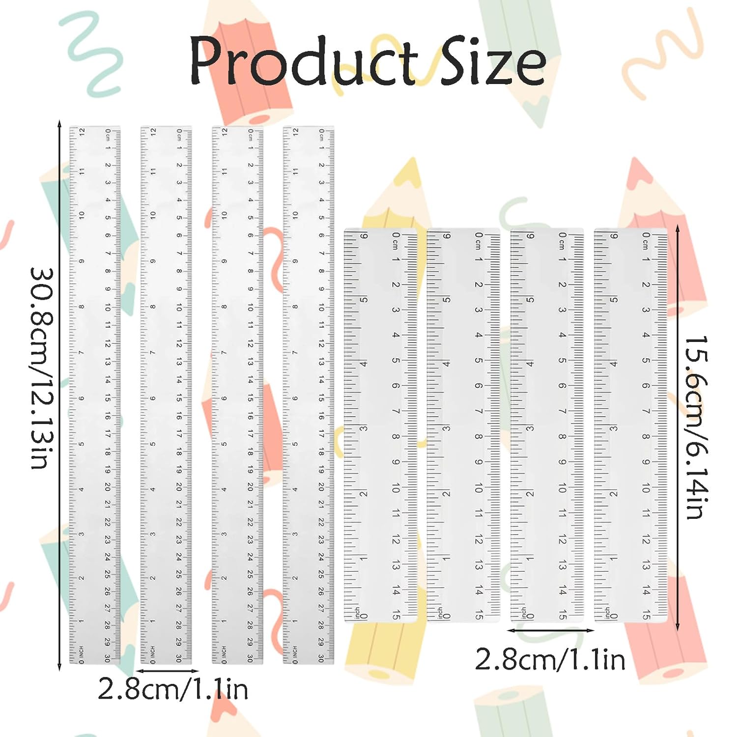 MATERIALE RESISTENTE Il righello da 30 cm e il righello da 15 cm Realizzato in materiali flessibili e infrangibili, durevoli e resistenti. I righelli mantengono la loro forma e sono facili da maneggiare senza rompersi o piegarsi Riceverete 8 righelli, 4 righelli da 30,8 cm e 4 righelli da 15,6 cm, con scale in centimetri e pollici contrassegnati per un facile utilizzo Scala chiara: il righello da 30 cm e il righello da 15 cm di scala in centimetri sui righelli facilitano la lettura accurata. Ideale per compiti matematici, disegni tecnici e progetti creativi a scuola o in ufficio Facile da usare: il righello da 15 cm per la scuola elementare e i righelli da 30 cm sottili e leggeri si adattano facilmente ad astucci, zaini o borse. Perfetto per l'uso quotidiano a scuola elementare, scuola secondaria o sul posto di lavoro Ampia applicazione: il set di righelli da 30 cm e righello da 15 cm è versatile per diversi progetti e attività. Ideale per studenti, insegnanti, architetti e chiunque abbia bisogno di misurazioni precise