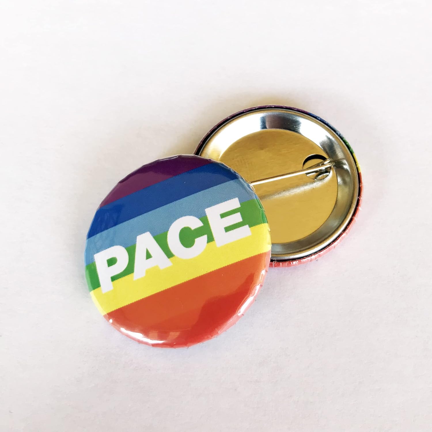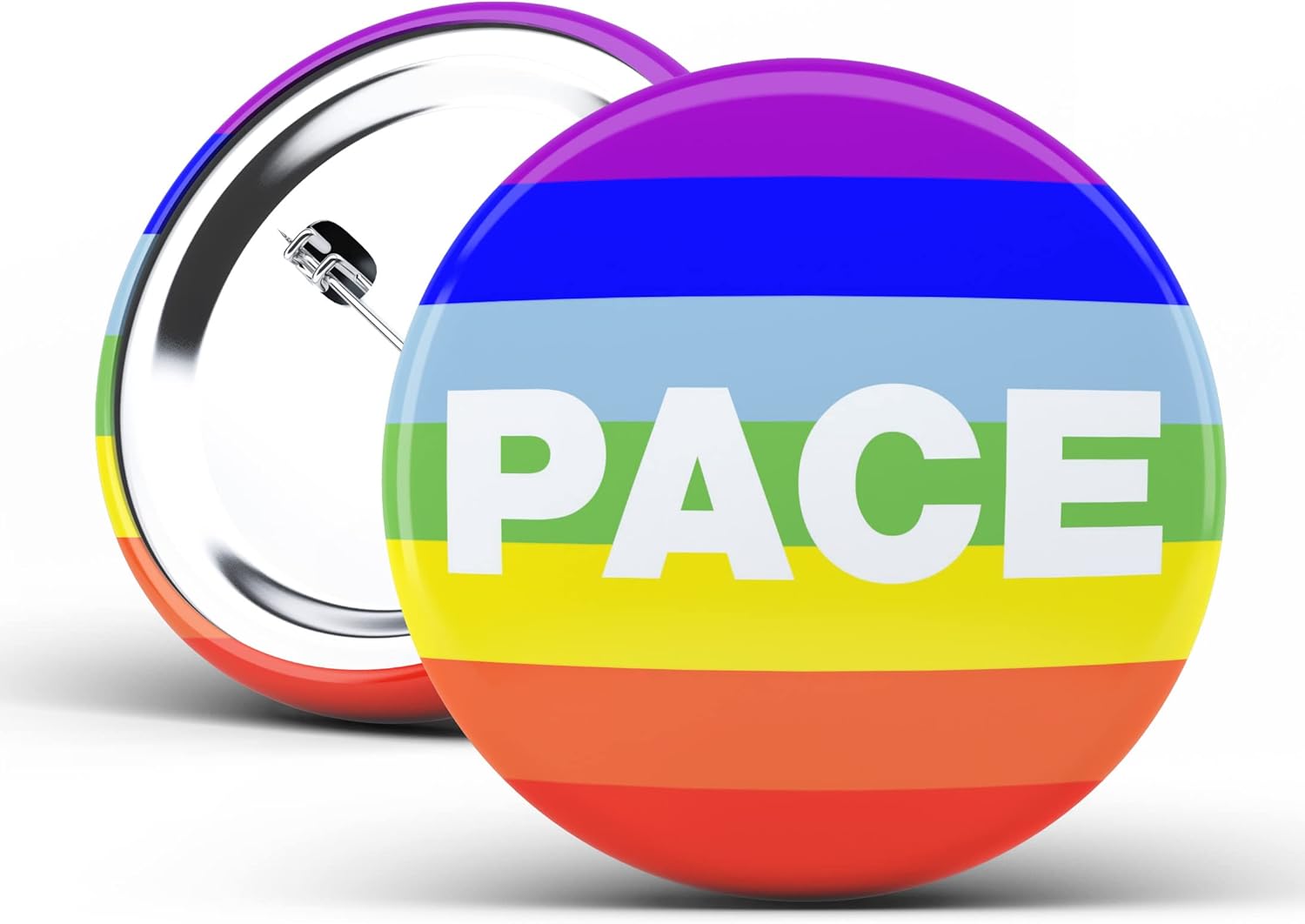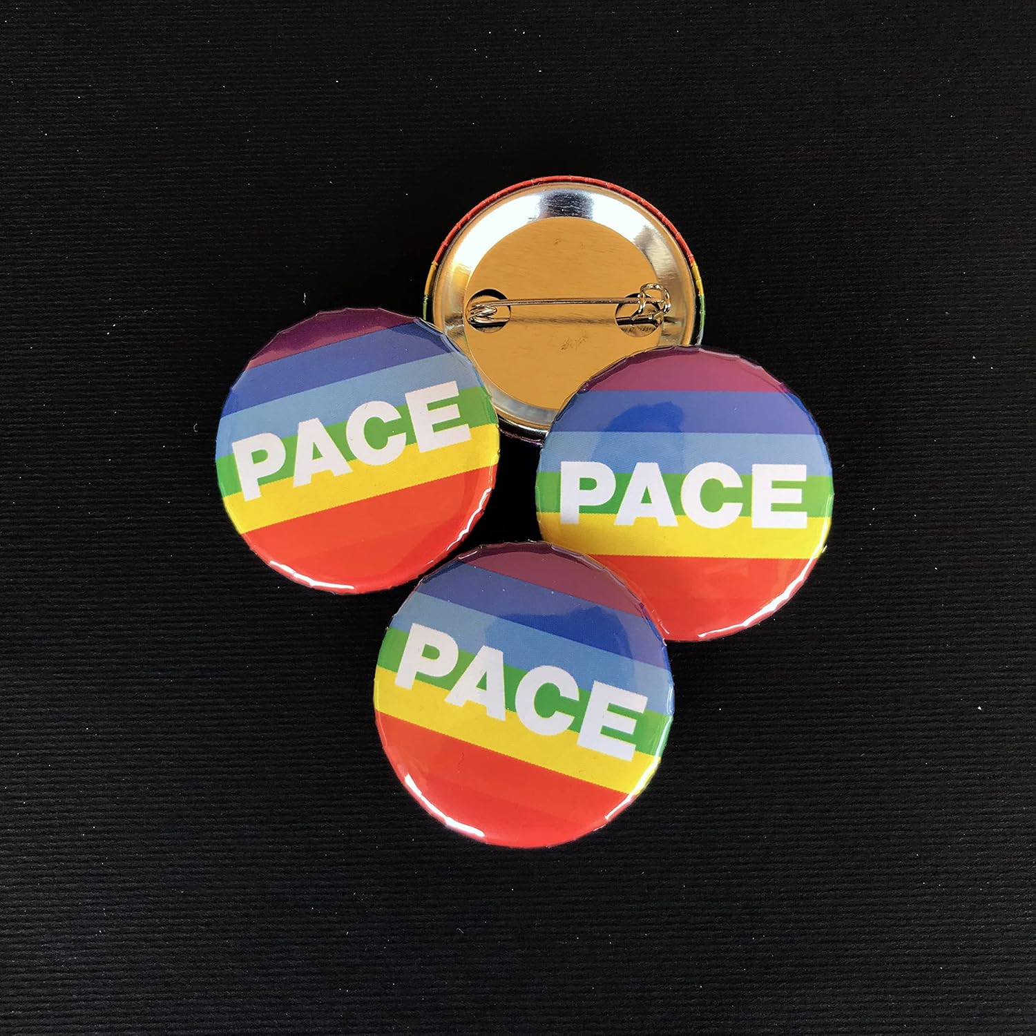 4 Spillette rotonde con bandiera arcobaleno della pace. Struttura interamente metallica e finitura trasparente lucida. Dimensione di ogni singola spilla: ø35mm
