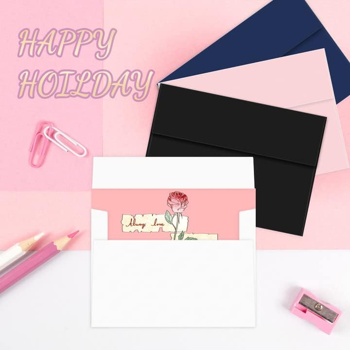 Un set di 50 buste formato A6 da 12,1 x 16,5 cm. Tutte le buste 4 x 6 sono realizzate in carta da 120 g/m². Spesso e invisibile. Decora le buste con quello che ti piace. Compatibile con la stampante. Design autosigillante, facile da sigillare e sbucciare. Le buste colorate sono ideali per inviti, documenti, foto, documenti, inviti di nozze, compleanni, baby shower.