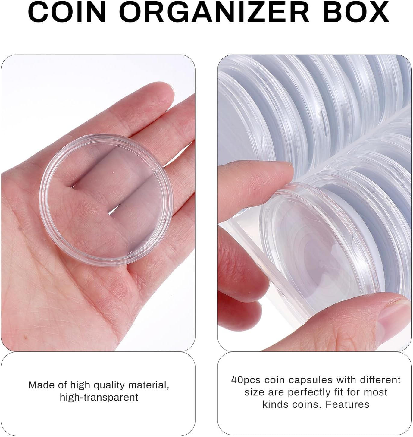 Forniture per la collezione di monete: ogni porta capsule per monete ha una piccola parte di scanalatura nel bordo esterno, puoi aprire i porta capsule per monete facilmente e comodamente con la mano, tubi di stoccaggio trasparenti Comoda scatola portaoggetti: è inclusa una scatola portaoggetti dedicata per tenere tutte le capsule organizzate e facilmente accessibili, perfetta sia per l'esposizione che per il viaggio, portamonete, portamonete per collezionisti Diverse opzioni di dimensioni: questo set presenta una gamma di sei dimensioni per adattarsi a vari diametri di monete, garantendo una vestibilità aderente per le tue monete preziose, contenitore per monete, porta monete protettivo Capsule per la conservazione delle monete: un regalo fantastico per i collezionisti di monete per conservare e proteggere le loro monete preferite, capsule per la collezione di monete Design a scatto facile: ogni supporto si aggancia saldamente, garantendo una vestibilità sicura e consentendo al contempo una chiara visibilità delle monete, del contenitore per capsule di monete, dei portamonete