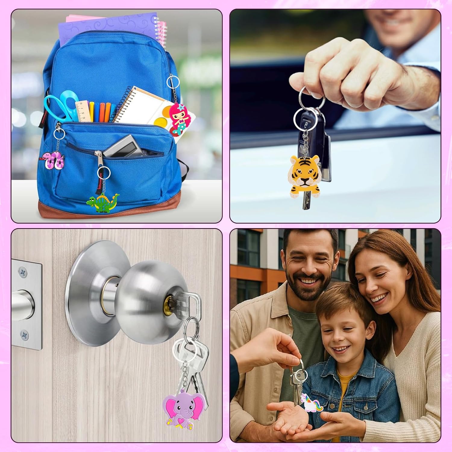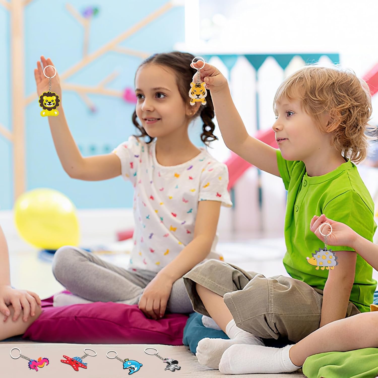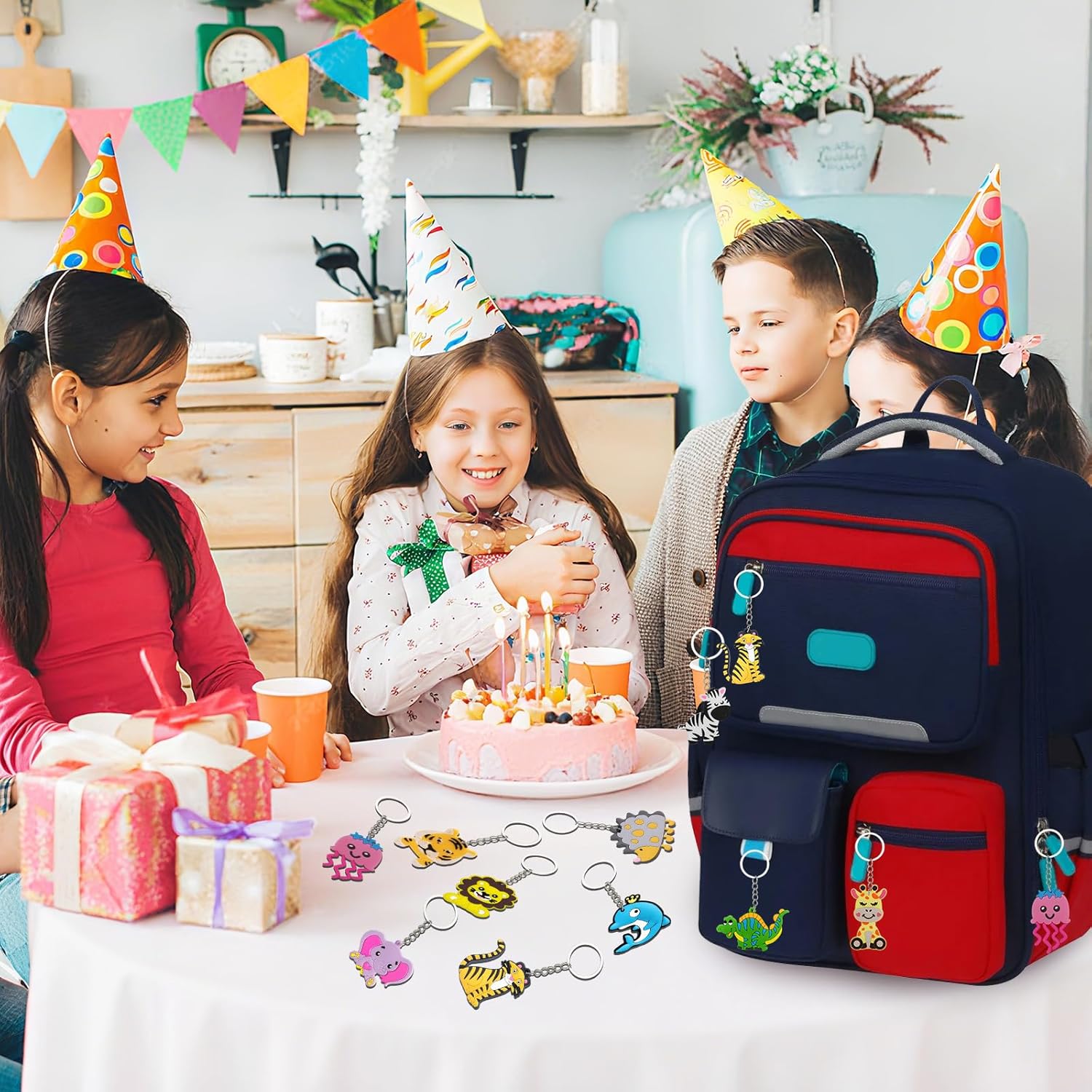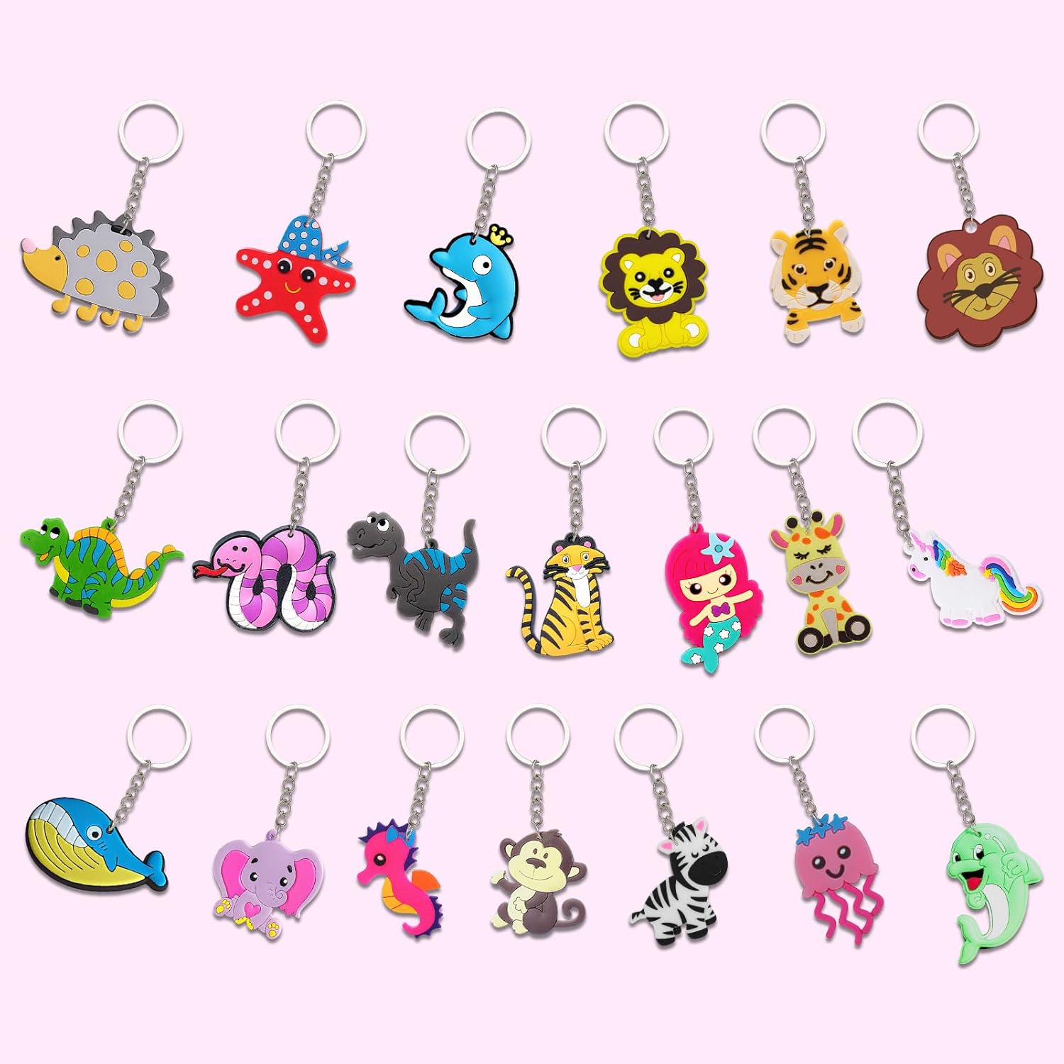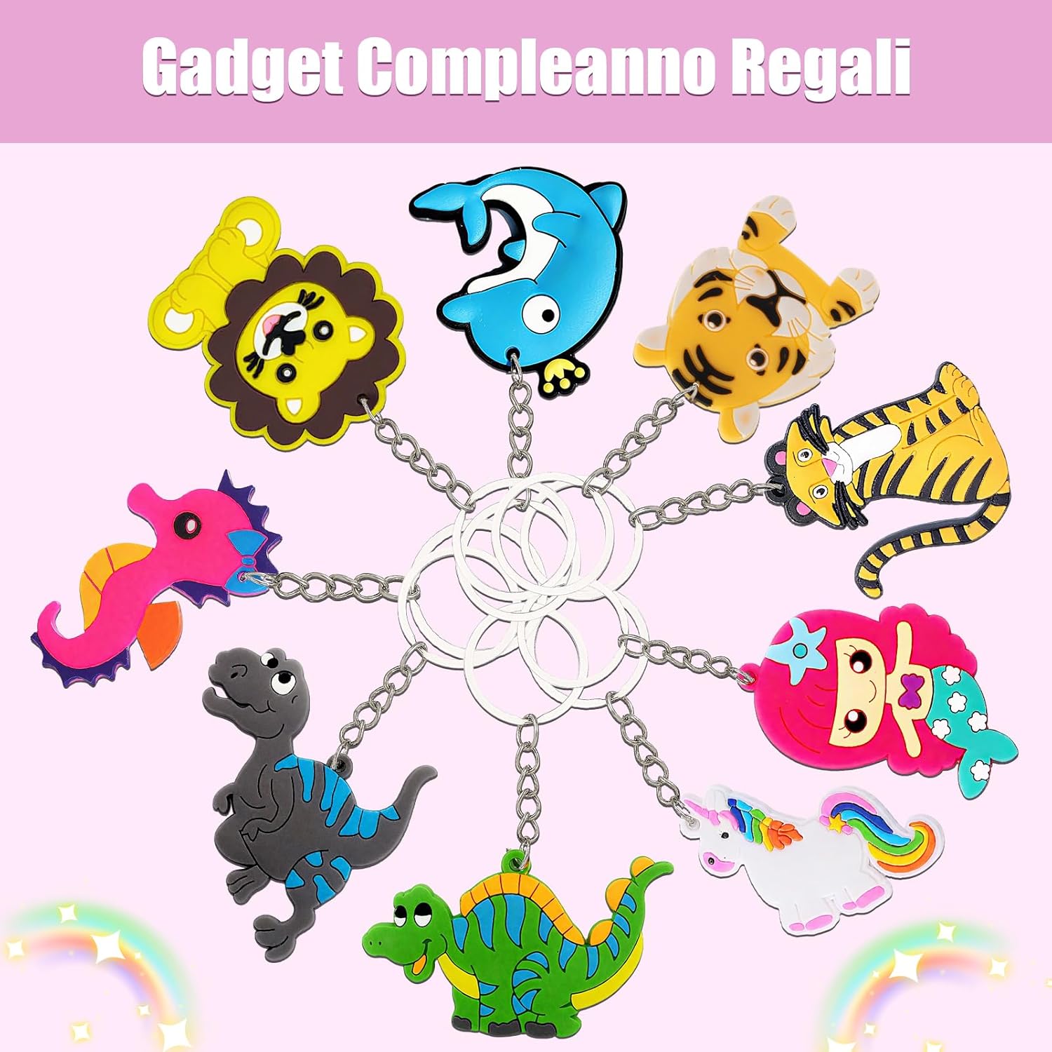 Regalini Fine Festa Compleanno - 40 portachiavi di animali diversi, dinosauri, unicorni, zebre, leoni, elefanti, api, scimmie, giraffe, cuccioli, squali neonati e altri portachiavi con motivi di cartoni animati, decora le tue borse, chiavi, auto o agganciali o appendili ovunque tu voglia Regalino Perfetto per le Feste: Con 40 pezzi, questi portachiavi sono ideali come regalini per i bambini da distribuire durante feste di compleanno, o come bomboniere per eventi speciali Materiale Sicuro e Resistente: Realizzati in silicone di alta qualità, i portachiavi sono morbidi, resistenti e sicuri per i bambini, senza pericoli di rottura o di materiali tossici Ideali per Riempire i Sacchetti Regalo: Questi simpatici gadget sono perfetti come riempitivi per sacchetti regalo, Adatti per essere utilizzati come regali di compleanno per bambini, giocattoli di peluche per pignatte, giocattoli per feste di Natale, regali per feste di compleanno per bambini, regali di Halloween, riempitivi per uova di Pasqua, giocattoli per scatole del tesoro, premi scolastici, ecc Stimolano la Creatività e l’Immaginazione: Regalini fine festa compleanno I portachiavi, grazie ai loro design ispirati ai cartoni animati, possono diventare un elemento di gioco, stimolando la fantasia dei bambini mentre decorano i loro zaini o borse