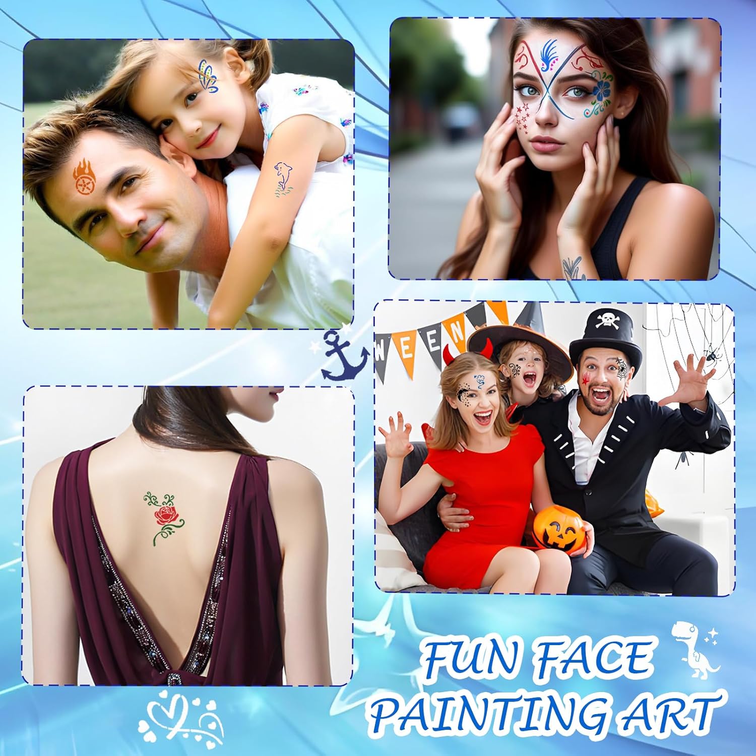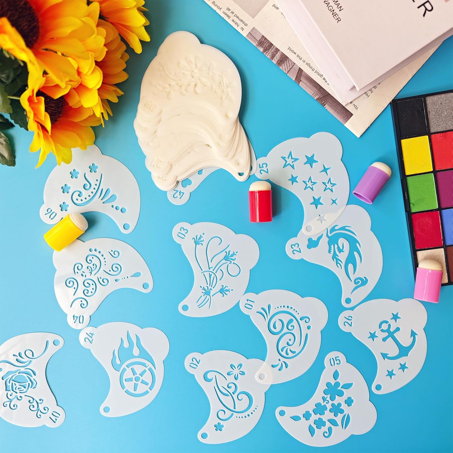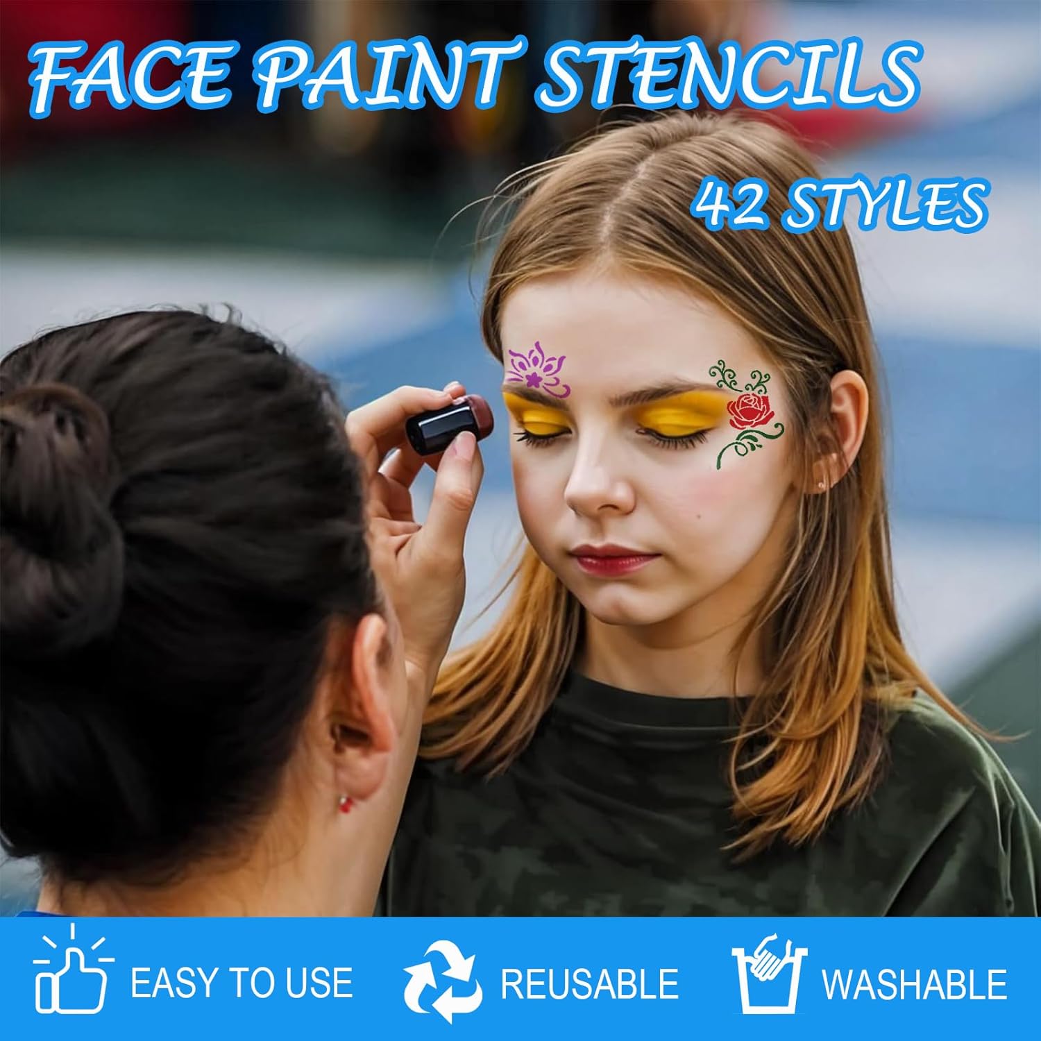 【Stencil per Trucco】Riceverai 42 stencil per il trucco degli occhi da 7,5x7cm con una varietà di disegni, tra cui fiori, stelle, ragni, dinosauri, delfini, fiamme, ecc. 【Include 4 Spugnette da Dito】Questo set include 4 spugnette colorate per le dita, che rendono il face painting più facile e ordinato, anche per i principianti! Goditi un'applicazione uniforme e disegni vivaci con il minimo sforzo. 【Stencil Riutilizzabili e Resistenti】Realizzati in plastica PET di alta qualità, questi stencil flessibili e dai bordi lisci garantiscono un uso sicuro e confortevole per bambini e adulti. Lavabili e riutilizzabili per un divertimento creativo a lungo termine. 【Perfetti per Ogni Occasione】Ideali per Halloween, feste di compleanno, attività scolastiche, cosplay, carnevale e lavoretti. Utilizzabili anche su carta, legno, vetro, pareti e in progetti artigianali per decorazioni originali. 【Trucco per il Viso Divertente】Un set perfetto per bambini, artisti, amanti del trucco e del fai-da-te. Un'aggiunta entusiasmante a qualsiasi kit di face painting o di trucco per feste!