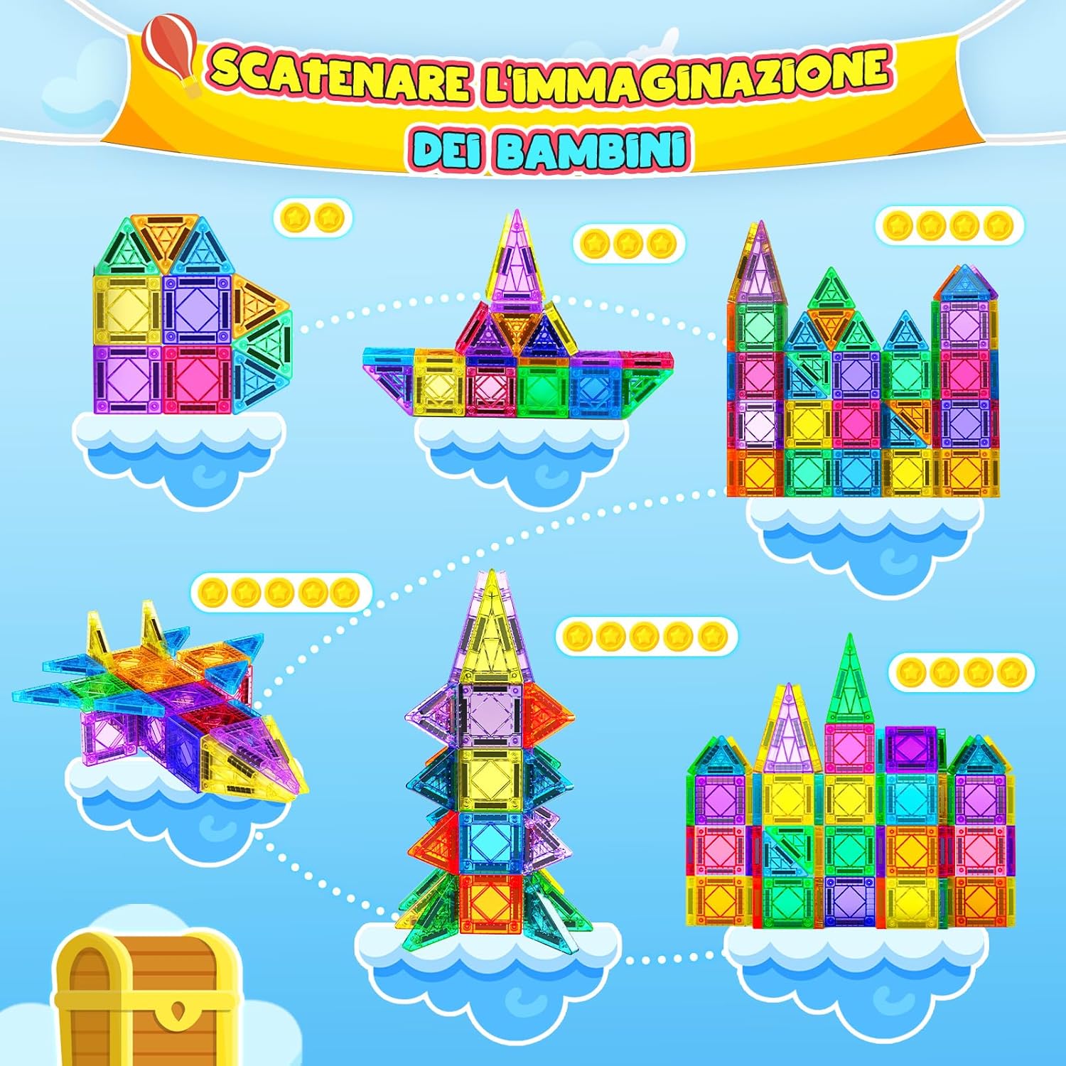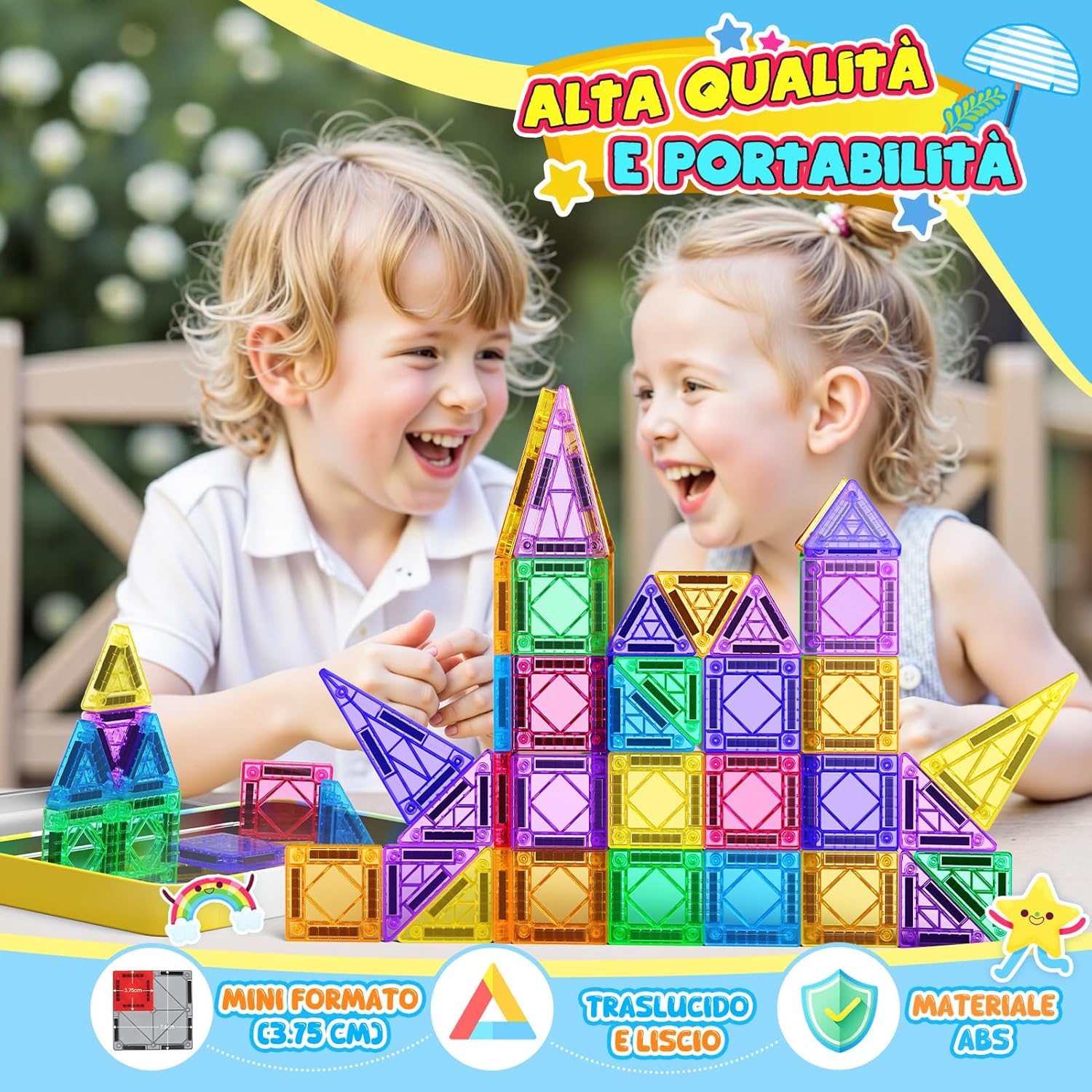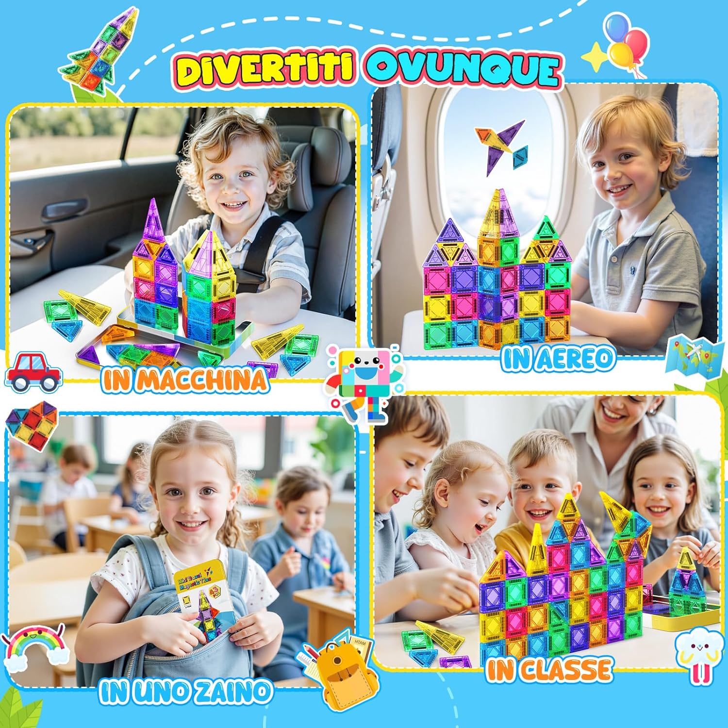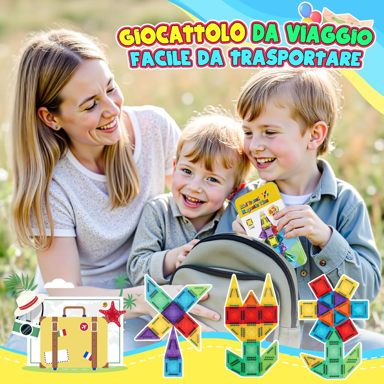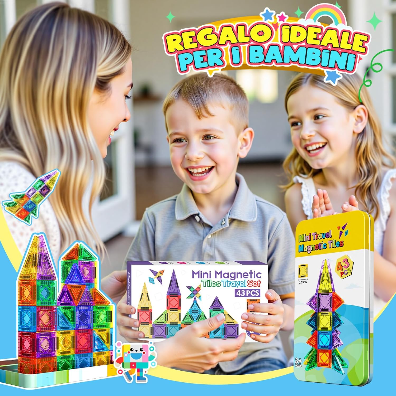SET DA VIAGGIO CON MINI PIASTRELLE MAGNETICHE: Contiene 43 tessere magnetiche (il maggior numero di mini tessere magnetiche sul mercato), oltre a una scatola di latta e un foglio di carta per conservarle. Il peso totale è di soli 450 g, più leggero di una bottiglietta di acqua minerale, e la scatola è spessa 2.2 cm e larga 12 cm, il che la rende leggera e portatile. DESIGN PORTATILE INNOVATIVO: Addio al peso ingombrante delle calamite tradizionali! Dimensioni ridotte e design leggero, facile da trasportare per i bambini. La speciale scatola di metallo è sia un contenitore che una piattaforma creativa per treni ad alta velocità/aerei/auto/aule... Gioca quando e dove vuoi. COMPATIBILE TOTALMENTE: Perfettamente compatibile con i fogli magnetici di grandi dimensioni più diffusi sul mercato! Il pezzo quadrato è 1/4 delle dimensioni del foglio grande, le forme colorate e ricche possono essere combinate con i fogli magnetici esistenti per ispirare la creatività infinita del tuo bambino e creare forme più interessanti. SICUREZZA E QUALITÀ PREMIUM: Realizzato in plastica ABS atossica, la superficie è liscia e priva di sbavature, e gli angoli arrotondati non feriranno le mani. Il processo di saldatura a ultrasuoni è adottato per la connessione magnetica, che è solida e anti-dislocamento, eliminando il rischio di ingestione accidentale. REGALO A SORPRESA PER I TUOI BAMBINI: I giocattoli educativi più popolari di quest'anno! Coltiva le capacità di pensiero logico/percezione dei colori/abilità pratiche di tuo figlio. È il regalo di prima scelta per il compleanno dei bambini, Natale, Halloween e Pasqua.