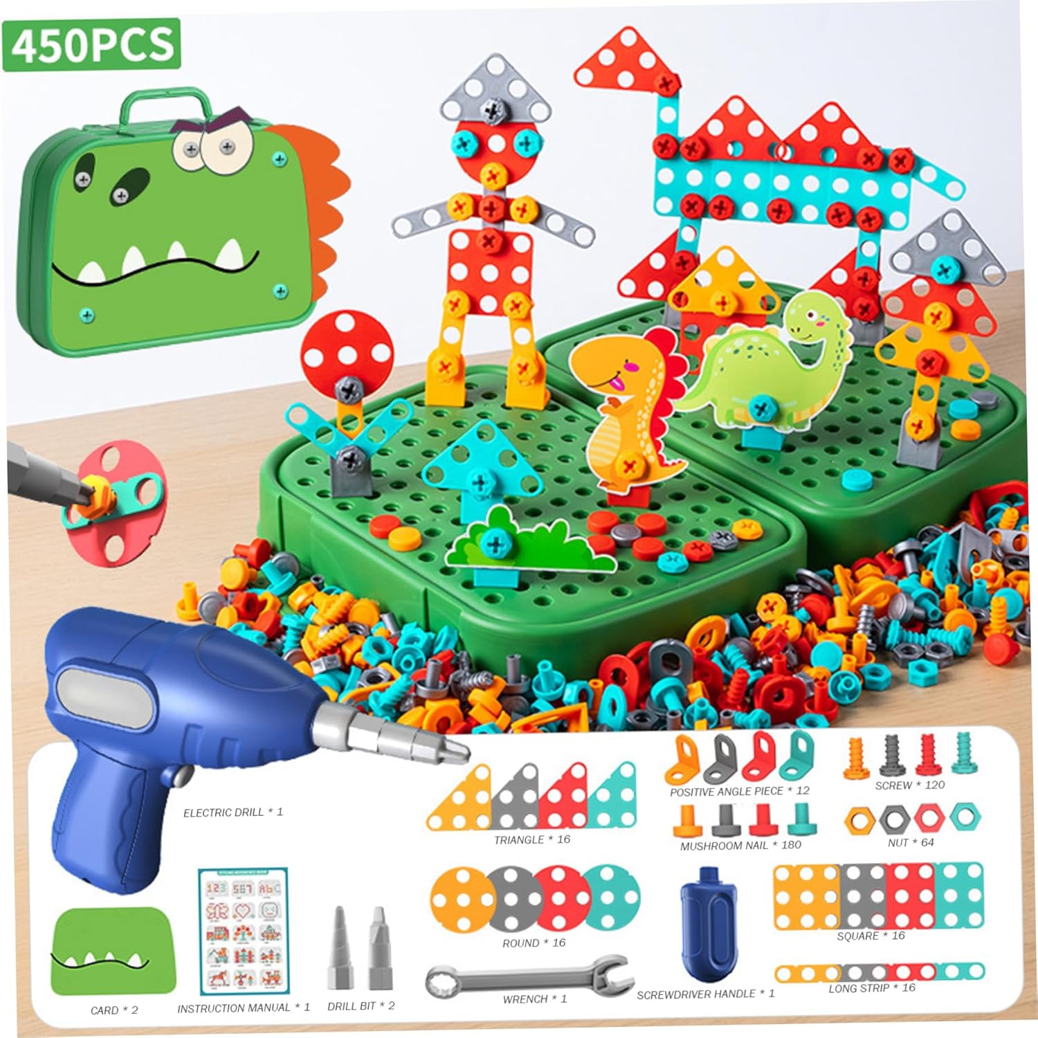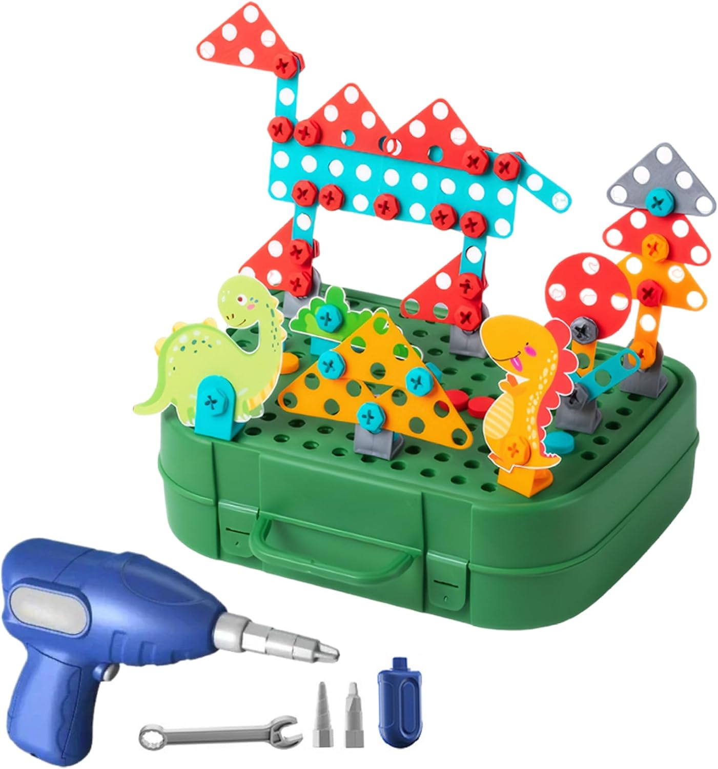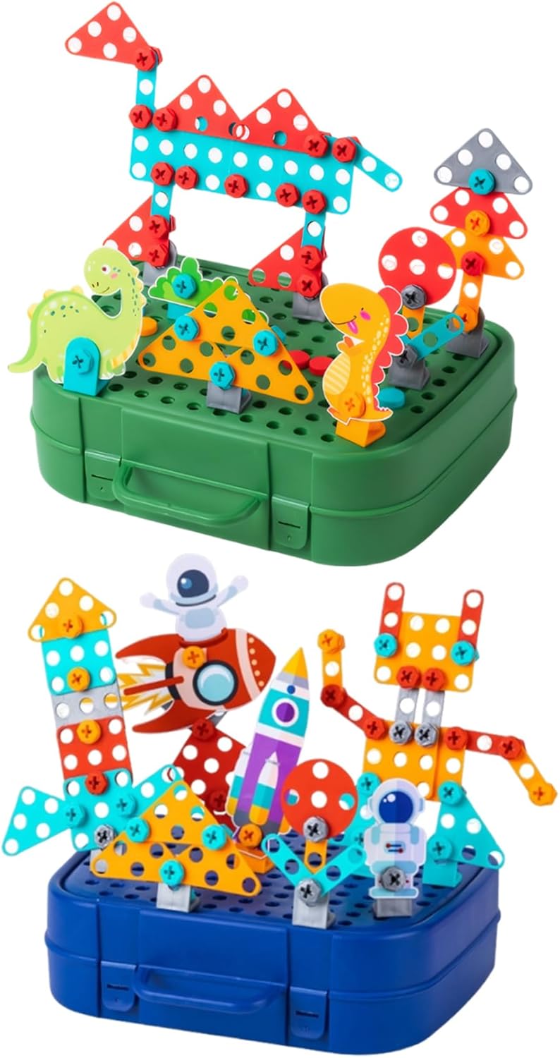 Sviluppa abilità logiche: il set di mosaico con trapano è perfetto per aiutare il tuo piccolo ingegnere a fare un salto nelle abilità logiche!.Ogni set di trapani e viti per bambini massimizza la consapevolezza spaziale, la risoluzione dei problemi logici, la visualizzazione e la pianificazione, le capacità motorie e centinaia di altre abilità cognitive di base attraverso la costruzione di giocattoli! Cassetta degli attrezzi magica per bambini: il set di trapani per bambini include un cacciavite giocattolo, una chiave inglese divertente e un trapano elettrico realistico!.Guarda come crescono in sicurezza, imparando ad allacciare, smontare e completare compiti utili da soli!.Adatto a bambini dai 3 ai 10 anni. Perfetto per i bambini: stai cercando qualcosa di emozionante?.Se è così, adorerai questa cassetta degli attrezzi creativa..Questo giocattolo può portare molto divertimento ai bambini ed è una vacanza squisita per Natale, Halloween, Ringraziamento, compleanni e altro ancora! Materiali affidabili: il nostro set di punte per mosaico Creativity è realizzato in plastica ABS di lunga durata con bordi lucidi..Il trapano giocattolo è alimentato da batterie AA (non incluse), a bassa velocità, garantendo l'assenza di danni ai bambini. Set di puzzle dal design creativo a mosaico: il set di punte e viti da 450 pezzi combina educazione e intrattenimento, consentendo ai bambini di esplorare i principi dell'ingegneria edile mentre giocano..Usa il trapano elettrico e il cacciavite per progettare e costruire i tuoi modelli fantasiosi combinando vite e dado.