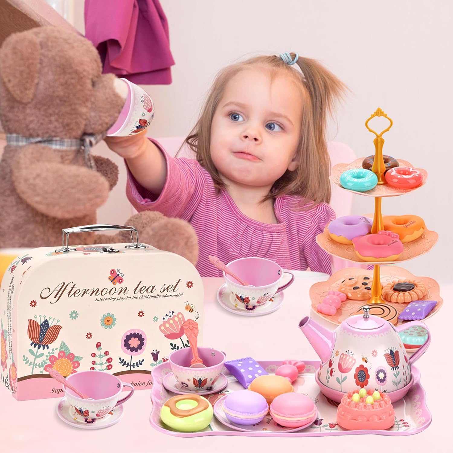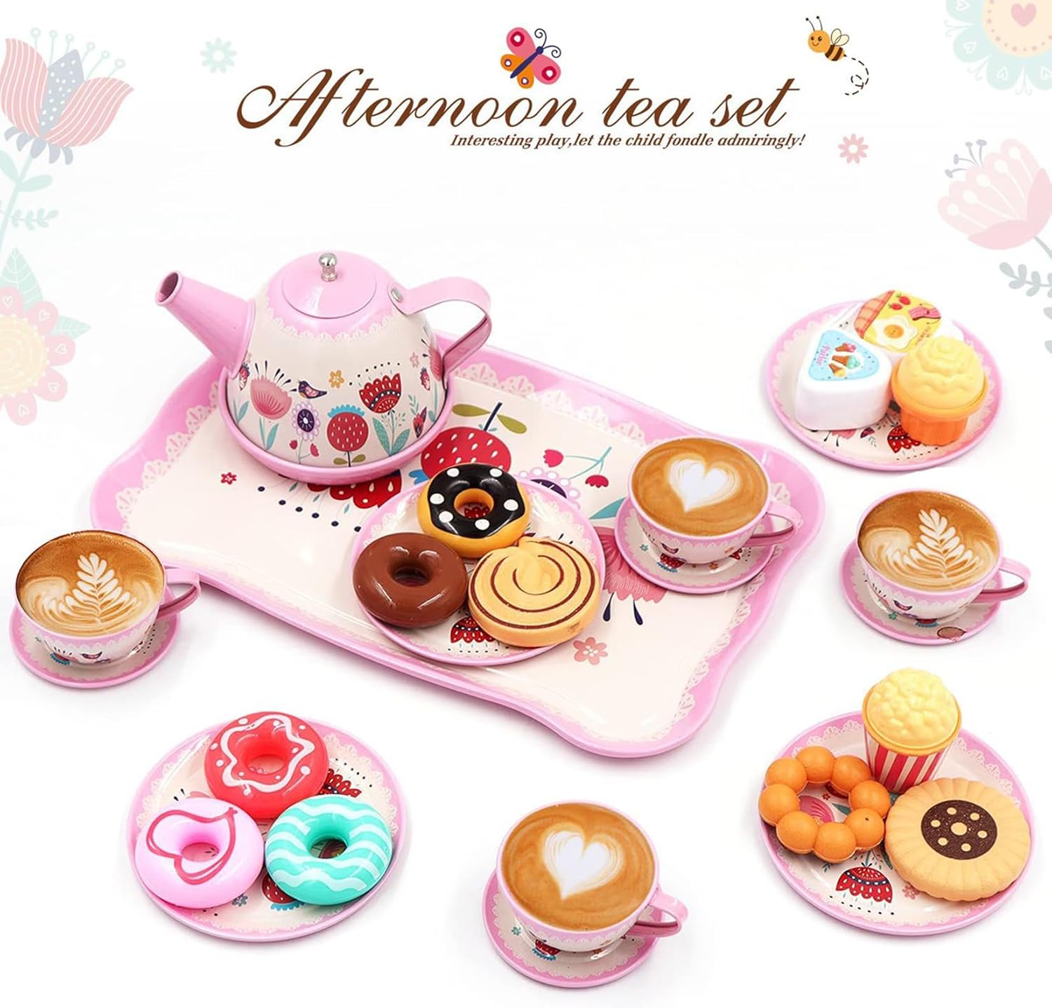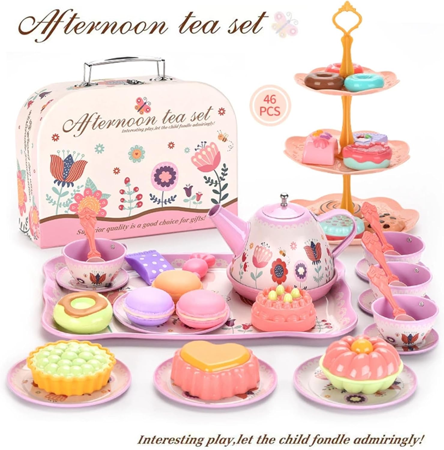 【Set da tè per bambini 46 pezzi】Il set da tè per bambini include 1 teiera in latta, 4 tazze da tè in latta, 4 sottobicchieri in latta, 4 piattini in latta, 4 cucchiaini, 1 alzata a 3 piani, 1 vassoio in latta, 1 scatola portaoggetti, 26 giocattoli alimentari, biscotti, ciambelle, torte, caramelle, ecc 【Sicuro e resistente】Questo set, realizzato in materiale di alta qualità e stagno, è adatto all'uso da parte dei bambini. L'apertura liscia della tazza e il manico tradizionale sul coperchio lo rendono facile da trasportare e da usare. Inoltre, tutte le parti possono essere pulite facilmente con un panno umido 【Giocattolo portatile per tea party】Viene fornito con una graziosa scatola rosa con manico per riporlo facilmente, il cui peso leggero consente al bambino di portarlo ovunque, un imminente tea party pomeridiano nelle mani dei vostri bambini con questo set da tè portatile 【Tea party perfetto】Servizio da tè per bambini include anche una teiera con coperchio rimovibile, che può essere riempita e versata con acqua, offrendo ai bambini un'esperienza di gioco più realistica! Lascia che il tuo bambino socializzi e comunichi con amici e familiari 【Ottimo regalo per i bambini】Grazioso e divertente servizio da tè è un ottimo ricordo per i vostri bambini ed è stato progettato per offrire fantasia e divertimento senza fine, per compleanni, Natale, Ringraziamento, Pasqua, ecc