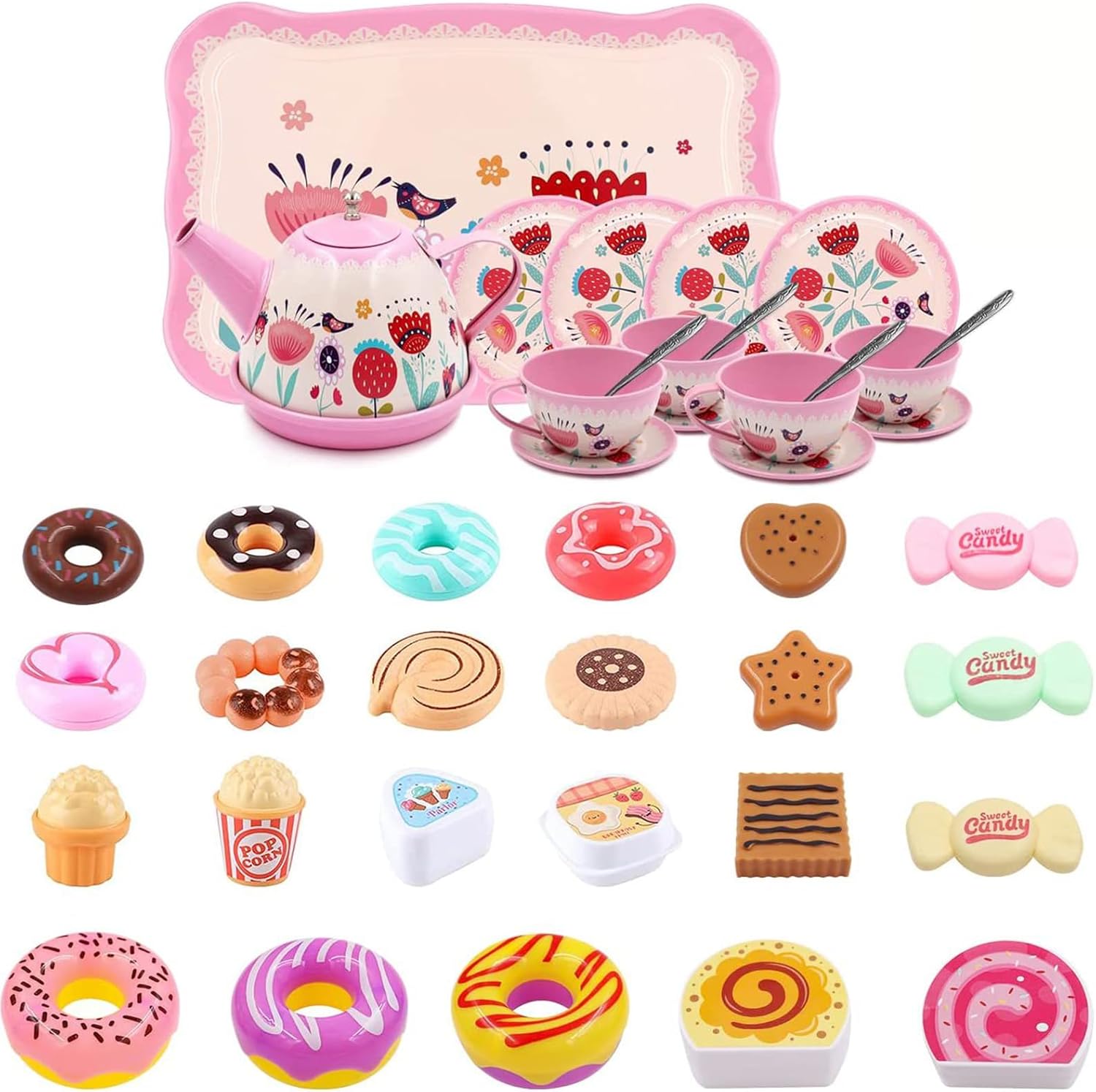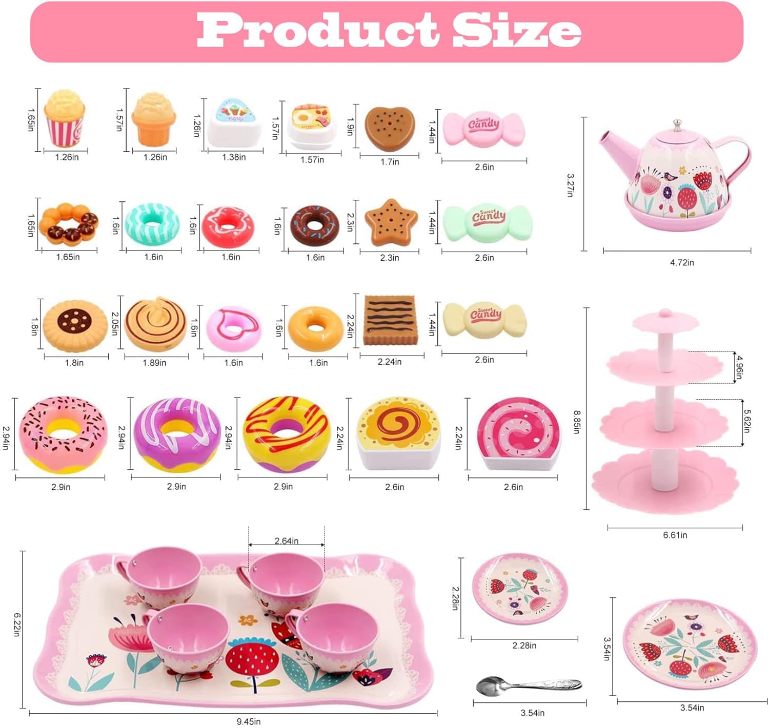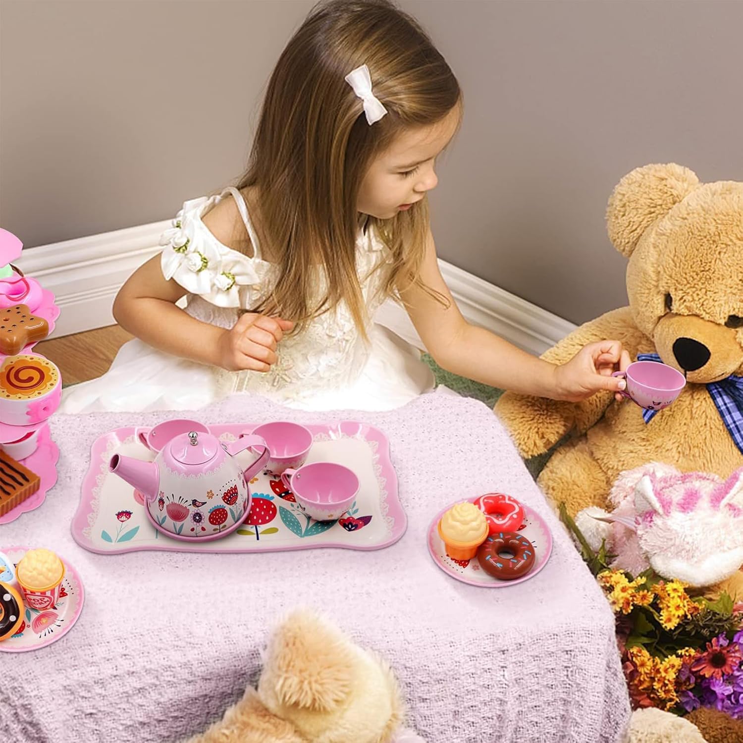 【Set da tè per bambini 46 pezzi】Il set da tè per bambini include 1 teiera in latta, 4 tazze da tè in latta, 4 sottobicchieri in latta, 4 piattini in latta, 4 cucchiaini, 1 alzata a 3 piani, 1 vassoio in latta, 1 scatola portaoggetti, 26 giocattoli alimentari, biscotti, ciambelle, torte, caramelle, ecc 【Sicuro e resistente】Questo set, realizzato in materiale di alta qualità e stagno, è adatto all'uso da parte dei bambini. L'apertura liscia della tazza e il manico tradizionale sul coperchio lo rendono facile da trasportare e da usare. Inoltre, tutte le parti possono essere pulite facilmente con un panno umido 【Giocattolo portatile per tea party】Viene fornito con una graziosa scatola rosa con manico per riporlo facilmente, il cui peso leggero consente al bambino di portarlo ovunque, un imminente tea party pomeridiano nelle mani dei vostri bambini con questo set da tè portatile 【Tea party perfetto】Servizio da tè per bambini include anche una teiera con coperchio rimovibile, che può essere riempita e versata con acqua, offrendo ai bambini un'esperienza di gioco più realistica! Lascia che il tuo bambino socializzi e comunichi con amici e familiari 【Ottimo regalo per i bambini】Grazioso e divertente servizio da tè è un ottimo ricordo per i vostri bambini ed è stato progettato per offrire fantasia e divertimento senza fine, per compleanni, Natale, Ringraziamento, Pasqua, ecc