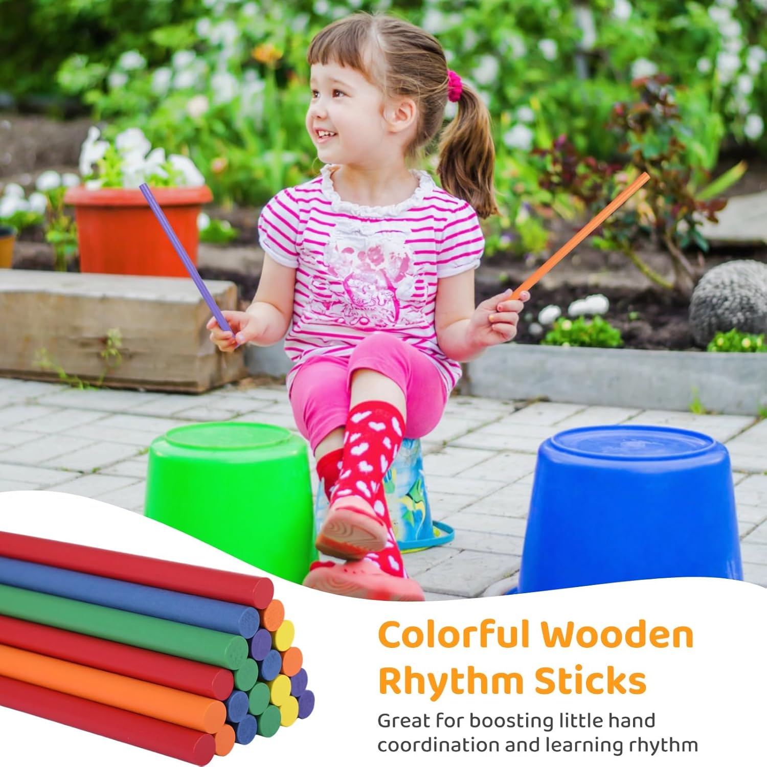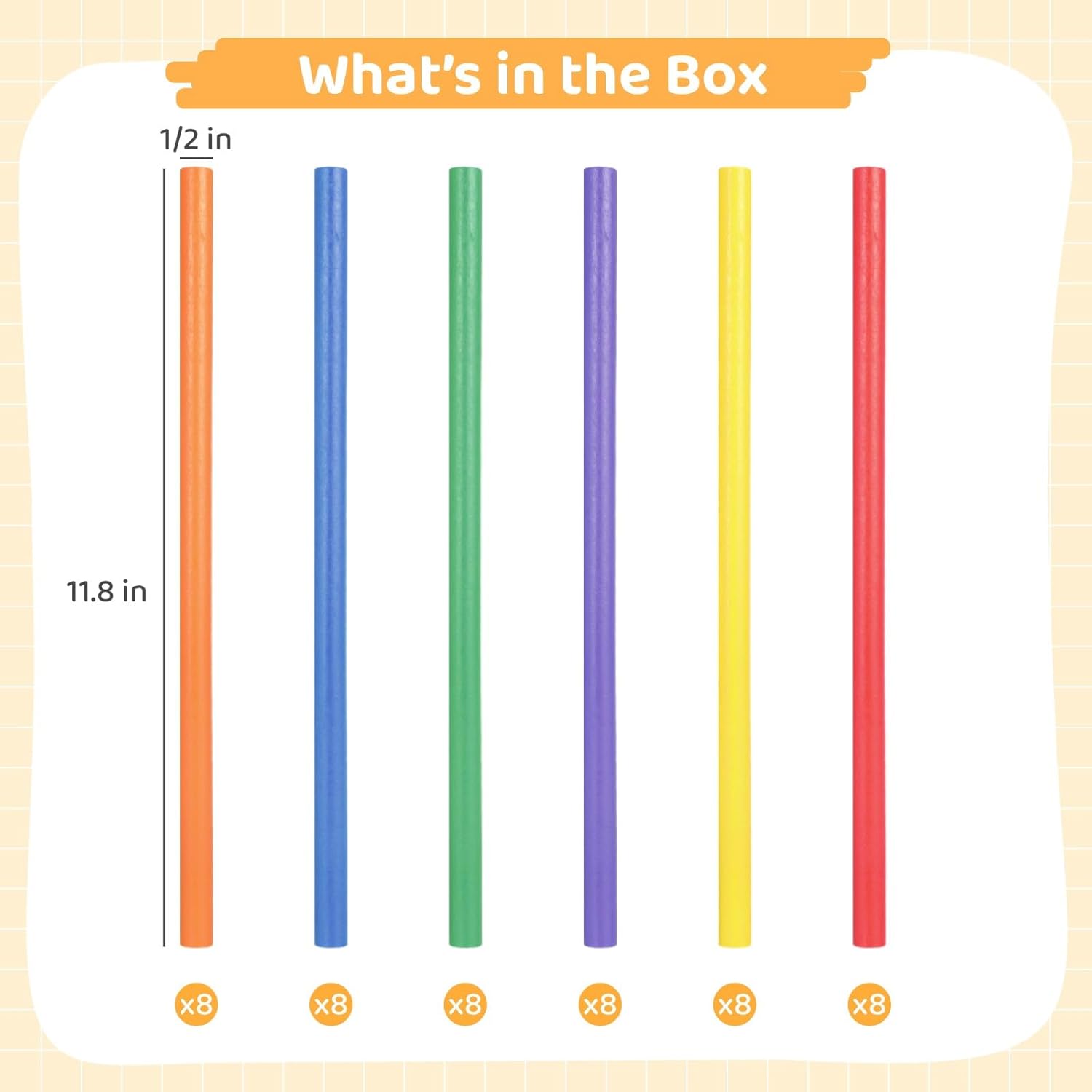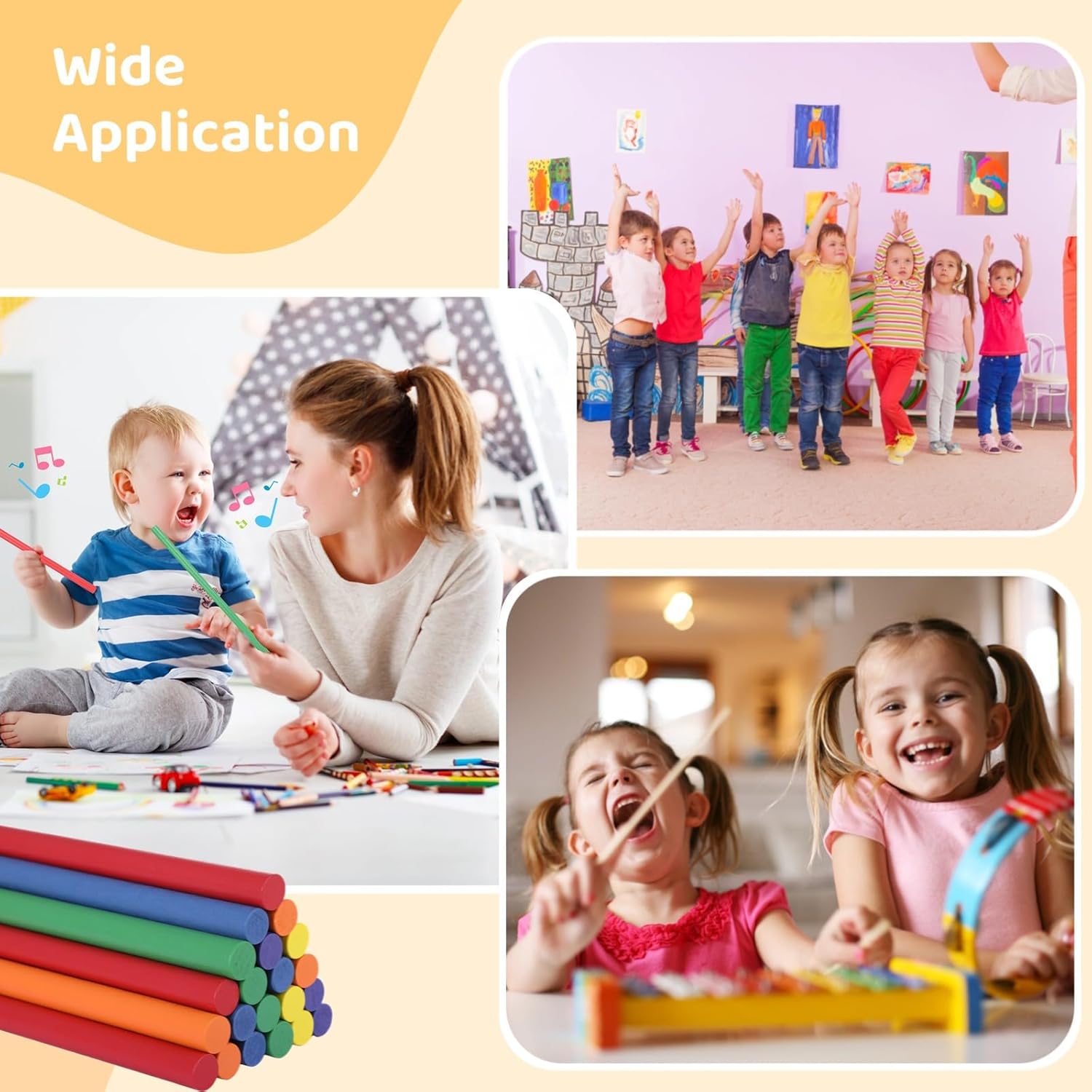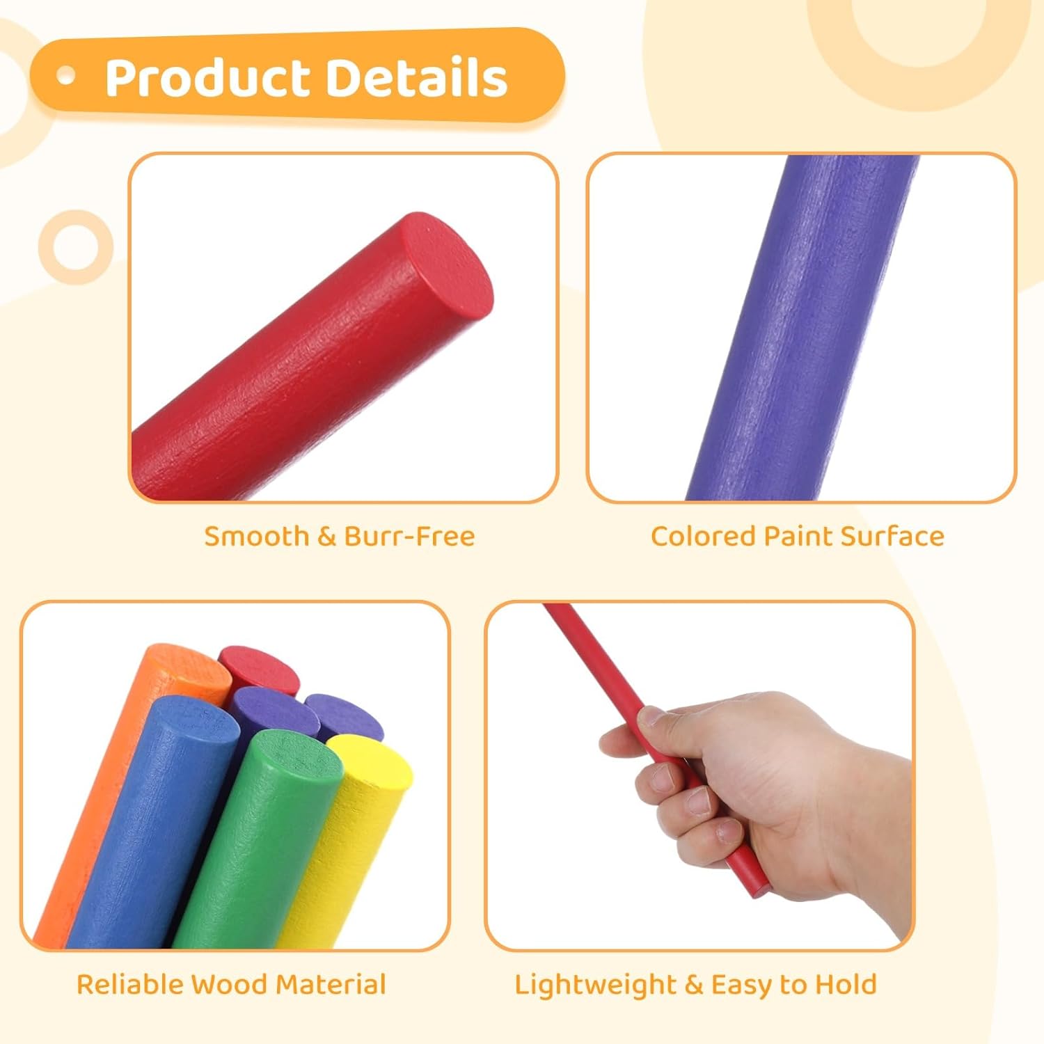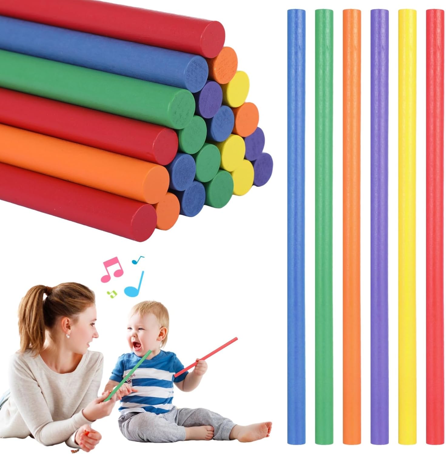 Colorato e divertente: include 48 bastoncini ritmici vivaci in sei colori: arancione, verde, giallo, rosso, blu, viola; ideali per attirare l'attenzione e il coinvolgimento dei bambini; elastici inclusi per una conservazione ordinata Sicuro, liscio e durevole: realizzato in legno massello con bordi lisci; la vernice non pericolosa assicura che i colori rimangano vivaci anche dopo un uso ripetuto Aumenta la coordinazione: migliora le capacità ritmiche dei bambini e la coordinazione motoria in modo divertente e educativo; ideale per attività di apprendimento prescolare e precoce Dimensioni giuste: ogni bastoncino misura 30,5 cm di lunghezza e 1,3 cm di diametro; leggero e facile da maneggiare, rendendolo adatto per un uso prolungato senza disagio Ideali per molteplici attività: questi bastoncini ritmici possono essere utilizzati per lezioni di musica, danza, programmi di fitness ed esercizi di team building; supportano lo sviluppo fisico e cognitivo