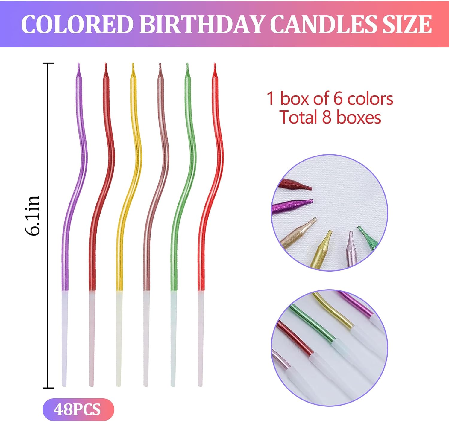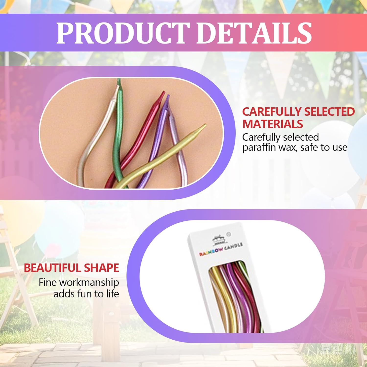 Contenuto della Confezione: Fornisce 8 Scatole da 48 Set di valore super per soddisfare le tue esigenze per più feste di compleanno o grandi feste. Non devi più preoccuparti che il numero di candele compleanno non sia sufficiente, Che si tratti di una piccola festa di compleanno in famiglia o di un felice ritrovo tra amici, Questo set di candeline può facilmente farcela, Aggiungendo un'atmosfera calda a ogni momento del compleanno. Materiali Sicuri: Candele Compleanno è realizzato con materiali sicuri e affidabili, Senza odore o fumo nero durante la combustione, Garantendo la salute e la sicurezza di te, della Tua famiglia e dei tuoi amici quando ti godi la gioia dei compleanni. Puoi accendere candeline con sicurezza, Esprimere un desiderio e spegnerlo senza preoccuparti della generazione di gas nocivi, Creando un ambiente puro e sano per le feste di compleanno. Design Unico: Candela compleanno ha una forma unica con curve morbide, Rompendo la monotonia delle tradizionali candele dritte. Luminoso e colorato con una varietà di colori, Aggiungendo colori più splendidi alle feste di compleanno. La lunghezza di circa 15,5 cm può continuare a bruciare stabilmente dopo essere stata accesa, Rendendo il momento dei desideri più cerimoniale. Fissaggio della Staffa: Ogni candeline compleanno è dotato di una staffa bianca stabile, Comoda da inserire in torte e altri alimenti e non facile da ribaltare, Così puoi sentirti più a tuo agio quando esprimi desideri e soffi candeline lunghe compleanno sottili. La combinazione perfetta della staffa e della candela garantisce la stabilità della candela senza comprometterne la bellezza complessiva, Offrendo praticità e protezione per le feste di compleanno. Scenario Applicativo: Questa candele lunghe non è adatta solo per i compleanni di adulti e bambini, Ma anche per i compleanni di animali domestici. È anche adatto come decorazione per torte per varie occasioni come anniversari, Feste di pensionamento, Riunioni di famiglia, Feste, Ecc. È un must per squisite torte da festa, Che ti regaleranno ricordi indimenticabili e significativi
