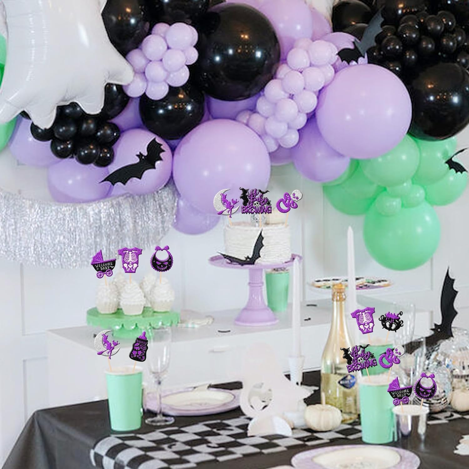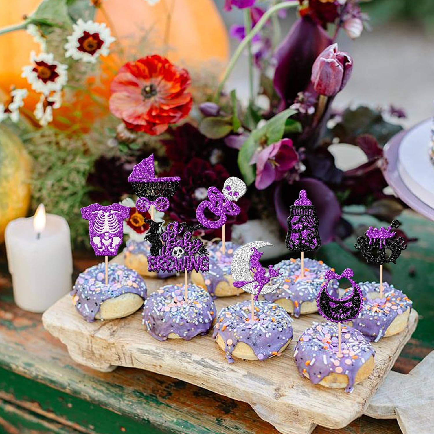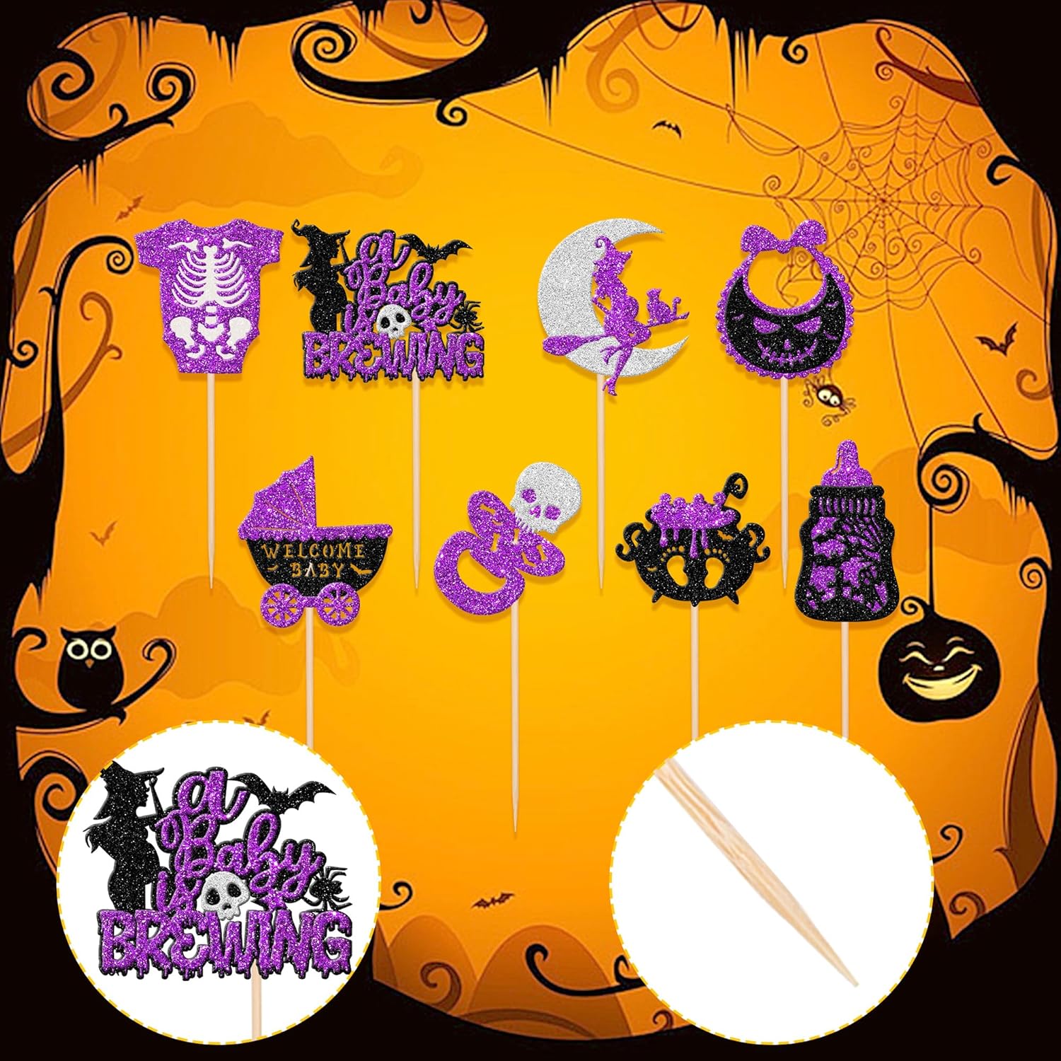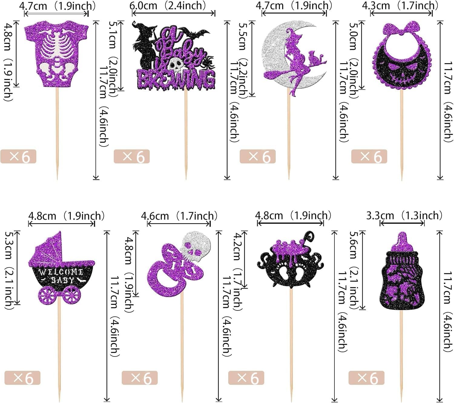 Decorazioni versatili per eventi: perfette per molteplici celebrazioni tra cui feste di Halloween, temi "baby is brewing", rivelazioni di genere, baby shower e compleanni dei bambini. Migliora cupcake, gelati, frutta, biscotti e dessert con disegni accattivanti che aumentano il divertimento delle feste e l'appeal visivo. Materiale glitterato di alta qualità: realizzato in cartoncino glitterato da 300 g con bastoncini di bambù 100% per uso alimentare. Resiste alla deformazione e allo sbiadimento, con bordi lisci senza sbavature. Il design glitterato su un lato (retro bianco) crea riflessi di luce abbaglianti per elevare l'atmosfera della festa. Praticità premontata: le decorazioni pronte all'uso eliminano gli sforzi fai da te. Risparmia tempo durante la preparazione delle feste: basta inserirlo nelle torte/cupcake e regolare l'altezza per un effetto di visualizzazione ottimale senza montaggio aggiuntivo. Ampia quantità e dimensioni: il set include 48 pezzi in totale (4 per design). Dimensioni versatili: 4,9 x 10,6 cm, 6,1 x 10,6 cm, 4,3 x 10,6 cm e 3,3 x 10,6 cm (con bastoncini) per soddisfare diverse esigenze di decorazione tra dessert. Impatto decorativo istantaneo: questi topper pre-assemblati trasformano istantaneamente i dessert in punti focali. Le loro superfici scintillanti attirano l'attenzione mentre la costruzione robusta garantisce un uso affidabile durante gli eventi, massimizzando l'efficienza decorativa.