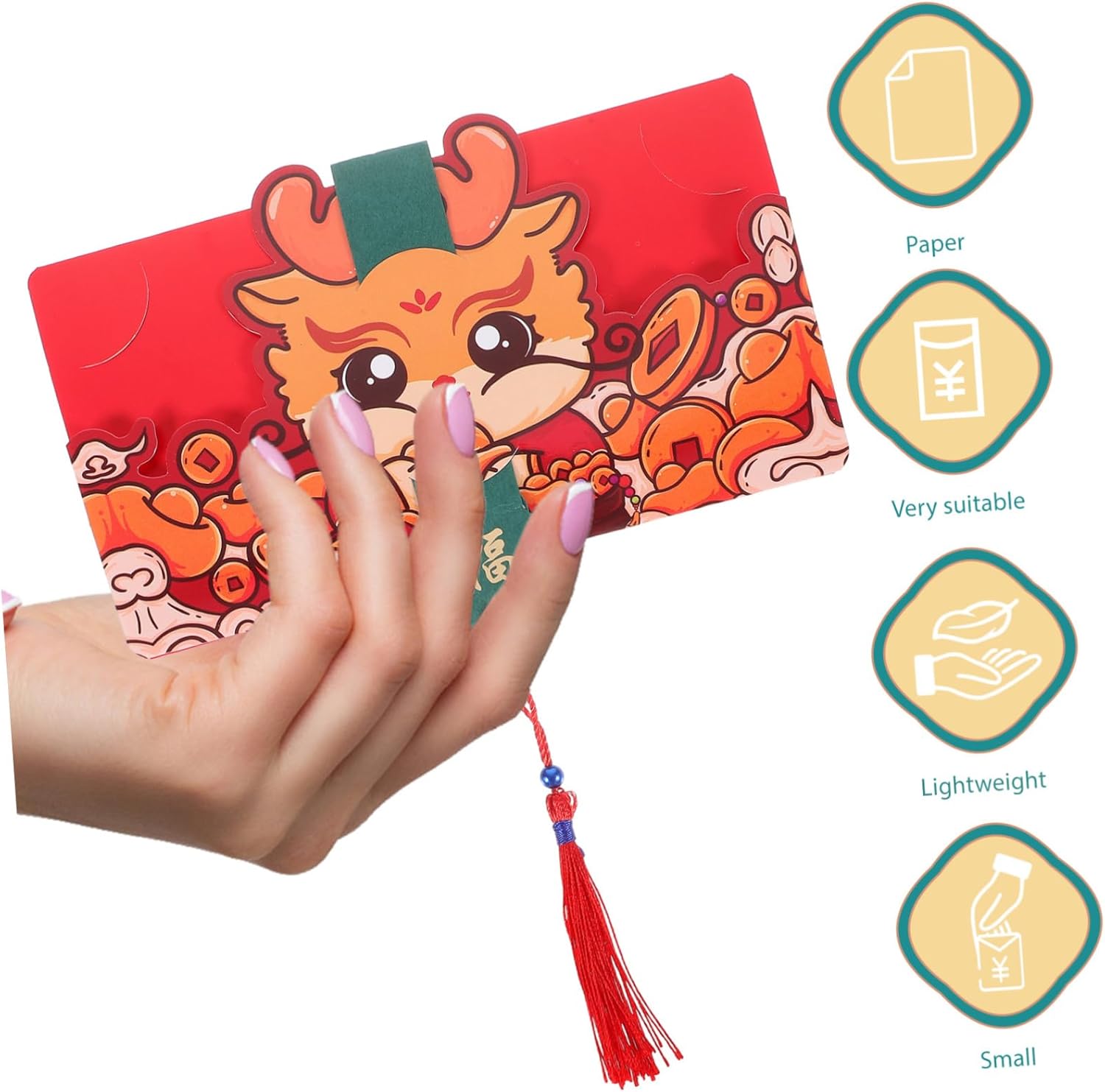 Realizzate in materiale cartaceo, non si strappano facilmente, queste buste rosse sono robuste e sicure da usare a lungo termine. Combinato con elementi delicati e motivi cartoon, molto creativi e festosi, un bel pacchetto di soldi per Capodanno. Facile da usare, leggero, facile da aprire o chiudere, portatile e comodo per inserire o estrarre le buste rosse. Può essere utilizzata non solo come busta rossa, ma anche come piccola borsa , borsa per gioielli, ecc., versatile e pratica. Può permetterti di mettere contanti, piccoli gioielli, piccoli biglietti di auguri e così via in modo più sicuro, dando al destinatario una grande sorpresa.