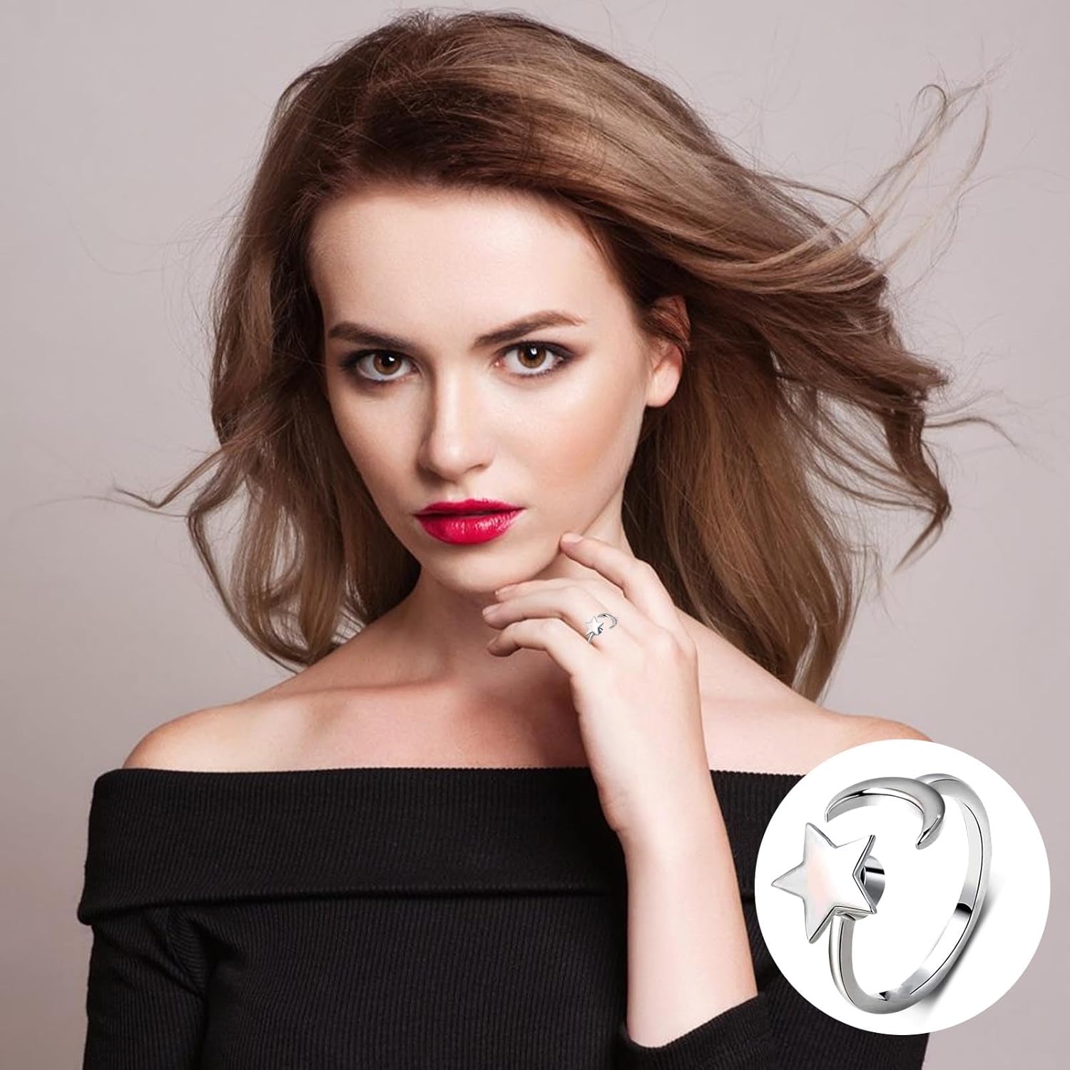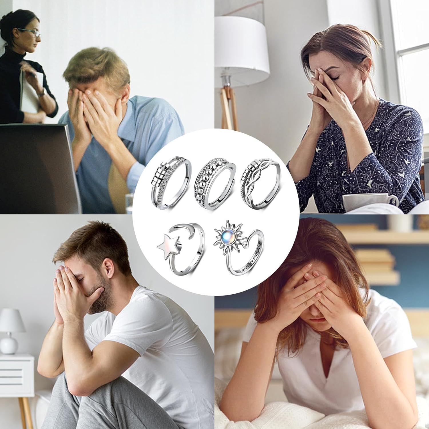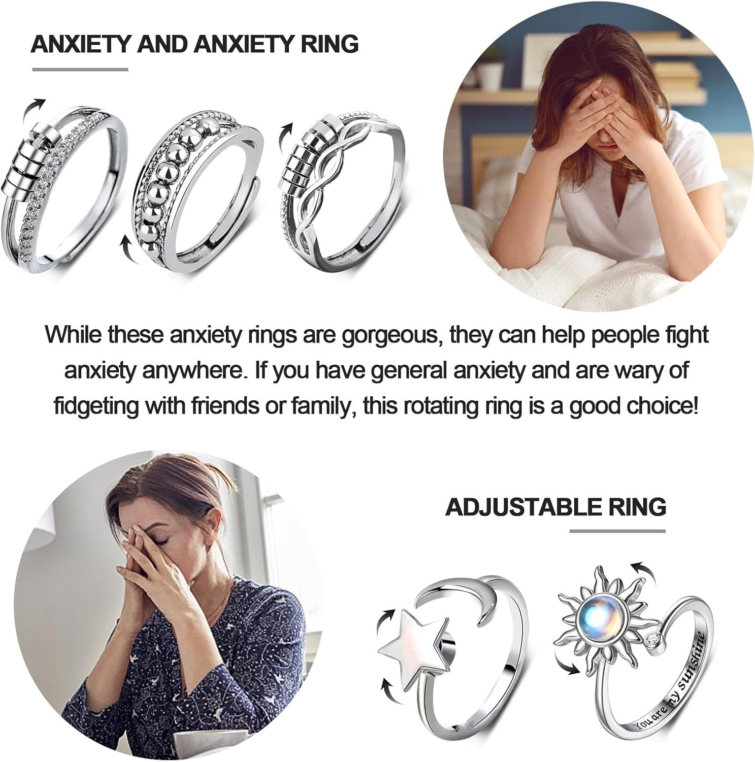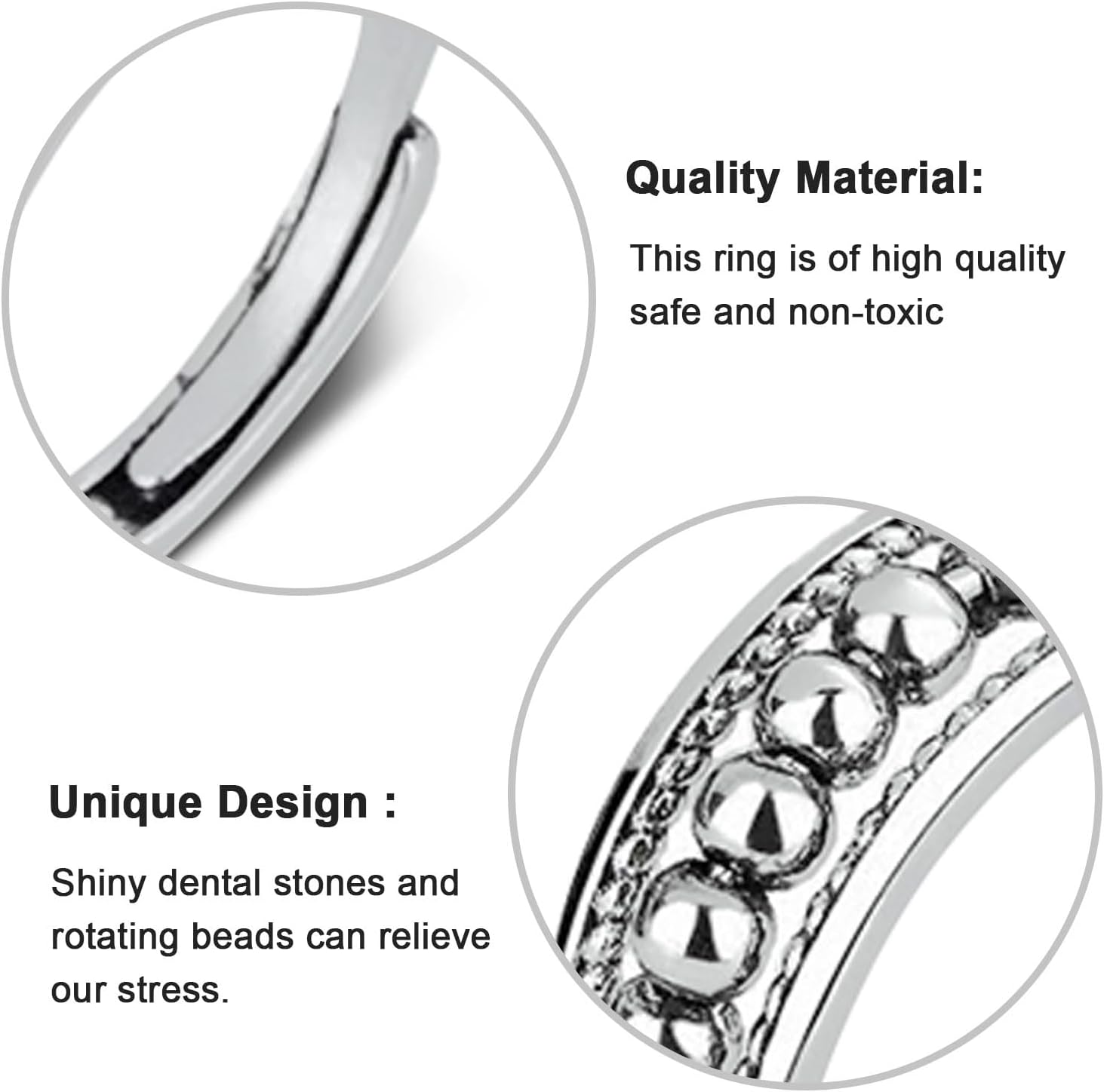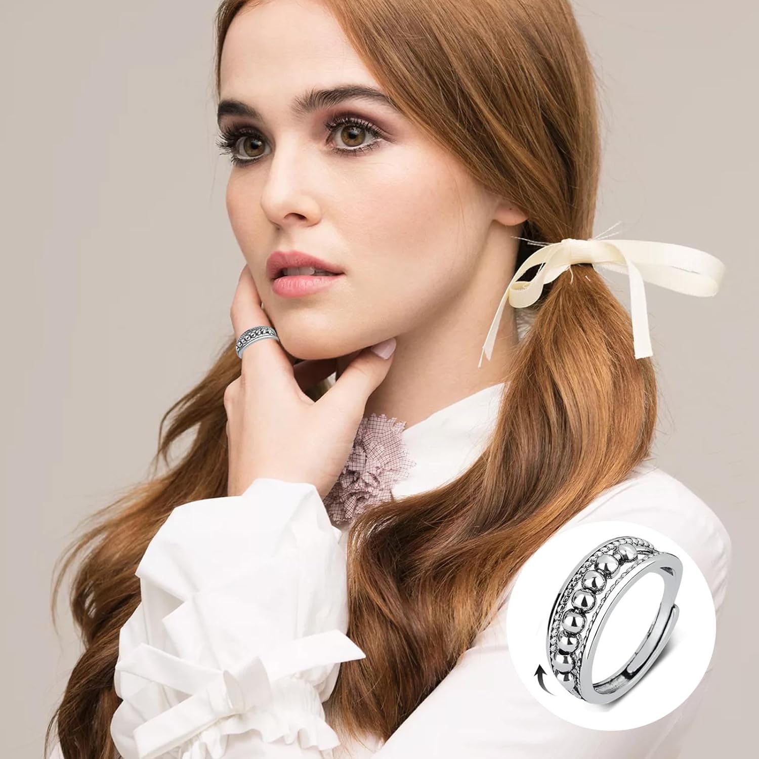La dimensione dell'anello di ansia può essere regolata in base alle dita e può essere facilmente premuta. L'anello da donna in argento può essere ridotto o allungato. Design regolabile per quasi tutte le dimensioni delle dita, adatto a tutte le età. Ruotare l'anello può aiutarti a rimanere calmo e rilassato. Quando ti senti irrequieto dentro, puoi girare la perla sull'anello. Gira sulle dita, il che è divertente e ti aiuta a calmarti. Gli anelli spinner sono semplici ma eleganti nel design, ognuno con uno stile diverso e il numero di perle. Puoi portarne uno da solo o impilarli insieme. Non solo è molto adatto per alleviare l'ansia, ridurre lo stress, migliorare le emozioni, concentrarsi o deviare le cattive abitudini, ma è anche un buon accessorio alla moda.