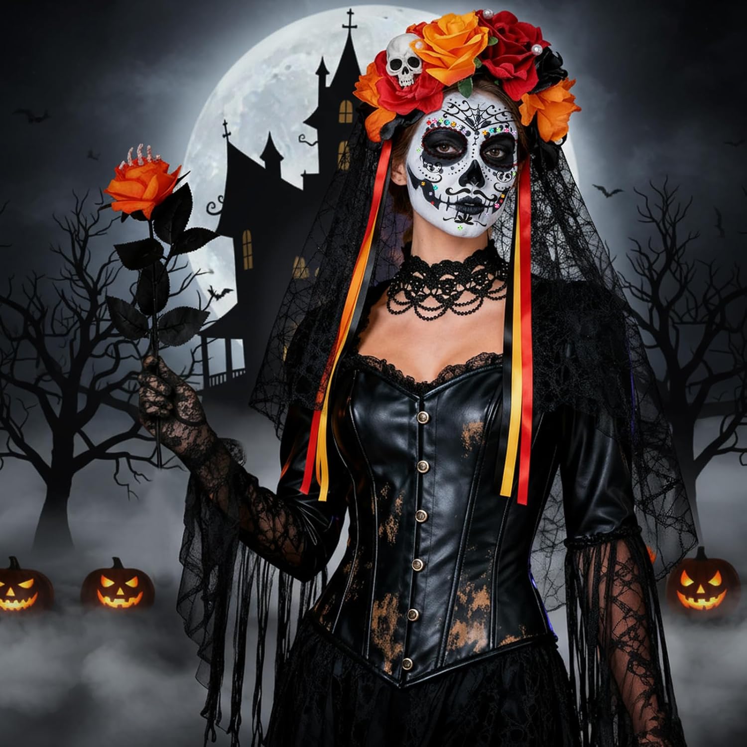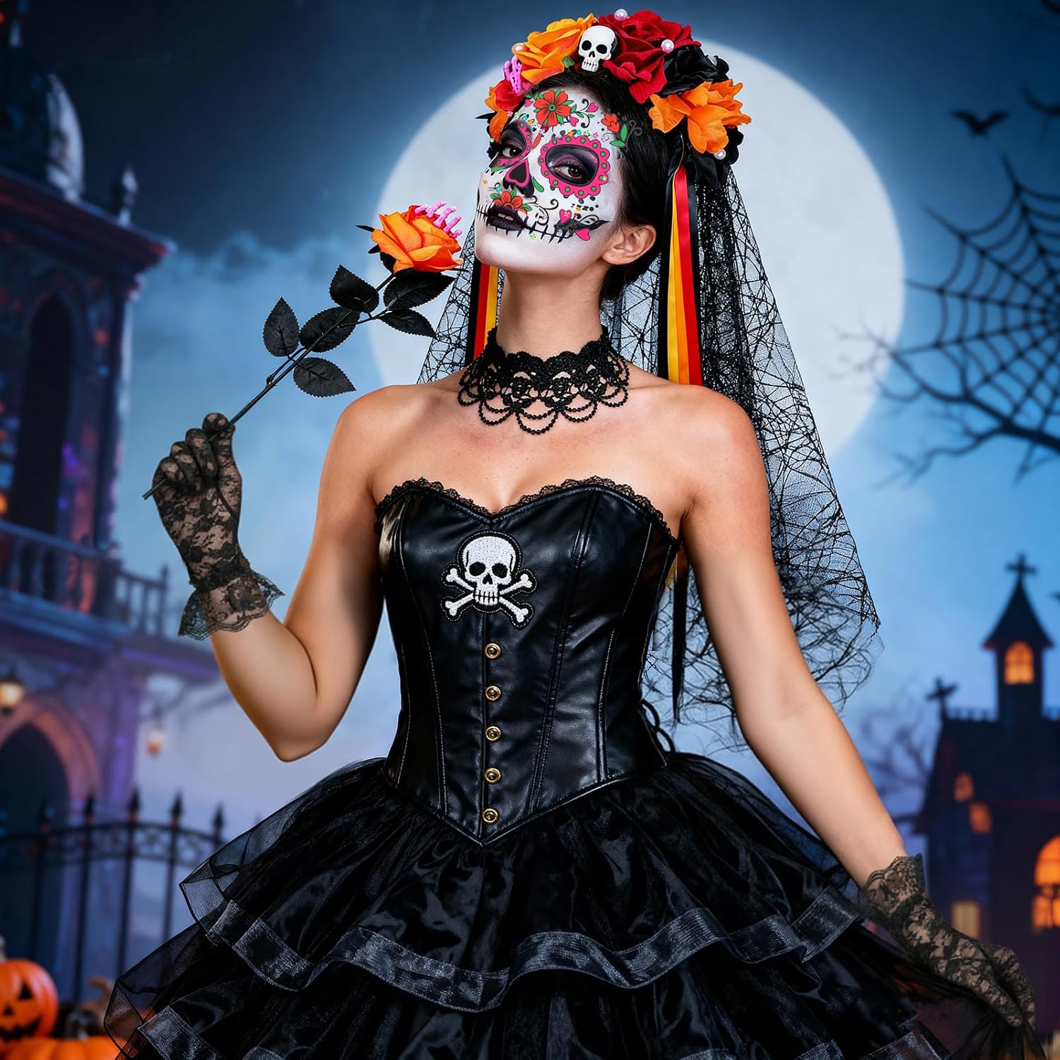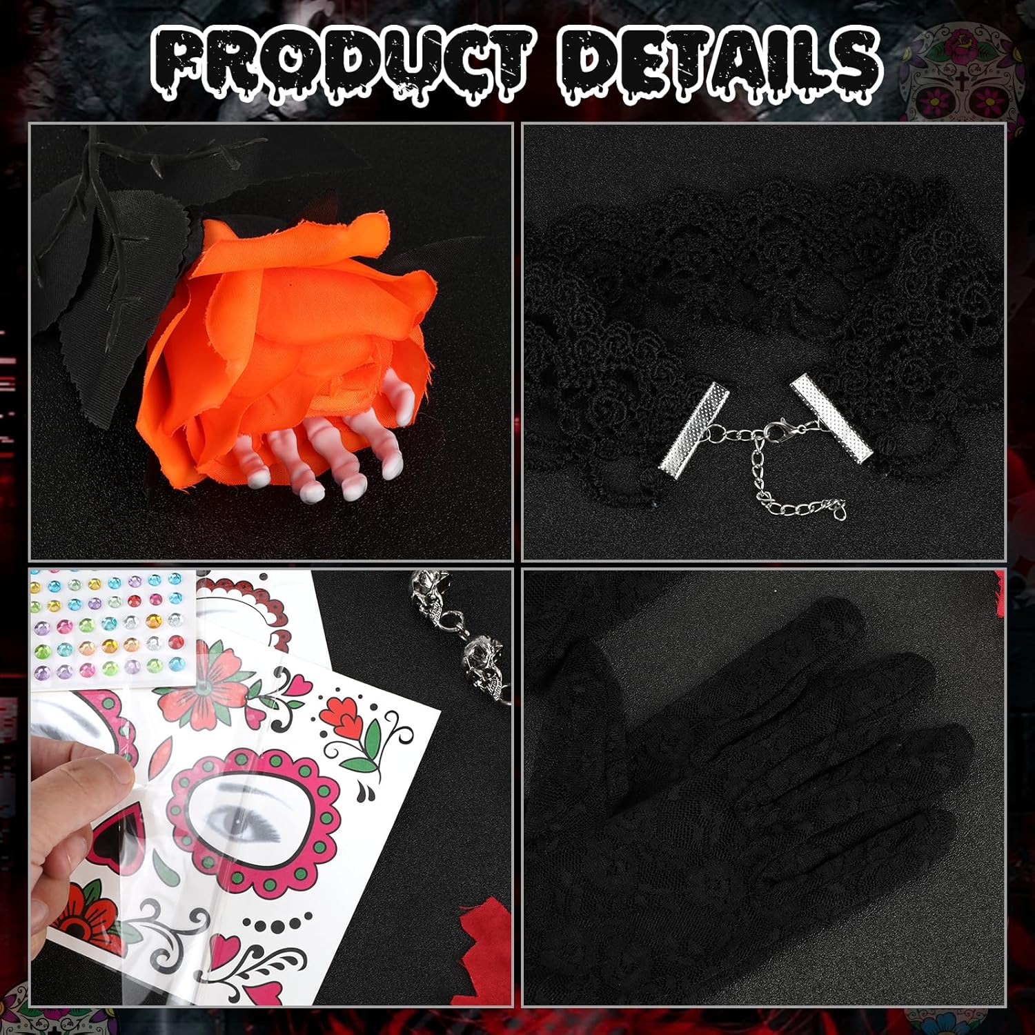 Disfraz para el día de los muertos, que incluye diadema ( muy bonita); guantes de encaje; una rosa con una mano de esqueleto; collar; pegatinas/maquillaje. Con un buen vestido, ya tienes el disfraz hecho y súper bonito.