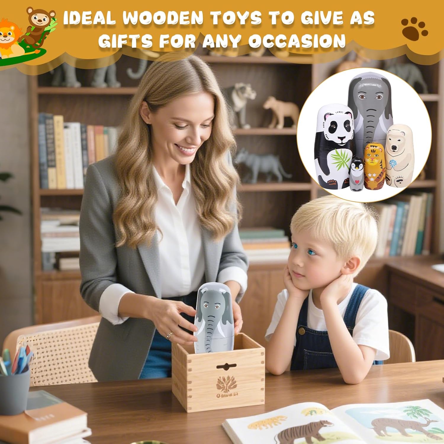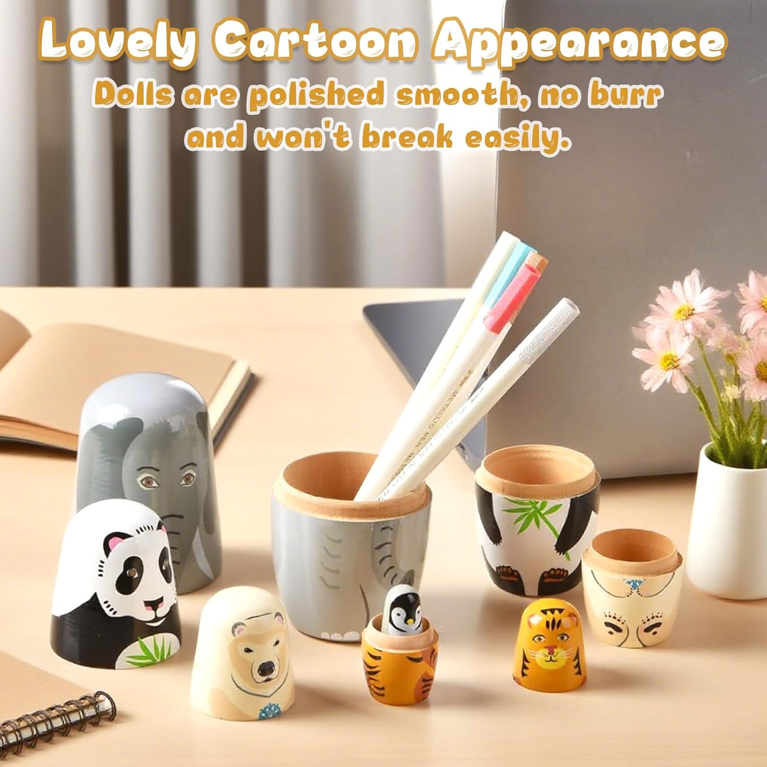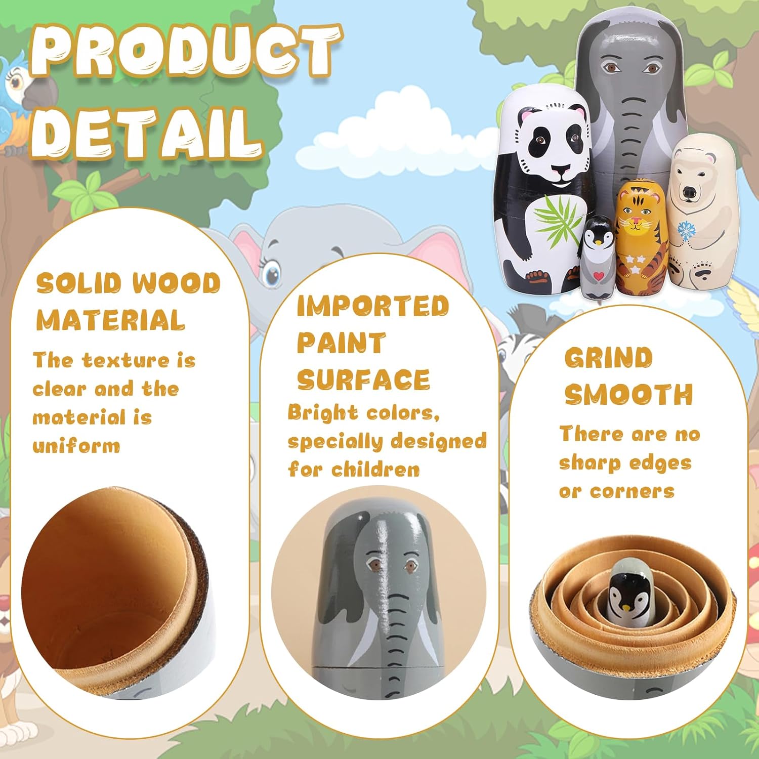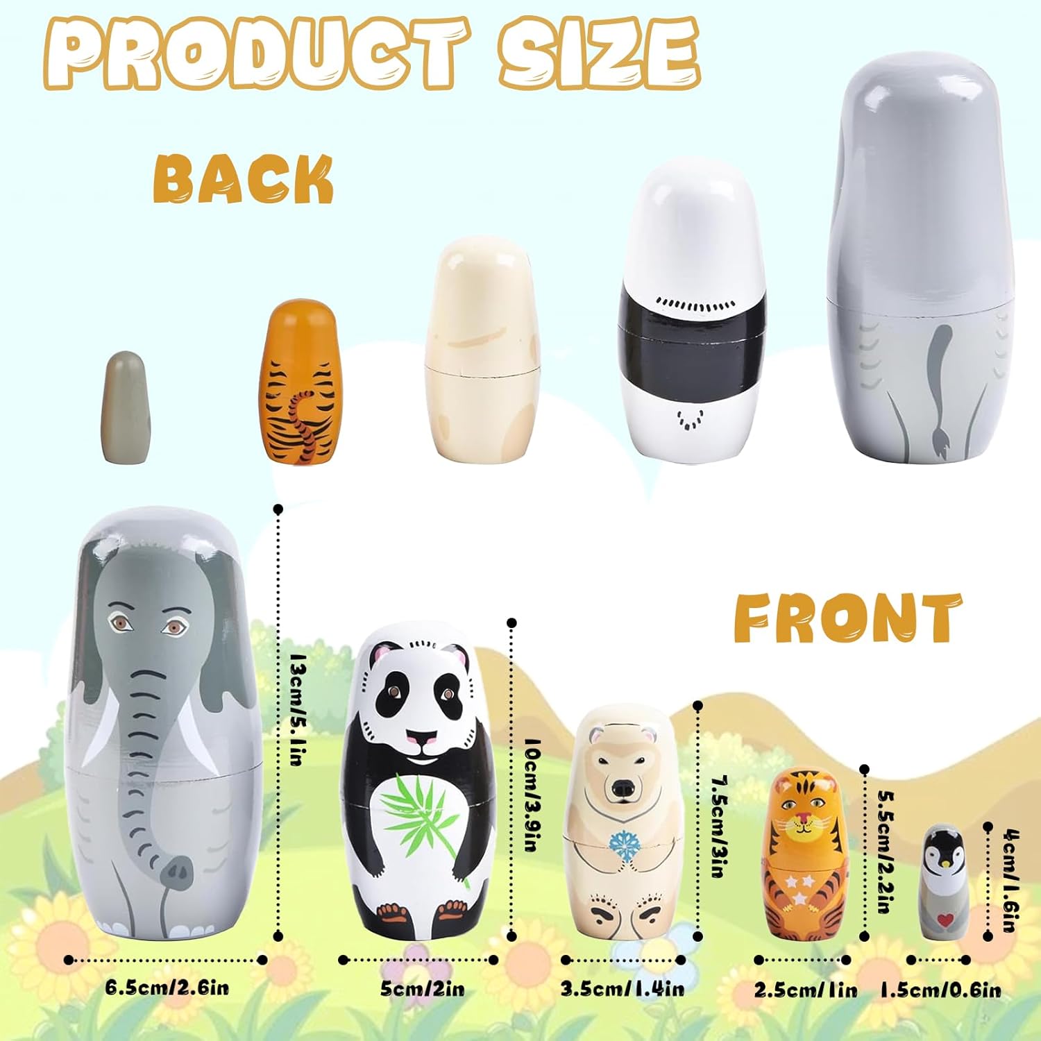 【Materiali sicuri e rispettosi dell'ambiente】: nuestras muñecas rusas para anidar están hechas principalmente de madera de balsa, la madera es delicada, el rendimiento anticorrosión es bueno, la mano de obra es exquisita, no es fácil de romper y es duradera.Speciale vernice all'acqua per bambini; le mamme possono stare tranquille quando i bambini giocano. 【Artesanía exquisita】: Nuestras muñecas de elefante están hechas con un estricto proceso de pintura, cada una es única, con colores brillantes y estilos claros. 【Diseño de cinco capas】: nuestra muñeca de anidación rusa tiene diferentes capas, una capa es más pequeña que una capa, lo que puede distinguir rápidamente las capas grandes y pequeñas, lo cual es conveniente para el uso y la generalización. 【Cinco animales】: cada una de nuestras muñecas de anidación es un animal diferente, de grande a pequeño: elefante, panda, oso polar, tigre, pingüino. Delicado, dulce y encantador. 【Amplia gama de aplicaciones】: Nuestras muñecas matryoshka son especialmente adecuadas para la decoración en hogares, escuelas, centros comerciales, oficinas, etc., especialmente adecuadas para usar en algunas fiestas de cumpleaños y también especialmente adecuadas para la colección.