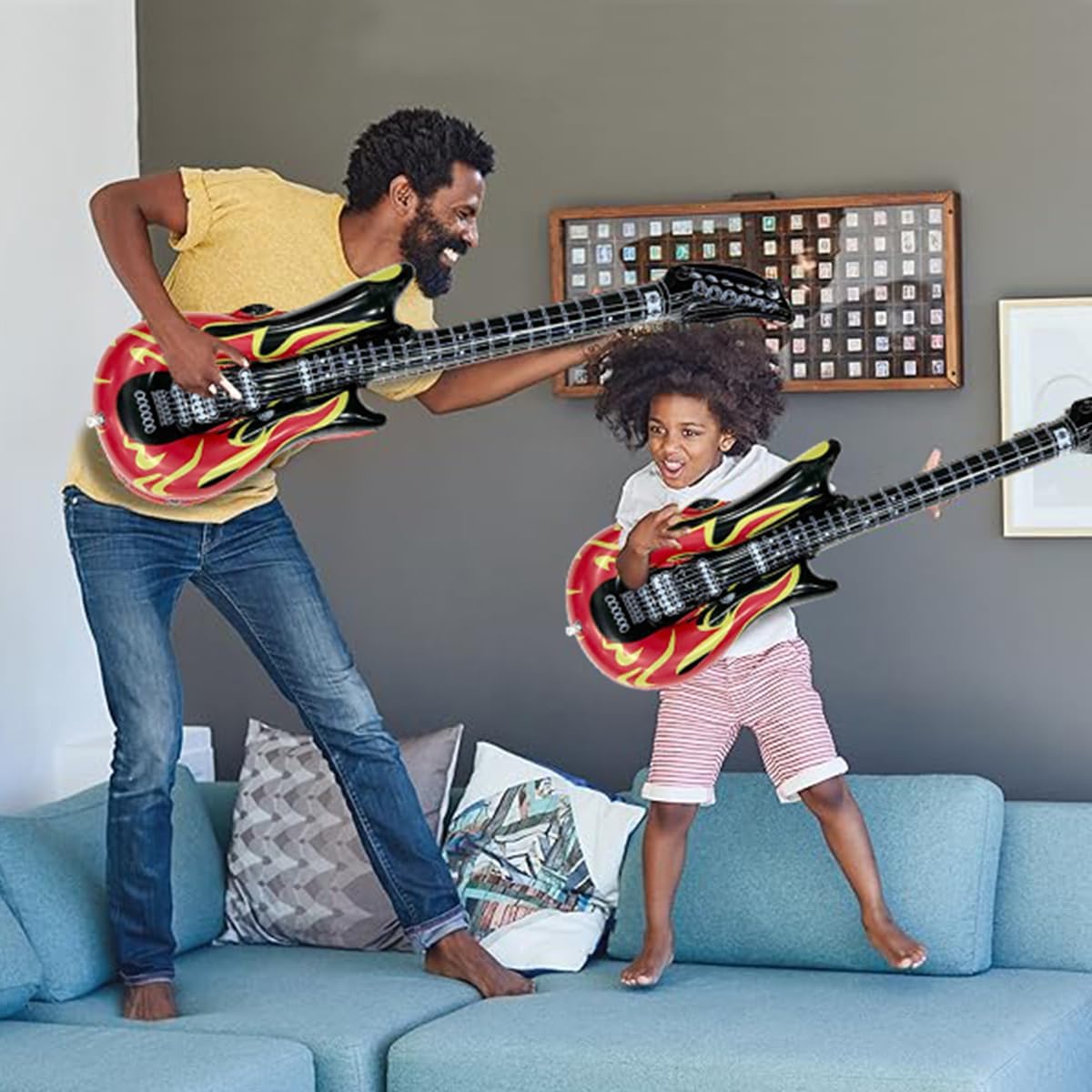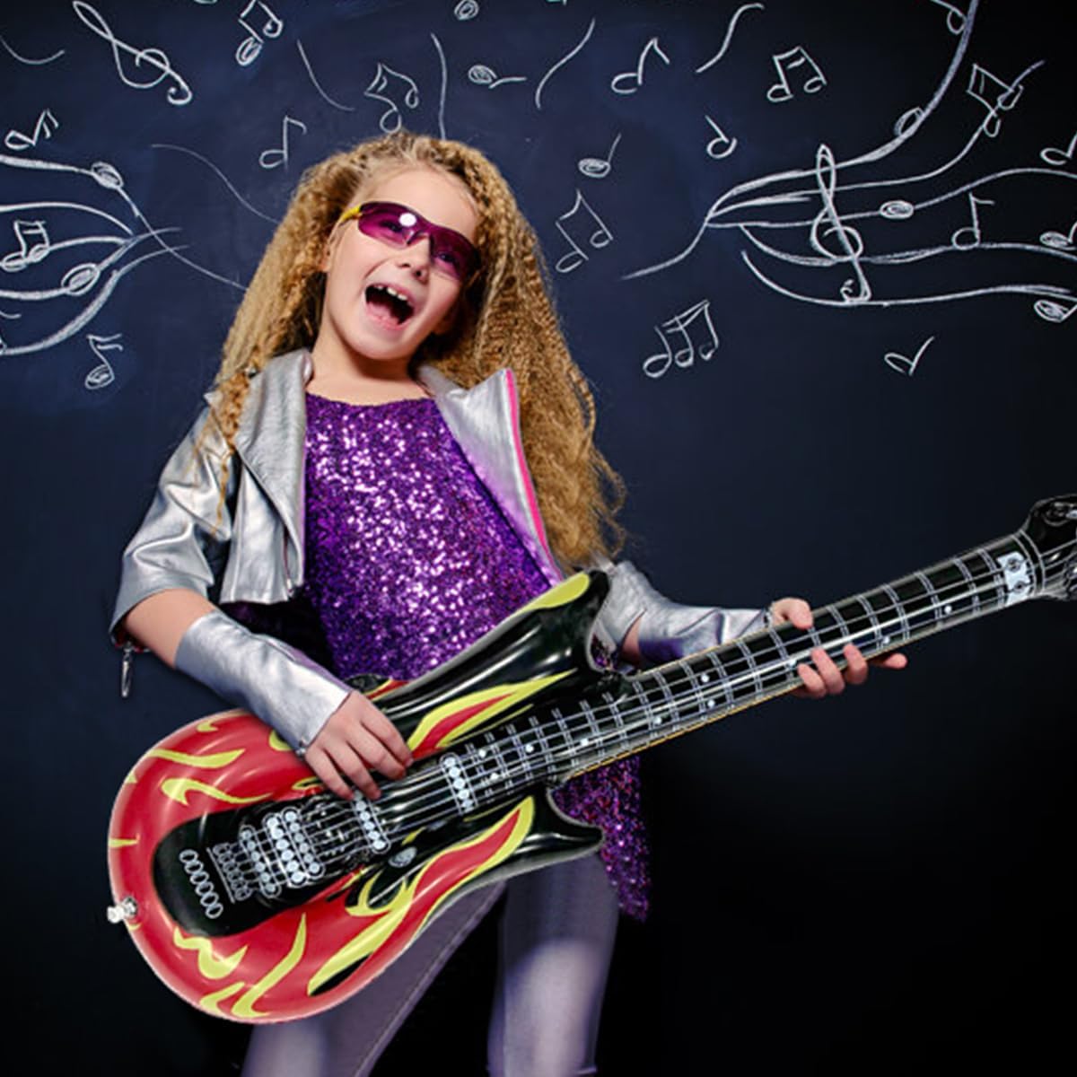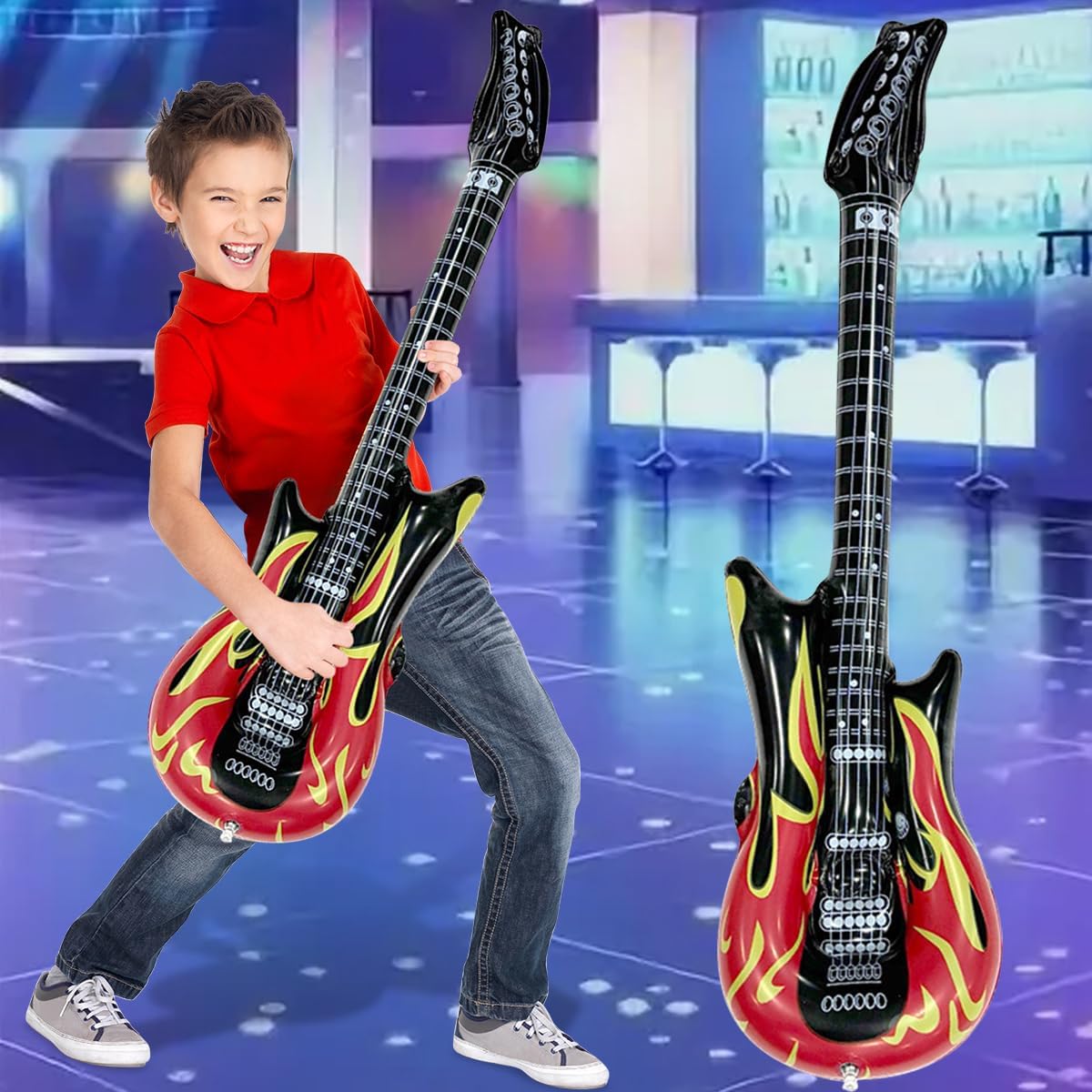 FORMA REALISTICA DELLA CHITARRA : Il design dai colori vivaci conferisce alla chitarra gonfiabile rock molta vitalità e uno stile disco retrò. Lasciate che tutti, alla festa o durante l'esibizione sul palco, vivano l'esperienza di un cantante rock ! DIMENSIONI PERFETTE : Chitarra gonfiabile : 100 cm . Si adatta alla maggior parte delle corporature. Perfetto per chi ama la musica rock e vuole imitare un chitarrista a una festa ! CHITARRA GONFIABILE DI ALTA QUALITÀ : Questa chitarra gonfiabile è realizzata in PVC spesso e di alta qualità. Lunga durata e resistenza agli strappi. Le valvole di alta qualità sono facili da gonfiare, possono trattenere l'aria per giorni, sono resistenti e a prova di perdite. Inoltre, la chitarra gonfiabile è impermeabile e quindi perfetta per l'uso sia all'interno che all'esterno. CHITARRA GONFIABILE FACILE DA USARE : La air guitars è dotata di una valvola di gonfiaggio rapido che può essere gonfiata con una pompa ad aria o con un bocchino . La chitarra gonfiabile può essere gonfiata rapidamente in poco tempo. Grazie al materiale leggero, può essere facilmente piegato e trasportato quando non viene utilizzato. Si ripiega in modo compatto e si adatta facilmente allo zaino o alla valigia - Perfetto per viaggiare . ADATTO A VARIE SCENE : Le nostre chitarra per bambini gonfiabili sono accessori perfetti per spettacoli musicali, feste di compleanno, giochi d'acqua, feste in piscina, feste in maschera, matrimoni, cabine fotografiche e carnevali, ecc .