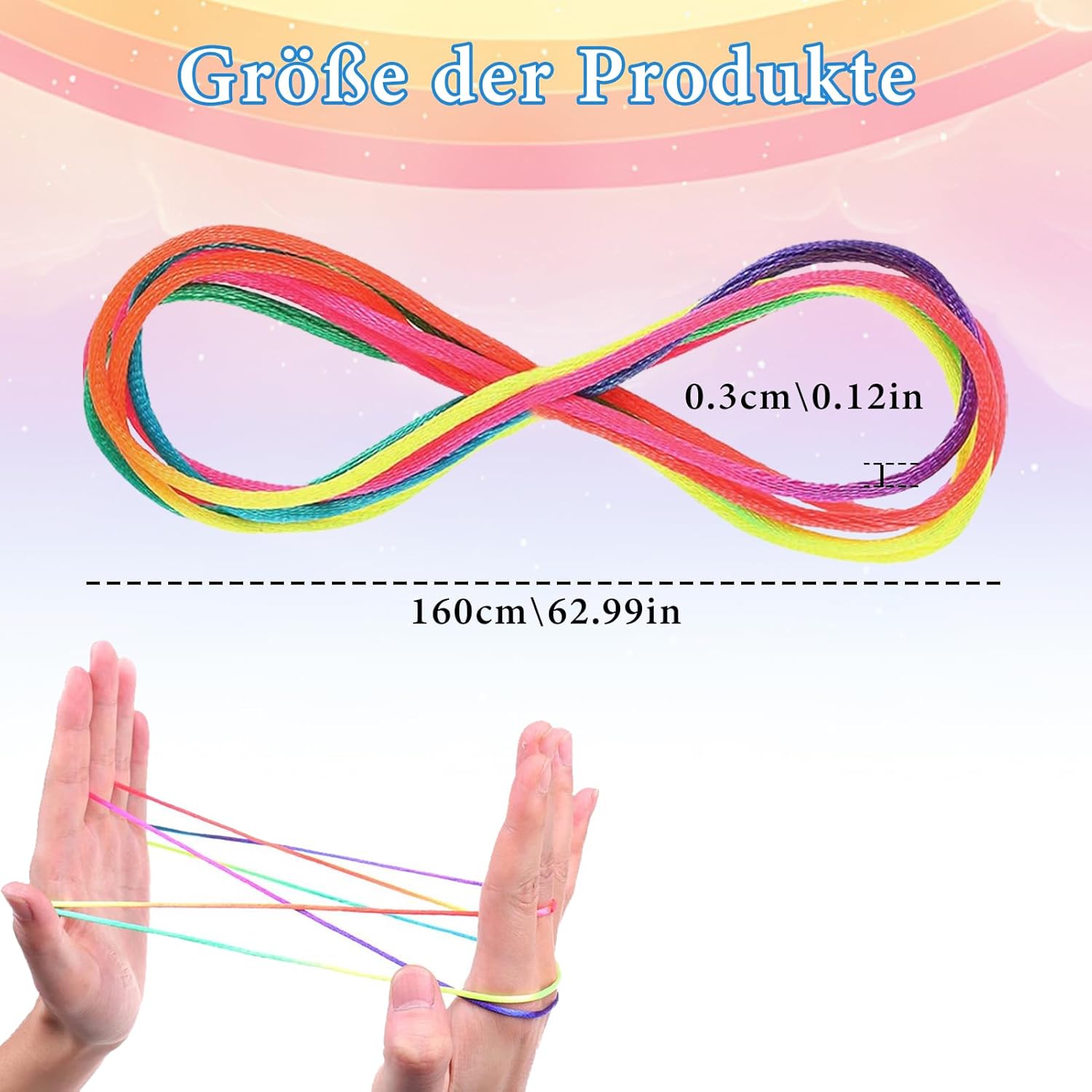 Materiale di alta qualità: il nostro giocattolo per bambini è realizzato in nylon di alta qualità, robusto e durevole, non si strappa facilmente e può essere utilizzato a lungo. È morbido e morbido e non danneggia le dita durante il gioco. Ogni nastro arcobaleno è lungo 160 cm e abbastanza lungo per permettere ai bambini di intrecciare modelli e forme semplici o complessi. Apprendimento E Divertimento: Questo gioco di infila e dita migliora la destrezza dei bambini e promuove la loro creatività e adattabilità. Su Internet ci sono molte istruzioni per i giochi con le dita, che non solo migliorano la capacità di apprendimento dei bambini, ma ti offrono anche divertimento nell'apprendimento e aumentano la tua efficienza! Più divertimento: il nostro set di giochi per dita è ideale per tutta la famiglia. Puoi sviluppare nuove varianti di gioco insieme ai tuoi bambini. Questo non è solo divertente, ma rafforza anche il rapporto tra te e i tuoi figli. I giochi con le dita per ragazze sono ideali per il tempo libero dopo la scuola, poiché sono sia rilassanti che educativi. Contenuto della confezione: riceverete 5 corde intrecciate per le dita con una lunghezza di 160 cm ciascuna e un design arcobaleno alla moda che attira immediatamente l'attenzione dei vostri bambini. Questo gioco con le dita è perfetto per feste di compleanno per bambini, attività di classe, feste di famiglia, riunioni di classe e altre occasioni. Può essere utilizzato a casa, in classe, in ufficio, sul prato e in molti altri luoghi ed è molto facile da trasportare. Nota importante: speriamo che il nostro prodotto offra a te e ai tuoi figli una buona esperienza. In caso di problemi, non esitate a contattarci, vi daremo una risposta soddisfacente il più presto possibile.