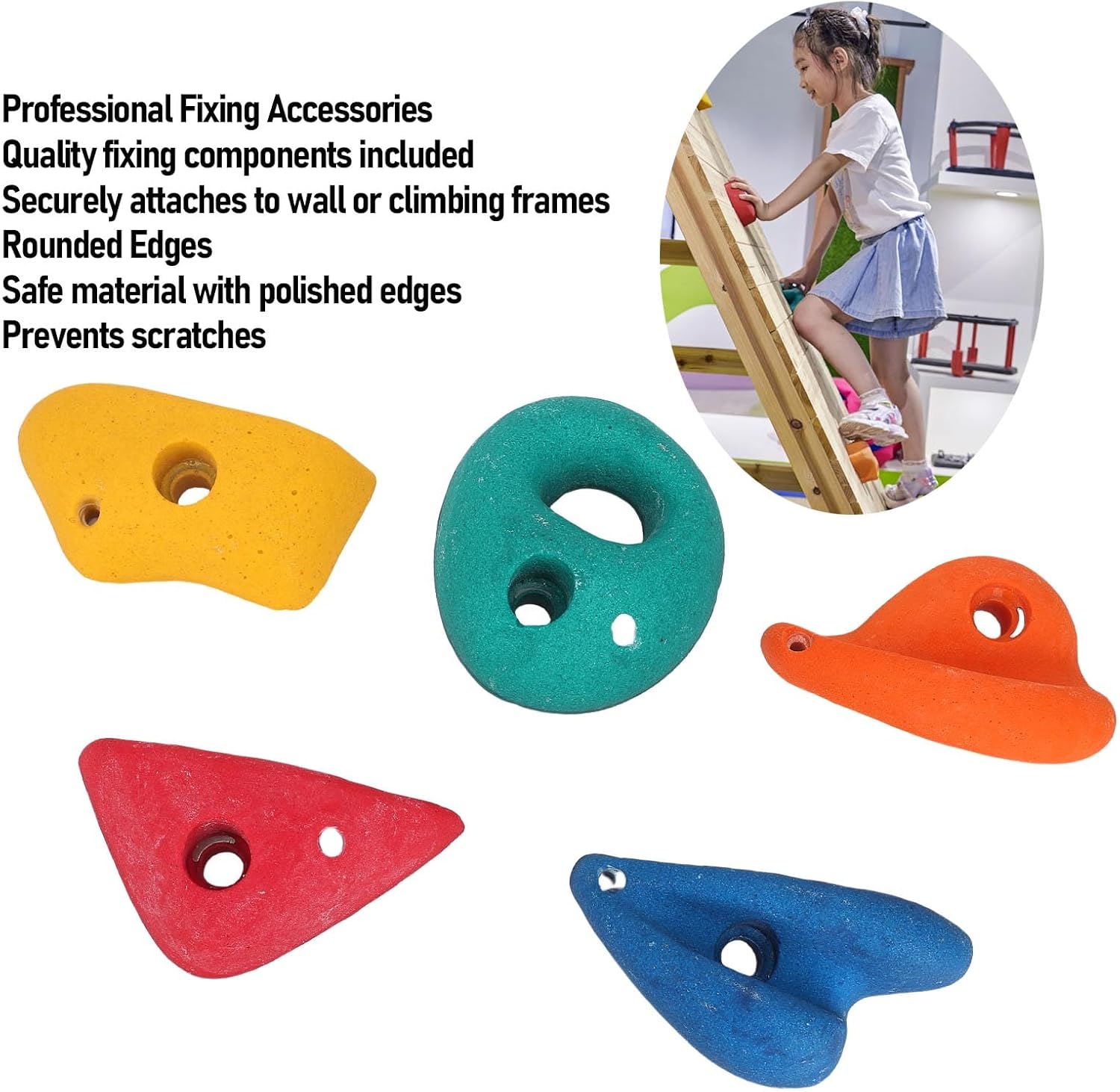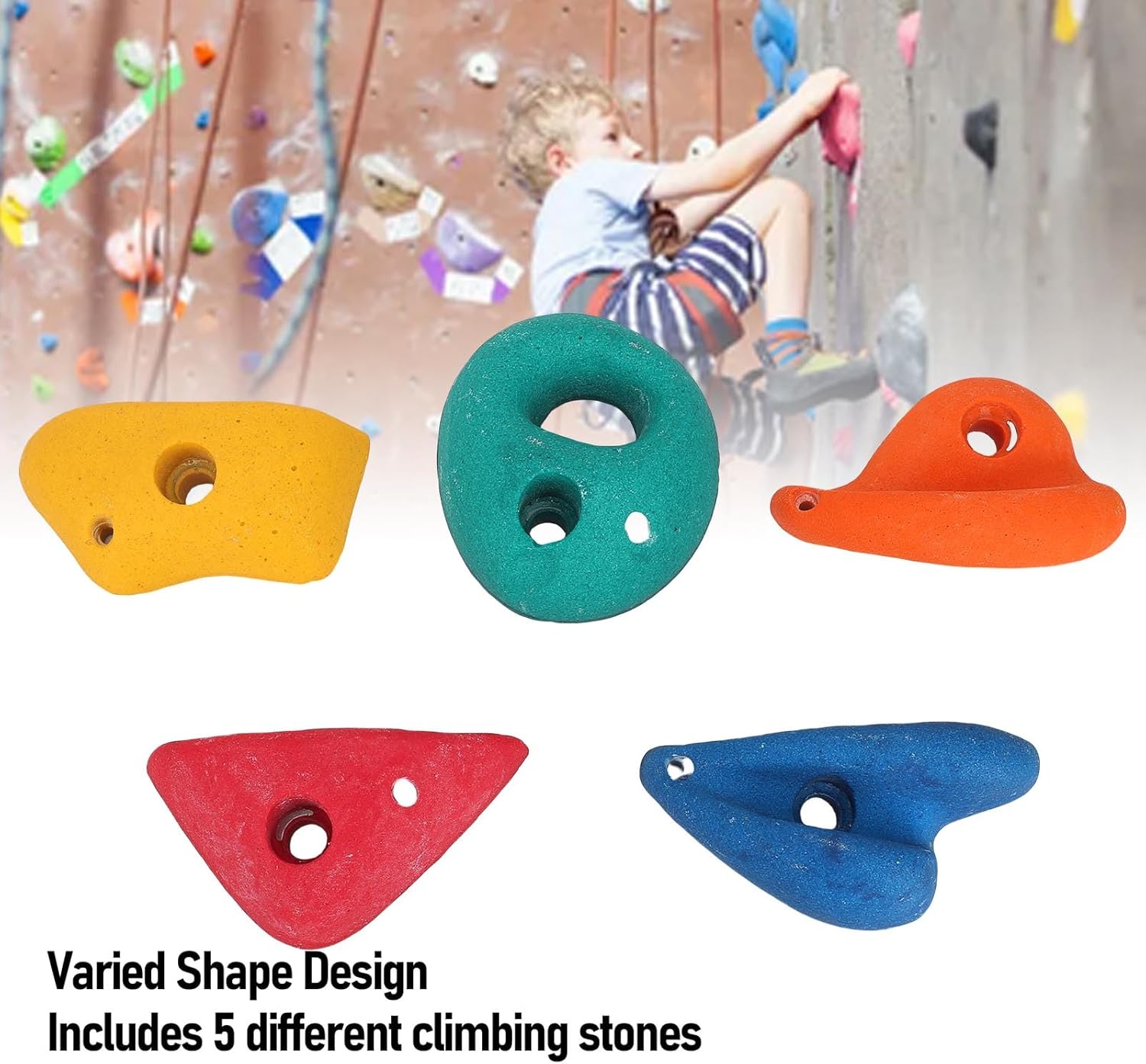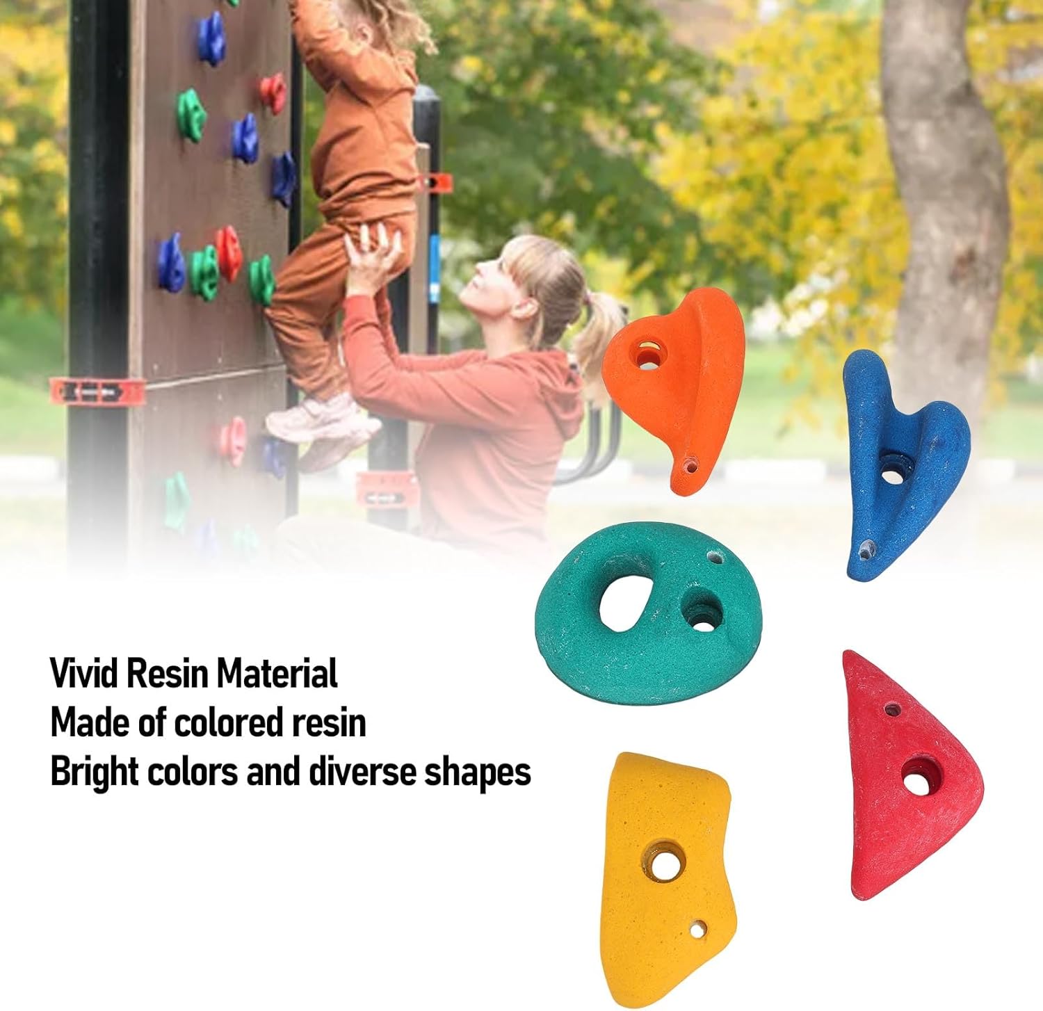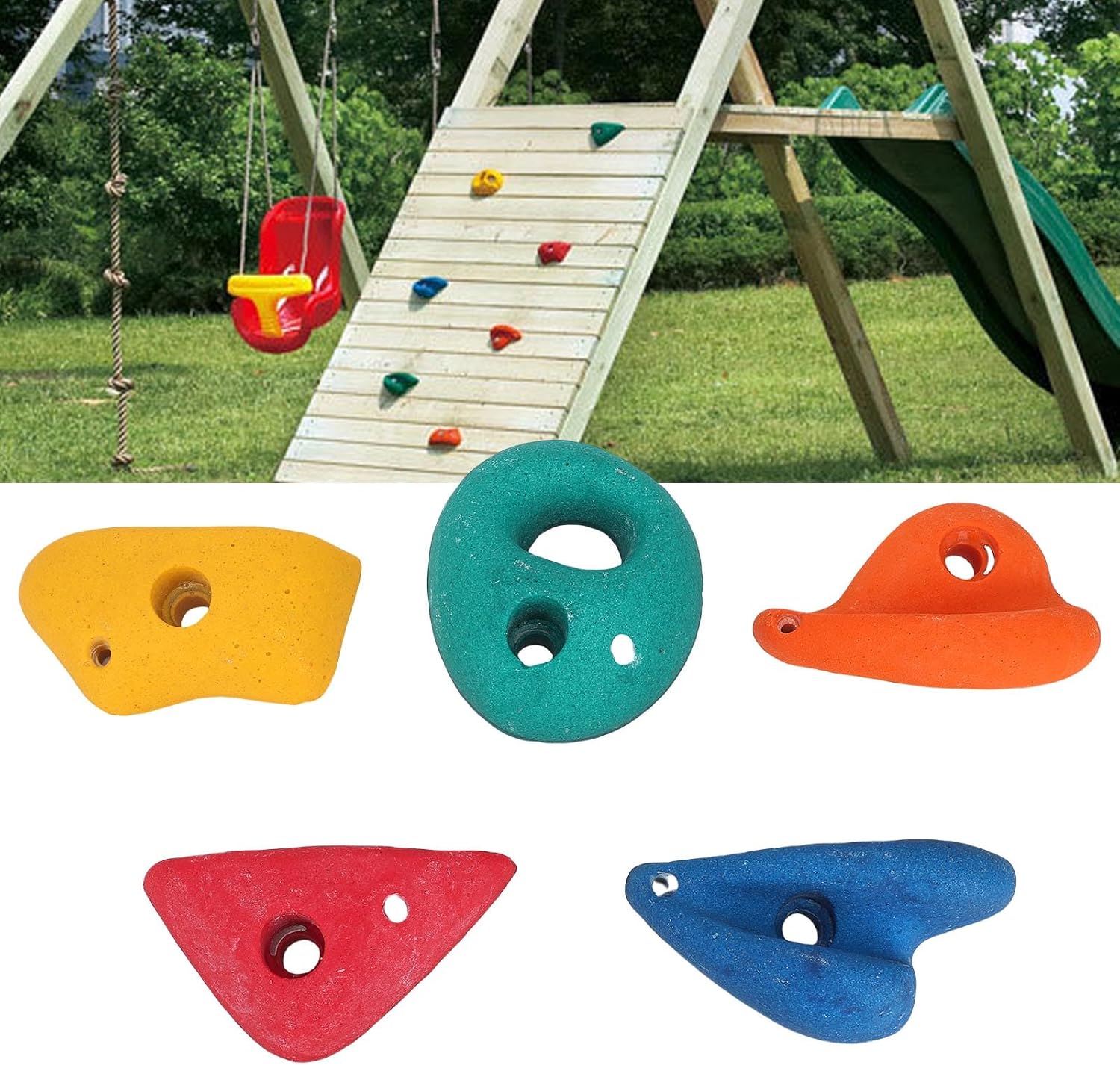 Forme uniche per lo sviluppo delle competenze: ogni roccia da arrampicata presenta forme ergonomiche per migliorare la forza della presa dei bambini, l'equilibrio e il coordinamento con 5 vari design in ogni set. Colori vibranti e materiale sicuro: queste prese in resina sono realizzate in resina colorata per attirare l'attenzione dei bambini garantendo al contempo la sicurezza durante le attività di arrampicata interna o esterna. Installazione facile e : include l'hardware di montaggio per collegare saldamente queste pietre per arrampicarsi a pareti o cornici, fornendo supporto stabile per il gioco attivo. Bordi lisci per bambini: tutte le prese di arrampicata hanno superfici lucidate e bordi arrotondati per prevenire i graffi, rendendoli ideali per bambini piccoli e giovani scalatori. Opzioni di gioco versatili: ideale per palestre nella giungla del cortile, sala giochi o pareti di arrampicata fai -da -te, incoraggiando l'esercizio fisico e avventure fantasiose.