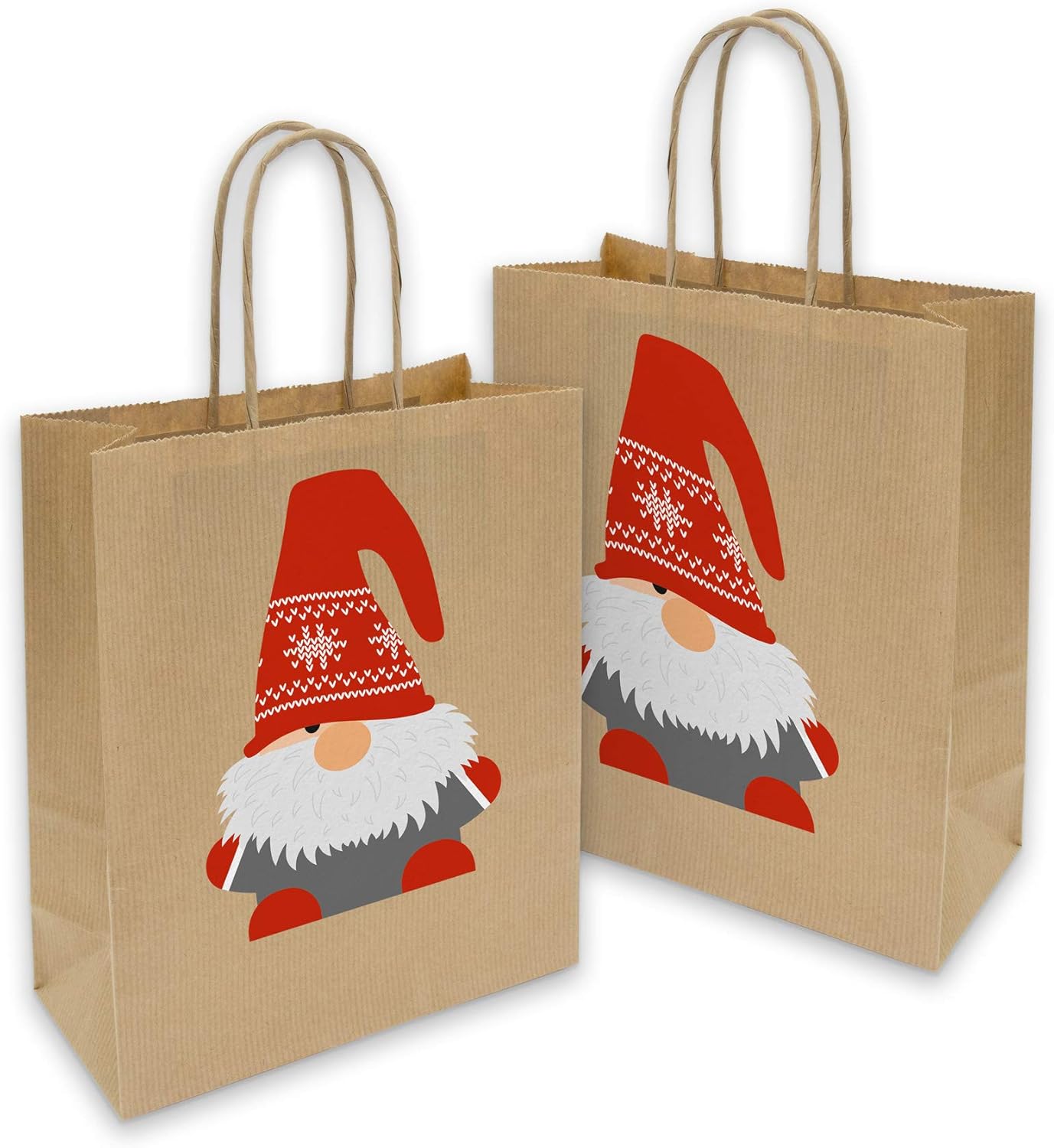 Borsa inferiore in carta kraft 90 g/m² opaca con manico in corda Colore: marrone Dimensioni 18x8x22 cm Grammatura carta: 90 g/m² per regali di Pasqua, regali di Natale, compleanni, piccoli regali, fatti in casa, biscotti, battesimi, comunioni, matrimoni, cresime e molto altro Consegnato in un set con 5 grandi adesivi con motivo di gnomi (itenga Wichtelbande)