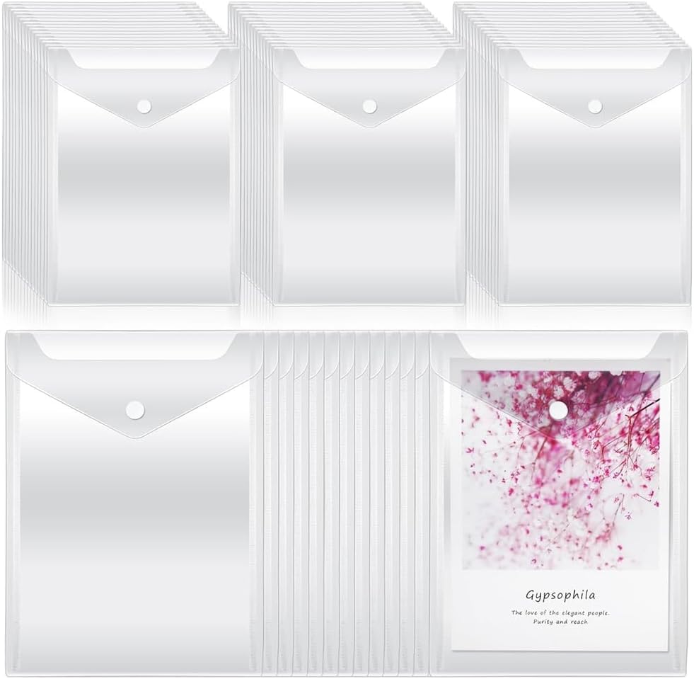 dimensioni per diversi utilizzi: un ottimo mix di dimensioni e funzionalità, ogni busta trasparente misura circa 9,44 x 7,08 pollici, offrendo ampio spazio per trasportare e proteggere documenti importanti, piccoli oggetti o articoli di cancelleria; Si prega di controllare la taglia prima di acquistare Chiudilo semplicemente: caratterizzata da un design con chiusura a scatto, facile da aprire e riporre, la busta per documenti in plastica fornisce un meccanismo di chiusura sicuro e problemi che mantiene i tuoi documenti al sicuro e intatti all'interno della busta; Il colore trasparente consente una visione facile e rapida del contenuto della busta, risparmiando così tempo prezioso mentre frughi nel tuo spazio di archiviazione Spesse e impermeabili: le tasche delle buste per album sono realizzate in materiale plastico affidabile, durevole, impermeabile e spesso, fornendo la protezione tanto necessaria ai tuoi documenti e documenti più importanti, Ricco di numeri: la confezione include 50 buste di plastica trasparente con chiusura a scatto, che possono proteggere i tuoi oggetti in modo più efficace; Ricchi in quantità, possono essere condivisi con i tuoi colleghi, compagni di classe o familiari Ampiamente applicabile: con la loro ampia applicabilità, le nostre tasche porta francobolli possono essere utilizzate per vari scopi: ufficio, scuola, casa, viaggio o semplicemente per riporre le tue necessità quotidiane; Perfetto per conservare timbri e fustelle, , contanti, foto, ricevute, fatture, documenti, quaderni, cartoline, lettere, inviti, biglietti di auguri e altro ancora