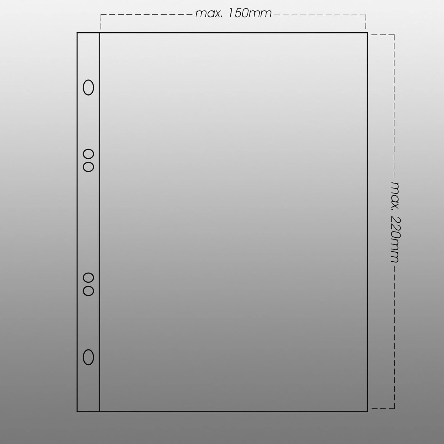 Per 1 o 2 fogli primo giorno o altri documenti in formato A5 (148 x 210 mm). In pellicola trasparente senza plastificanti, spessore 0,1 mm. Dimensioni esterne: 170 x 222 mm. Dimensioni borsa: 150 x 220 mm Perforazione compatibile con quasi tutti i sistemi comuni Fori combinati: 4 anelli 45-65-45 mm e 40-80-40 mm e 2 anelli 80 mm Distanza tra i fori