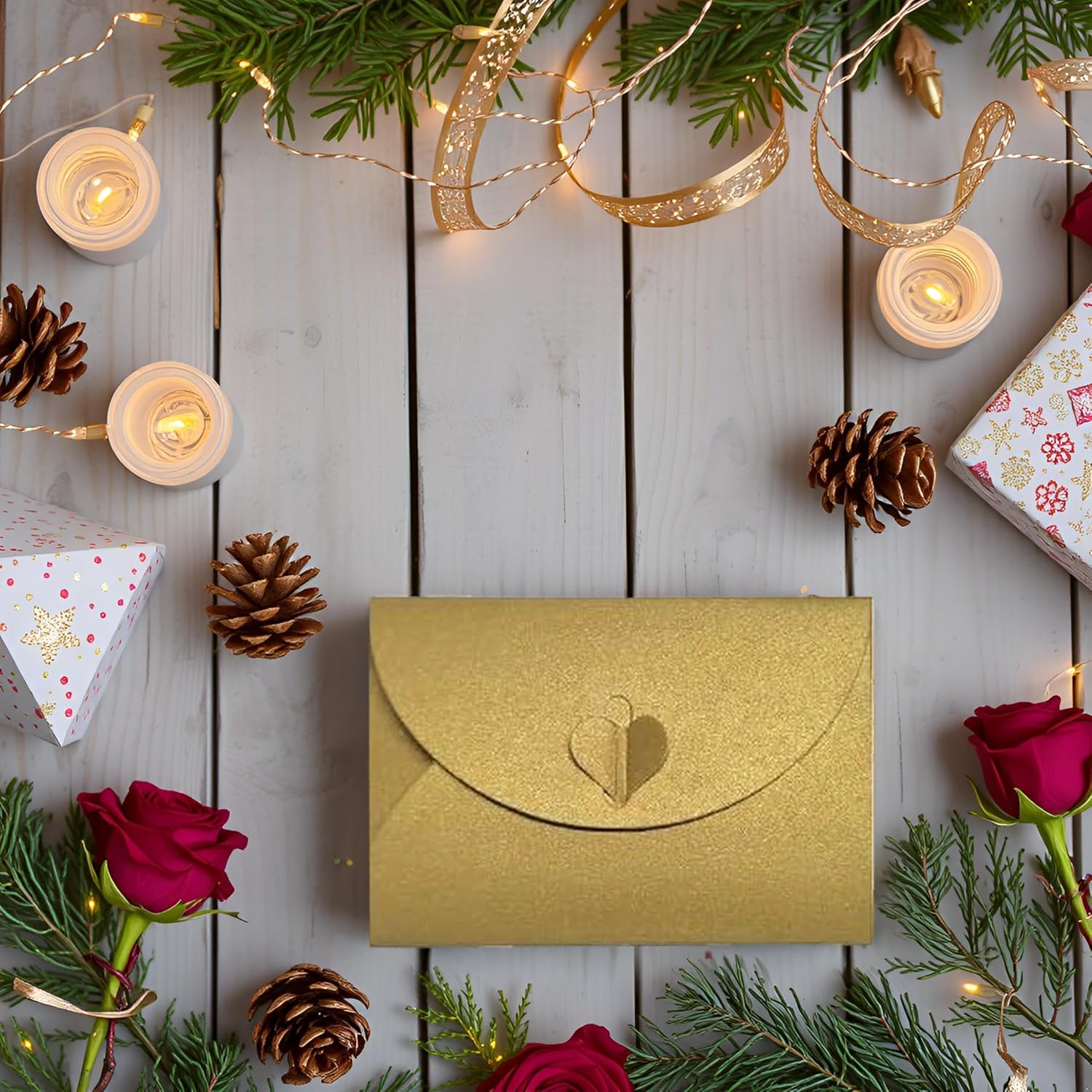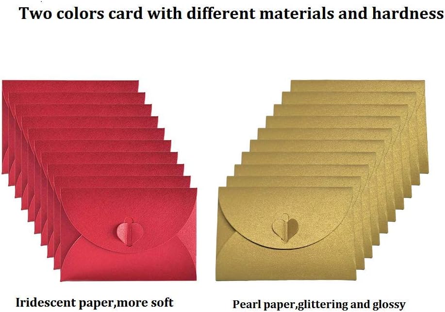 Materiale resistente: queste mini buste sono realizzate in carta iridescente (cartoncino rosso) e carta perlata (cartoncino dorato), queste buste di carta robusta non si rompono facilmente e sono in grado di proteggere i tuoi biglietti e lettere dalla deformazione e molto altro ancora. Formato mini e quantità: cartoncini fatti a mano con dimensioni di 10,5 x 7,2 cm da piegati, la confezione contiene 25 cartoncini rossi e dorati per regali. Si prega di controllare le dimensioni prima per verificare che i tuoi biglietti stiano nella busta. Design delicato: ogni busta ha una chiusura a forma di cuore che trasmette alle persone sensazioni di eleganza e delicatezza. Si prega di non strappare o tirare forte la chiusura, poiché strappare eccessivamente rovinerà l’aspetto della busta e la chiusura cadrà facilmente. Ampia gamma di utilizzi: l’oro e il rosso sono i colori delle festività e sono perfetti come segnaposto per feste di nozze, regali di compleanno, biglietti di auguri, biglietti di compleanno, inviti di nozze, etichette per ricevimenti di nozze e come mini portabiglietti di Natale o di San Valentino fai da te. Attenzione: cartoncini di due colori con materiali e durezza diversi, le buste non sono piegate, dovrai dare loro forma da solo, senza bisogno di attrezzi o colla, facili da usare.