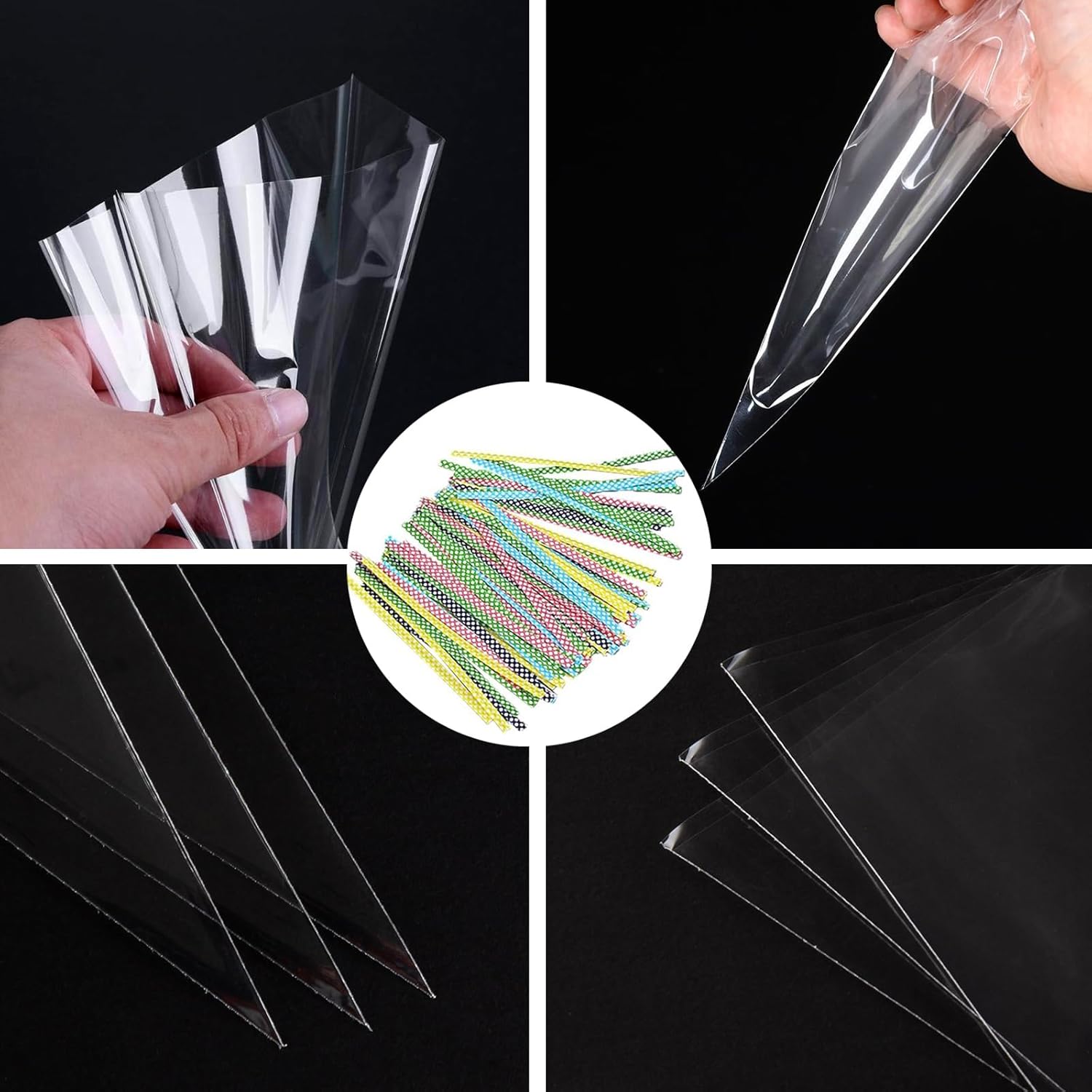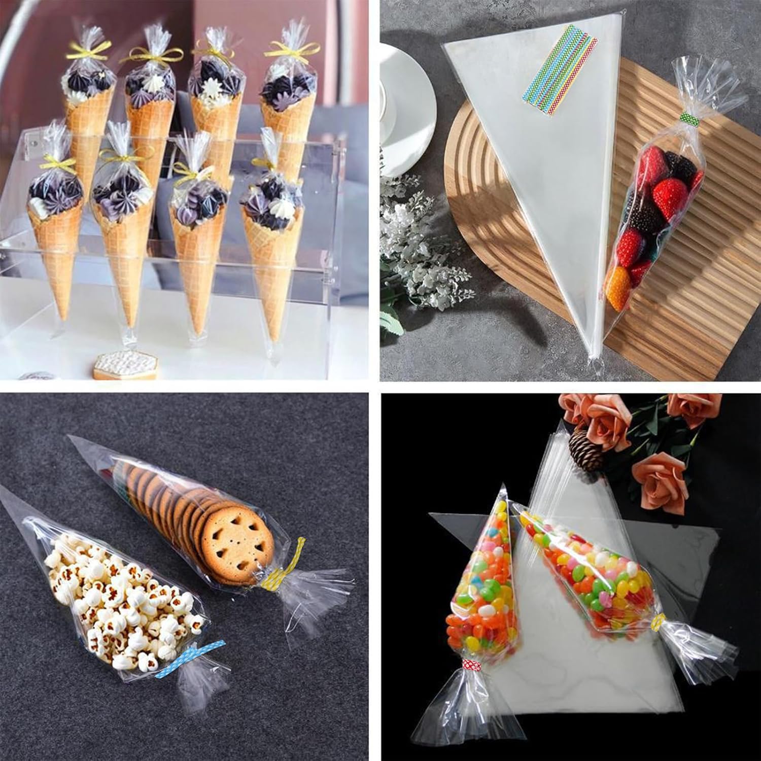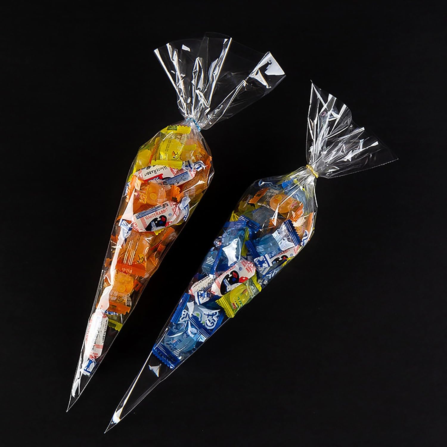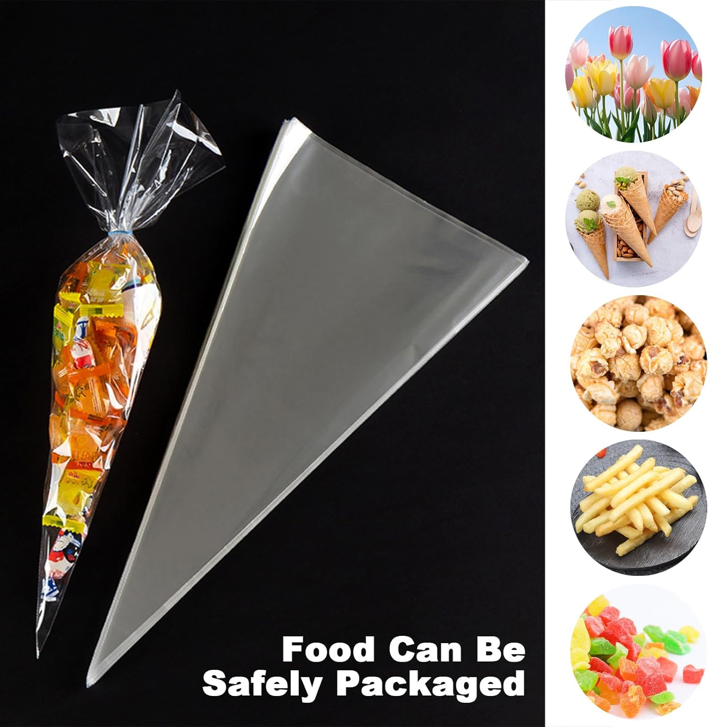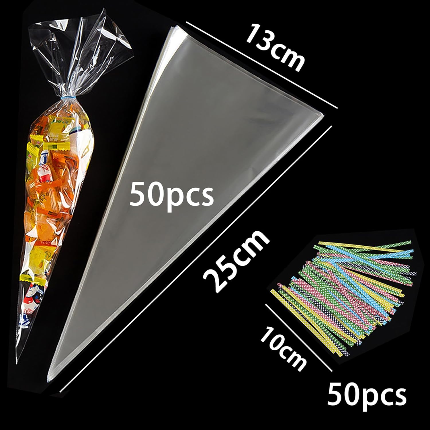 🍦Specifiche del prodotto: riceverai 50 pezzi di sacchetti a cono trasparenti + 50 pezzi di nastri colorati. La dimensione dei sacchetti trasparenti è di circa 13 x 25 cm (lunghezza x larghezza) e la lunghezza delle cinghie è di circa 10 cm. Una quantità sufficiente per soddisfare pienamente l'utilizzo della festa. 🍪Materiale robusto: il sacchetto trasparente a forma di cono è realizzato in materiale OPP di alta qualità, che è forte e durevole, sicuro e sano, ecologico e non tossico e può essere a diretto contatto con il cibo, così puoi confezionare in sicurezza biscotti, snack, piccoli regali, ecc. 🍬Come sac-à-poche: questo sacchetto trasparente ha la forma di un triangolo. Puoi usarlo come una tasca da pasticciere con una piccola apertura sulla punta (o usarlo con una punta da pasticciere) e spremere diversi modelli di crema o cagliata con i tuoi amici più grandi e i bambini. Strano, è una meravigliosa giornata di artigianato. 🍭Decorazione: Dopo aver riempito il sacchetto trasparente con gli oggetti, lega la bocca con una cravatta. Puoi modellare la bocca nella forma che desideri come decorazione. La cravatta colorata funge da decorazione. Sarà bello attaccarli al tuo tavolo da pranzo. Le tasche decorative rendono gli oggetti all'interno più sofisticati. 🍎Alta trasparenza: questo sacchetto di caramelle triangolare è completamente trasparente, puoi identificare rapidamente gli oggetti all'interno e può contenere molti tipi di cibo come torte, biscotti, biscotti, caramelle, cioccolatini, piccoli premi, ecc. Puoi usarli come confezioni regalo a Natale, matrimoni, feste di compleanno e altre feste.