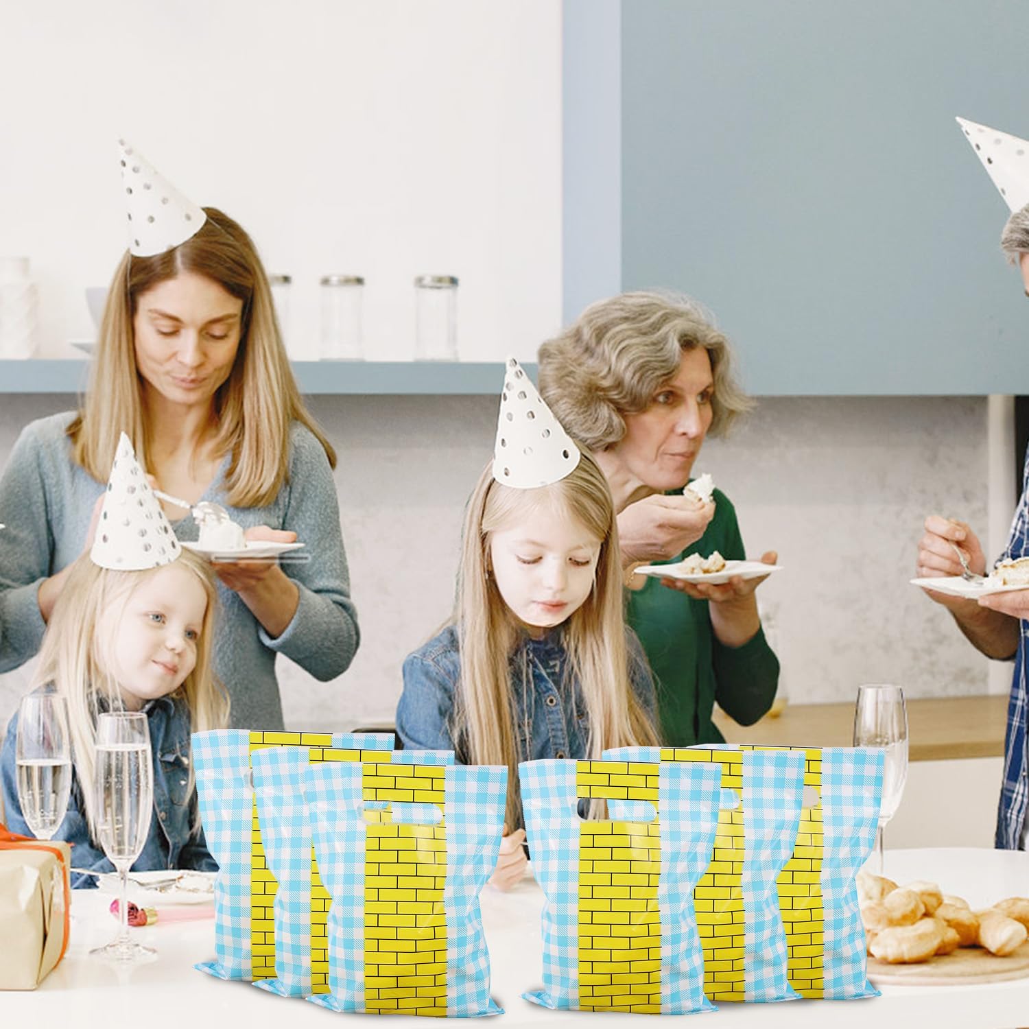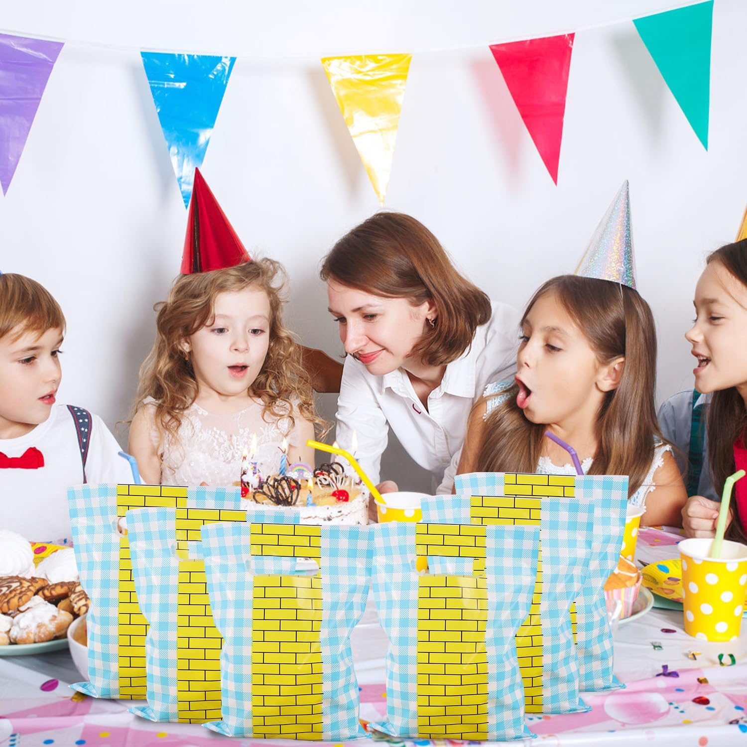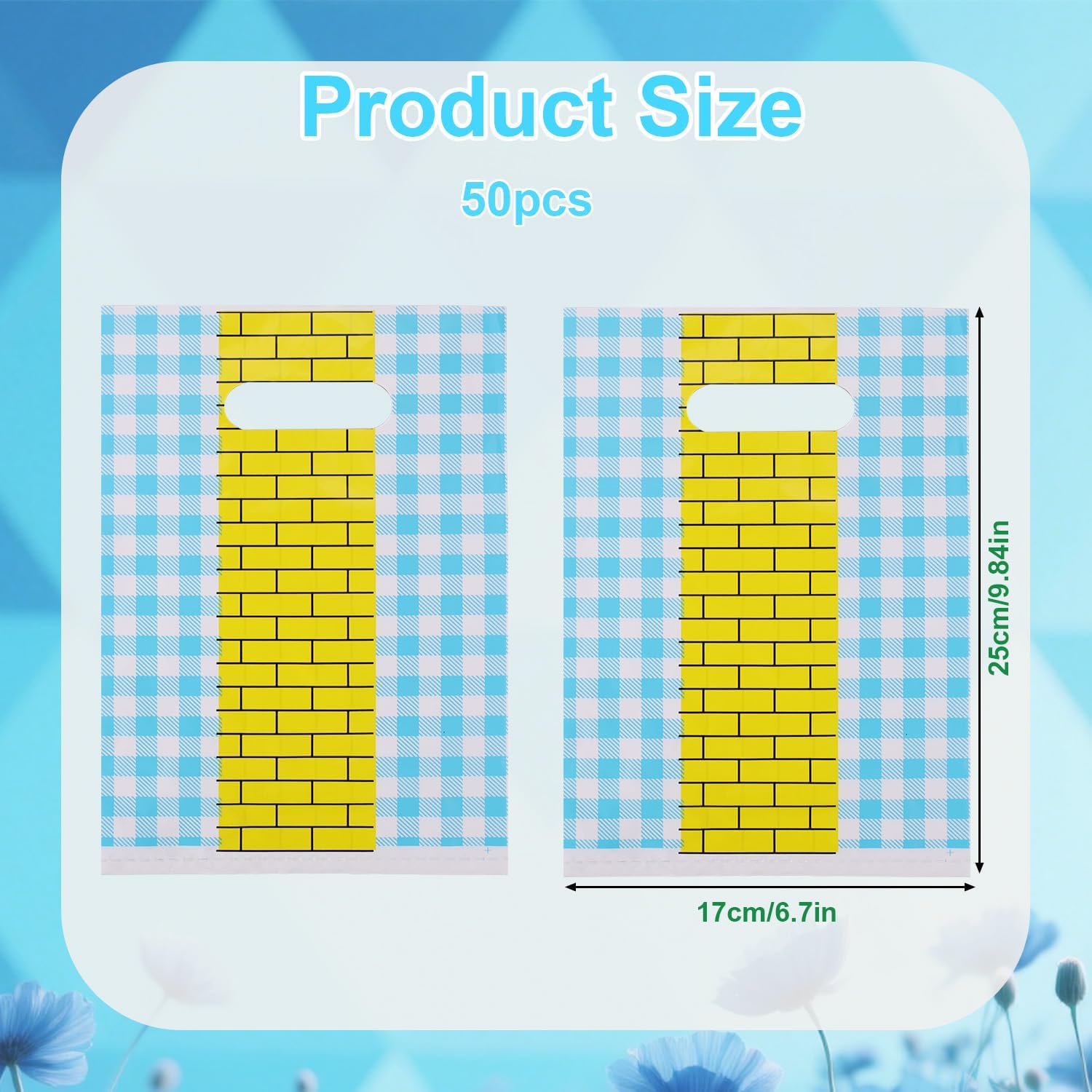 Elenchi dei pacchetti: il pacchetto include 50 sacchetti regalo in mattoni gialli, che misurano circa 25x17 cm. Quantità sufficiente per gli ospiti della festa, le sorprese in classe o gli eventi a tema. Design affascinante: la nostra borsa per bomboniere per feste magiche presenta un percorso di mattoni gialli brillanti con uno sfondo a quadretti blu, creando istantaneamente un'atmosfera magica da libro di fiabe. Perfetto per dare vita al tema della tua festa! Materiale del prodotto: realizzate in plastica di qualità, queste borse per bomboniere sono resistenti agli strappi, durevoli e leggere. Abbastanza forte da contenere varie caramelle, snack, giocattoli e piccoli regali. Design pratico: ogni borsa è dotata di una maniglia ritagliata per un facile trasporto, rendendola adatta ai bambini e perfetta per le bomboniere all'attrazione. Ampia applicazione: queste borse per snack aggiungono un tocco divertente e festoso all'arredamento del tuo evento. Ottimo per compleanni, feste in costume, feste di Halloween, eventi cosplay, celebrazioni a tema principessa, eventi scolastici, feste in classe, ecc.