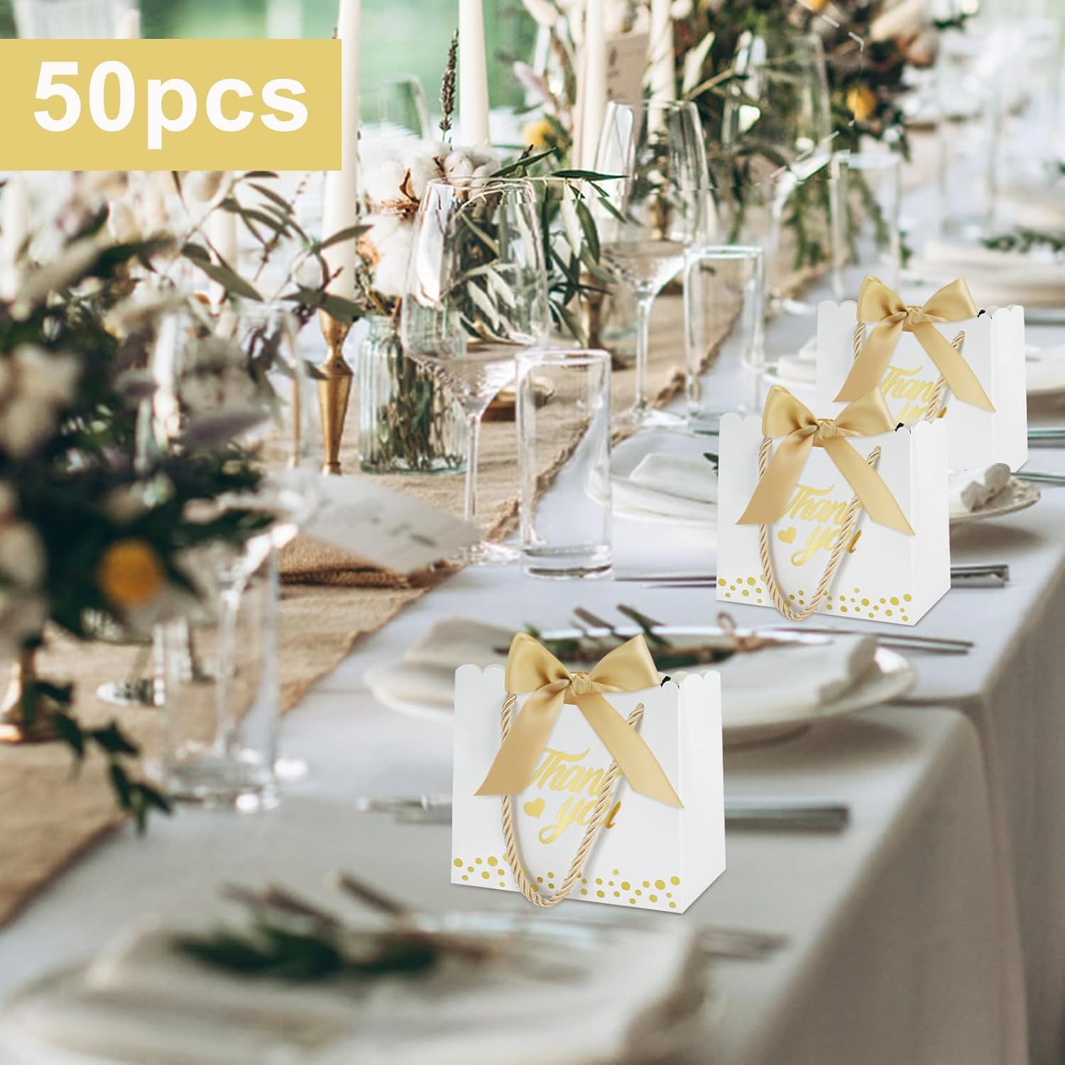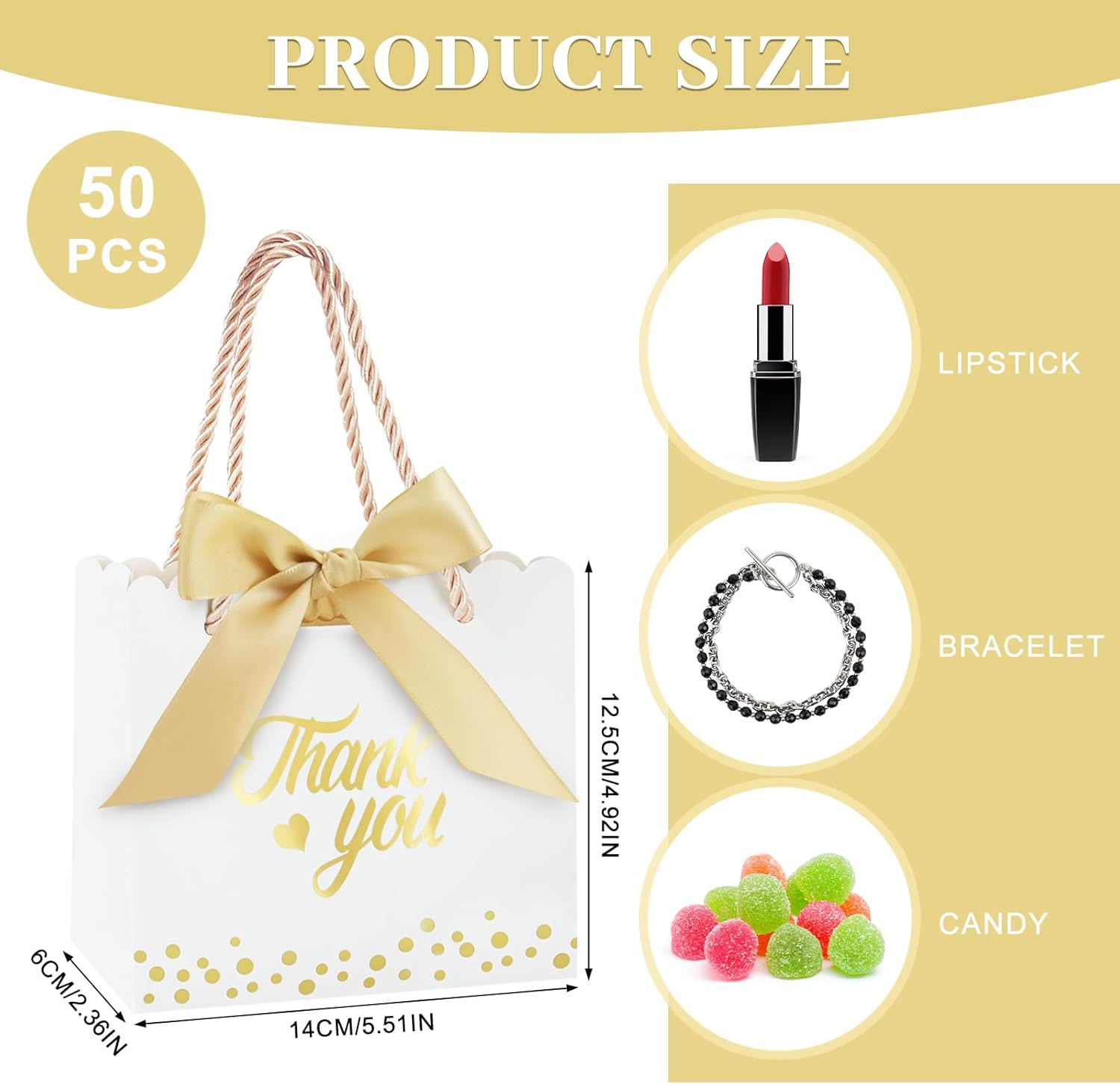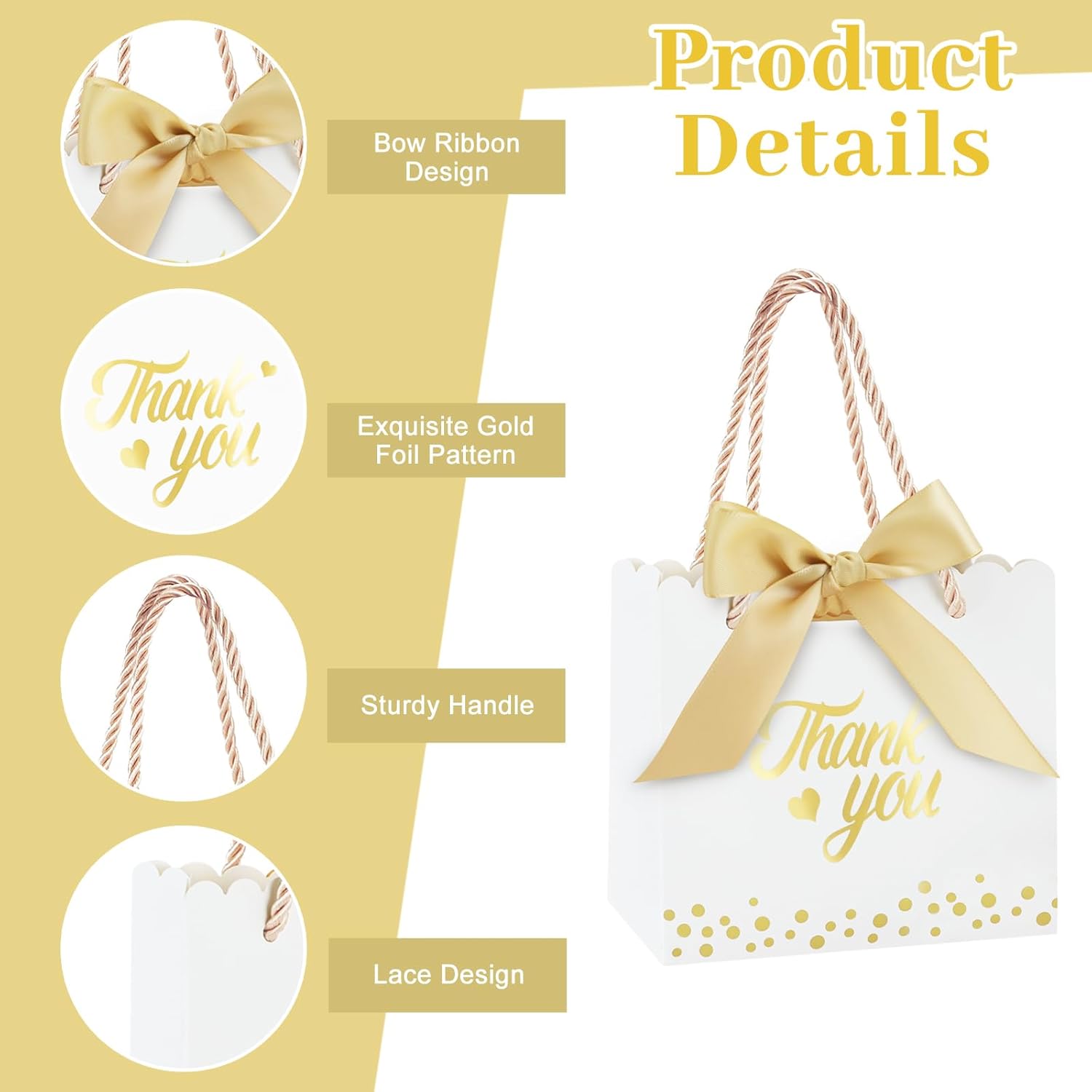 Il set include: migliora la tua esperienza di regali con il nostro set di sacchetti regalo di ringraziamento, il set comprende 50 sacchetti regalo dal design accattivante, 50 nastri morbidi con fiocco e 100 eleganti manici dorati. Questi sacchetti regalo sono adatti per ogni occasione e aggiungeranno glamour a qualsiasi regalo e renderanno ogni omaggio una sorpresa indimenticabile! 【Mini formato】Decorazione perfetta per piccoli regali! I mini sacchetti regalo di ringraziamento di caramelle nelle dimensioni 14×6×12,5 cm/5,51×2,36×4,92 pollici possono essere utilizzati per contenere rossetti, ombretti, braccialetti, collane, caramelle, cioccolato, biscotti, saponi fatti a mano e così via. Questi piccoli e deliziosi sacchetti per bomboniere non solo aggiungono mistero al regalo, ma fanno anche sentire al destinatario il tuo pieno amore. 【Design elegante】 Questa borsa regalo di ringraziamento è progettata con stampa a caldo su entrambi i lati, la parola "Grazie" con un affascinante motivo a cuore e delicati punti dorati aggiunge colore alla borsa regalo e l'esclusivo design in pizzo rende la borsa regalo più squisita. Inoltre la decorazione del nastro rende il tuo regalo elegante, lussuoso e accattivante. 【Materiali di qualità】 I nostri sacchetti regalo di ringraziamento sono realizzati in cartone robusto, che è durevole e garantisce che i tuoi tesori siano al sicuro e protetti senza preoccuparti di strappi o rotture. La tracolla robusta e comoda offre ulteriore comodità per trasportare i tuoi regali. 【Multiuso】Questi sacchetti regalo eleganti e alla moda non sono adatti solo per confezionare regali, ma aggiungono anche un tocco romantico alla tua festa. Che tu stia partecipando a un banchetto o a una festa, puoi usarlo per decorare, mettere regali o abbinarlo a te stesso. Inoltre, sono adatti anche per baby shower, ricevimenti di nozze, vacanze e altre occasioni, rendendo più semplice e conveniente incartare i regali.