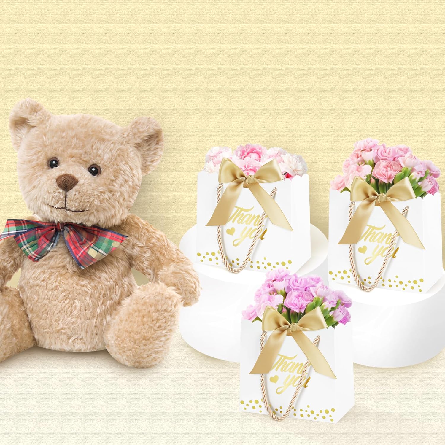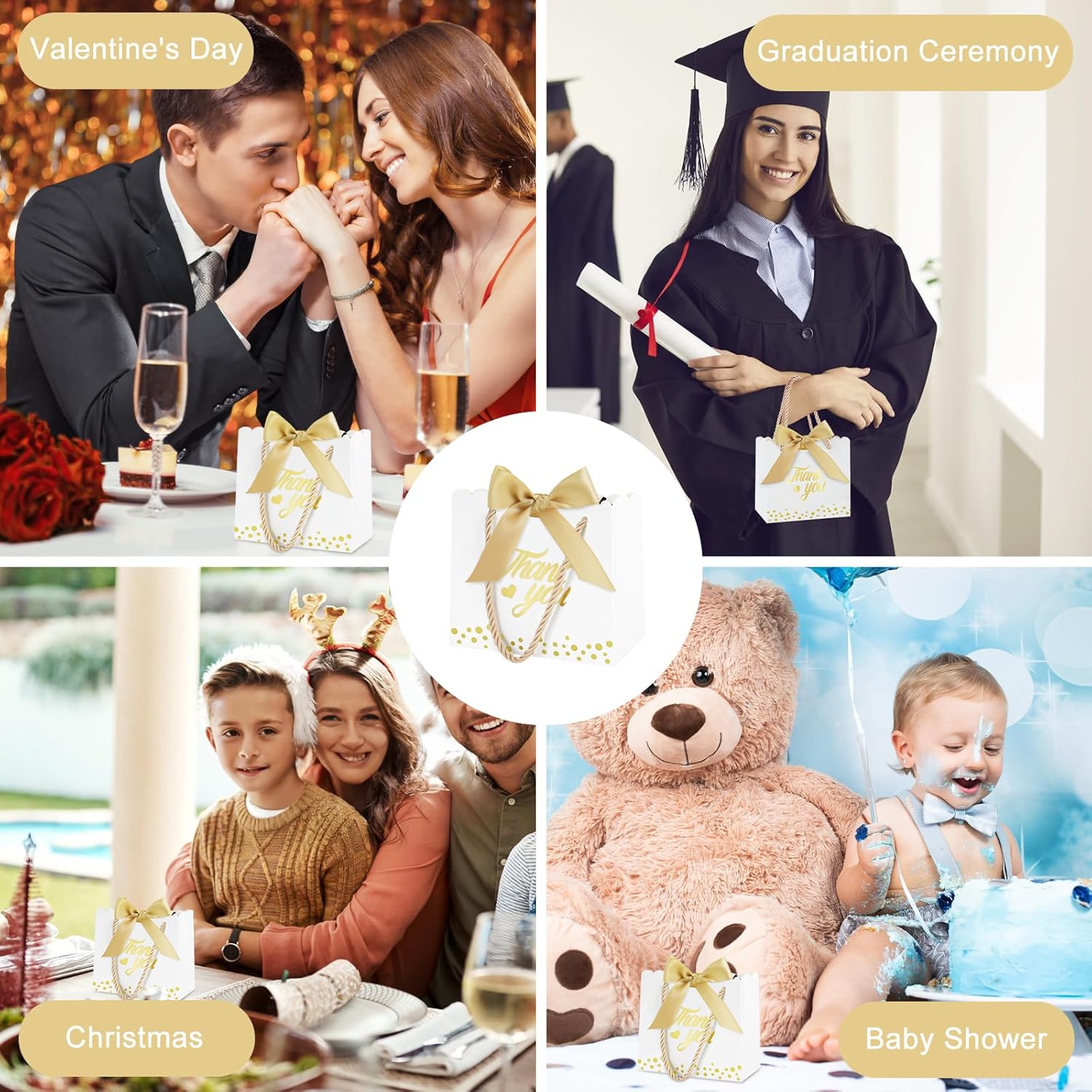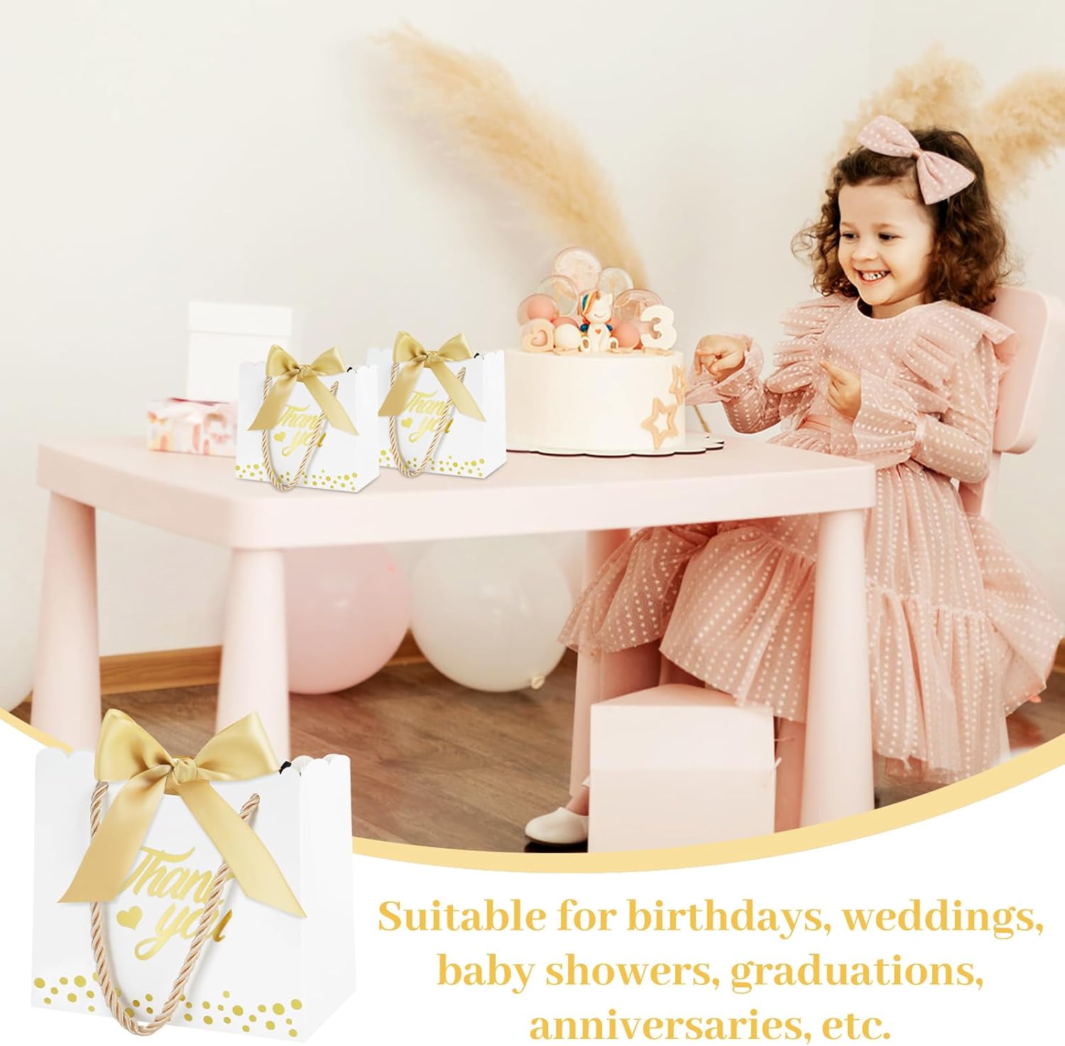 Il set include: migliora la tua esperienza di regali con il nostro set di sacchetti regalo di ringraziamento, il set comprende 50 sacchetti regalo dal design accattivante, 50 nastri morbidi con fiocco e 100 eleganti manici dorati. Questi sacchetti regalo sono adatti per ogni occasione e aggiungeranno glamour a qualsiasi regalo e renderanno ogni omaggio una sorpresa indimenticabile! 【Mini formato】Decorazione perfetta per piccoli regali! I mini sacchetti regalo di ringraziamento di caramelle nelle dimensioni 14×6×12,5 cm/5,51×2,36×4,92 pollici possono essere utilizzati per contenere rossetti, ombretti, braccialetti, collane, caramelle, cioccolato, biscotti, saponi fatti a mano e così via. Questi piccoli e deliziosi sacchetti per bomboniere non solo aggiungono mistero al regalo, ma fanno anche sentire al destinatario il tuo pieno amore. 【Design elegante】 Questa borsa regalo di ringraziamento è progettata con stampa a caldo su entrambi i lati, la parola "Grazie" con un affascinante motivo a cuore e delicati punti dorati aggiunge colore alla borsa regalo e l'esclusivo design in pizzo rende la borsa regalo più squisita. Inoltre la decorazione del nastro rende il tuo regalo elegante, lussuoso e accattivante. 【Materiali di qualità】 I nostri sacchetti regalo di ringraziamento sono realizzati in cartone robusto, che è durevole e garantisce che i tuoi tesori siano al sicuro e protetti senza preoccuparti di strappi o rotture. La tracolla robusta e comoda offre ulteriore comodità per trasportare i tuoi regali. 【Multiuso】Questi sacchetti regalo eleganti e alla moda non sono adatti solo per confezionare regali, ma aggiungono anche un tocco romantico alla tua festa. Che tu stia partecipando a un banchetto o a una festa, puoi usarlo per decorare, mettere regali o abbinarlo a te stesso. Inoltre, sono adatti anche per baby shower, ricevimenti di nozze, vacanze e altre occasioni, rendendo più semplice e conveniente incartare i regali.