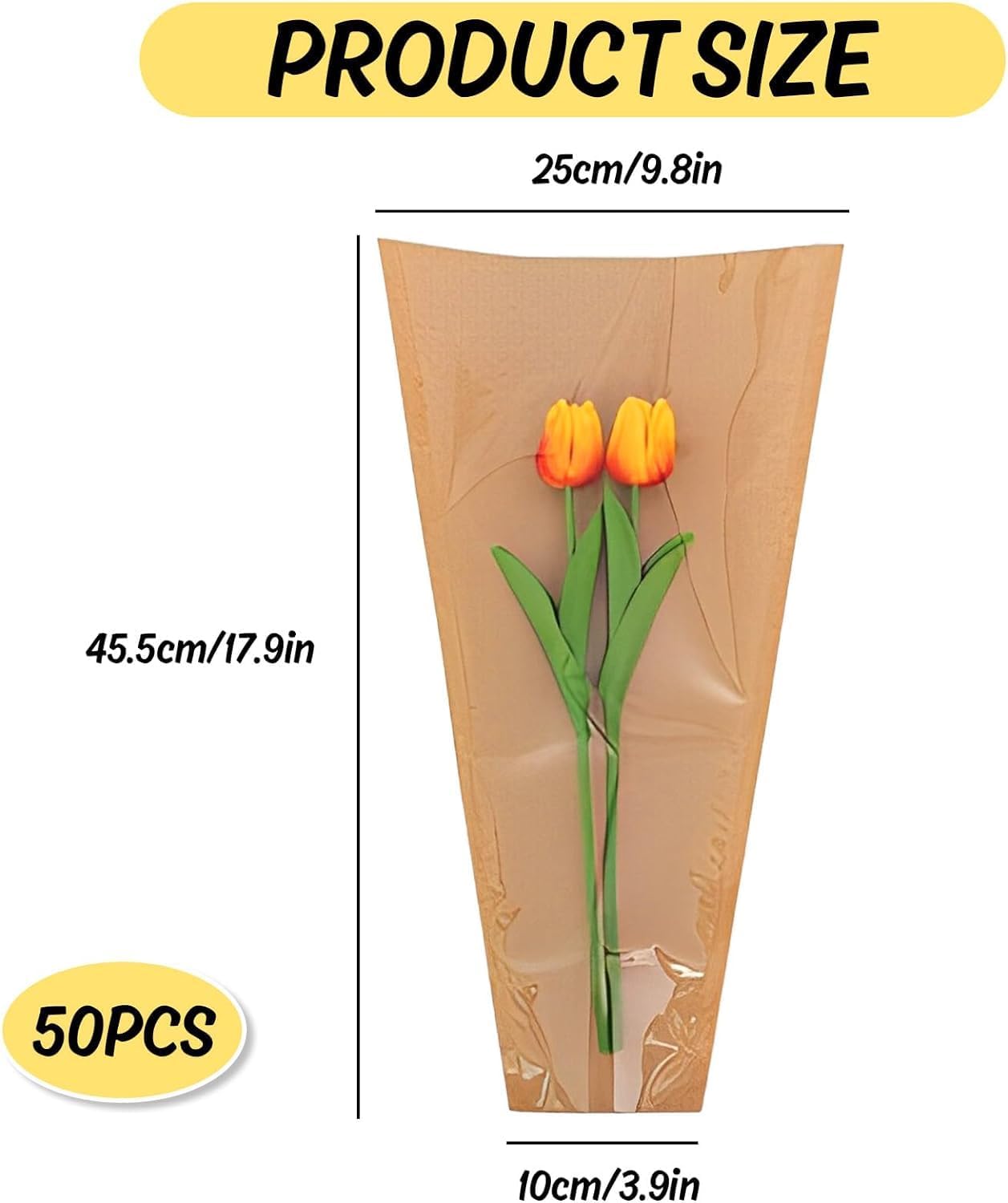 Il pacchetto include: riceverai sacchetti di fiori da 50 pezzi per mazzi, la quantità è sufficiente per soddisfare le tue esigenze di utilizzo quotidiano e di sostituzione e potrai anche condividerli con i tuoi amici e colleghi. Materiale eccellente: la borsa per pannolini con bouquet di fiori è realizzata in materiale di alta qualità, con un design trasparente sul davanti, puoi vedere il fascino dei fiori e carta kraft sul retro per proteggere i fiori, aumentare l'atmosfera festosa e rendere i tuoi fiori più delicati. DIMENSIONE GIUSTA - Questi sacchetti di fiori misurano ca. 25 x 10 x 45,5 cm, di grandi dimensioni per confezionare più fiori, rendi i tuoi fiori accattivanti. Design delicato - La copertura del fiore è progettata con finestra trasparente e sfondo marrone, squisita e bella, aggiunge bellissime aggiunte ai tuoi fiori, adatta per rose, garofani, tulipani e altri fiori. AMPIE APPLICAZIONI: Questi sacchetti per bouquet di fiori possono essere ampiamente utilizzati da fioristi, forniture per composizioni floreali, feste di compleanno, festa della mamma, San Valentino, lauree, matrimoni, ecc., aggiunte e decorazioni ideali per la tua casa.