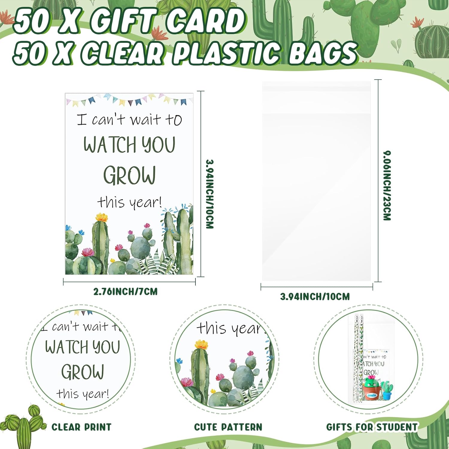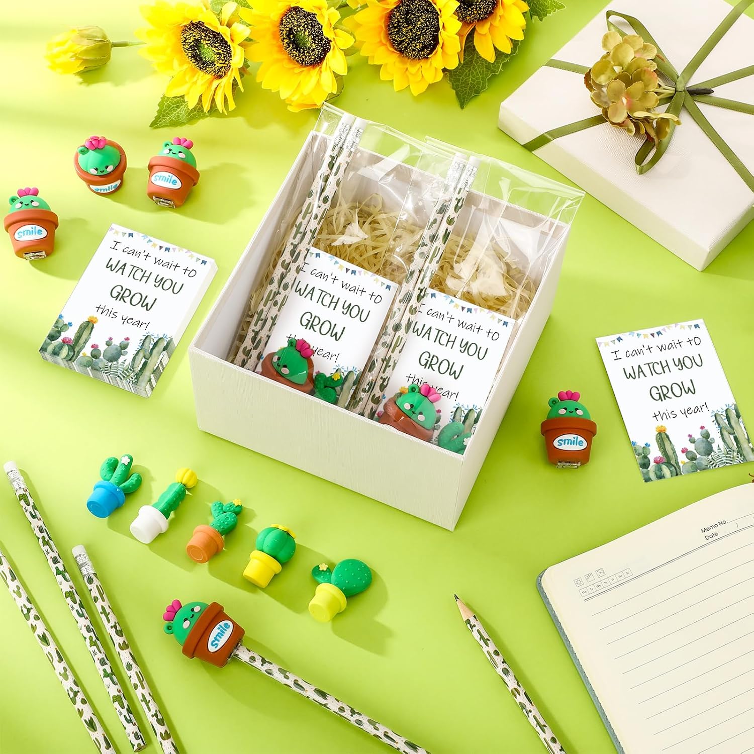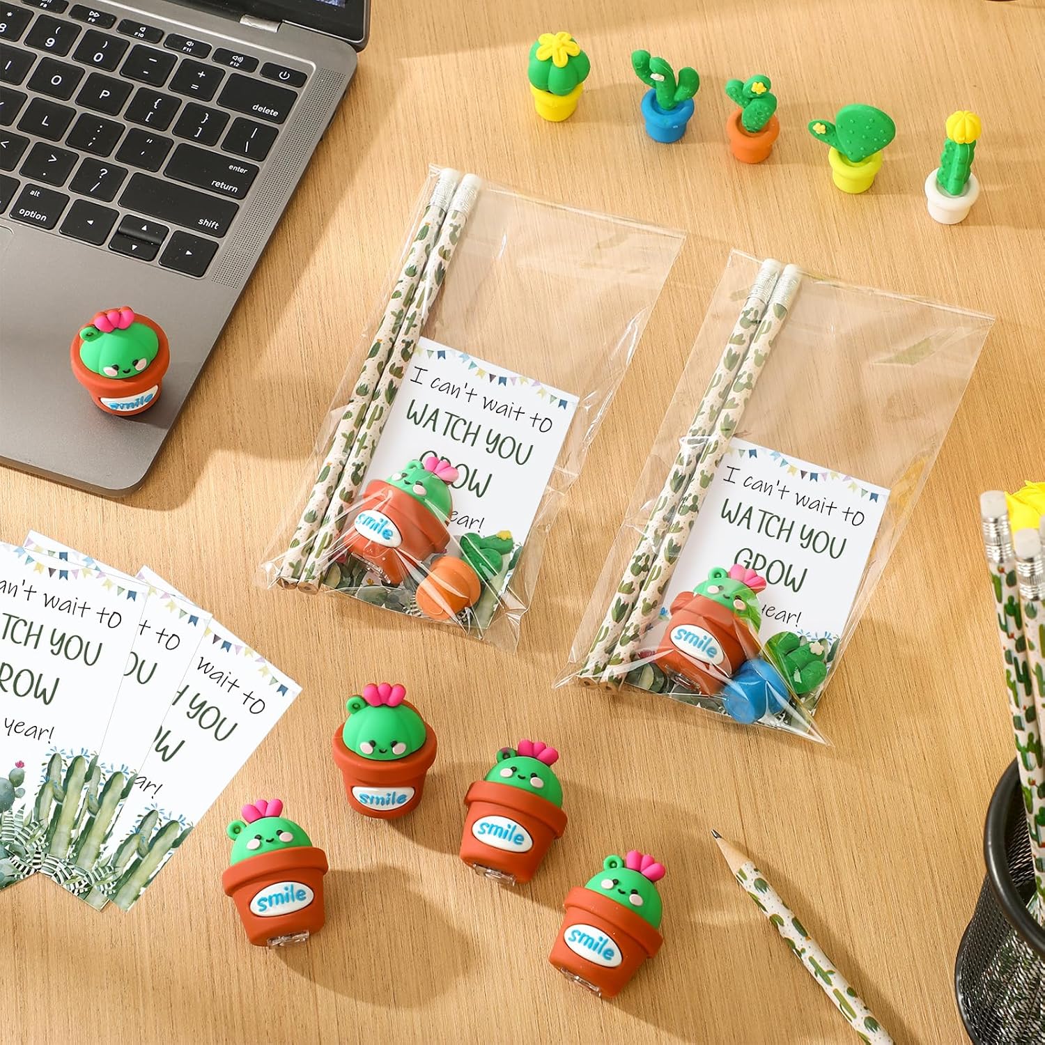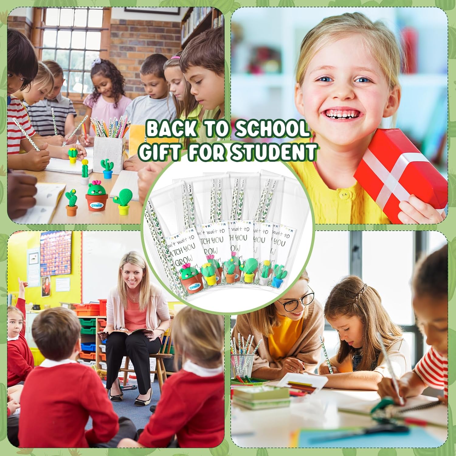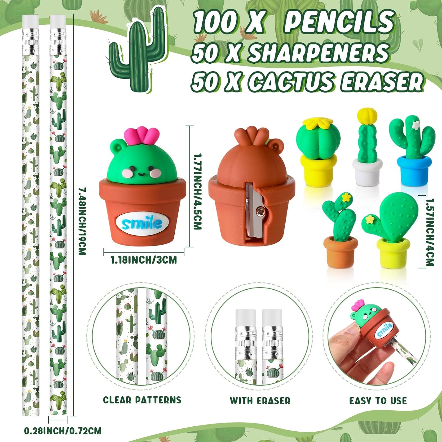 Bella combinazione per te: con 100 matite a cactus, 50 carte, 60 sacchetti in opp, 50 temperamatite a forma di cactus e 50 gomme a forma di cactus incluse nella confezione; quantità abbondante può soddisfare i tuoi diversi utilizzi, che possono essere applicati per il ritorno a scuola o il primo giorno di scuola Affidabili da usare: le nostre matite cactus sono realizzate in robusto corpo in legno, il biglietto è realizzato in carta patinata da 250 g che aggiunge un tocco di classe mentre la gomma è realizzata in materiale TPR, i sacchetti sono realizzati in opp, prestando alla loro trasparenza e capacità impermeabili Dimensioni ideali: la matita per piante misura circa 19 x 0,72 cm, le gomme misurano circa 4 cm, i biglietti misurano circa 7 x 10 cm, i sacchetti in polipropilene orientato misurano circa 10 x 10 cm. x 23 cm. Il temperamatite a forma di cactus misura circa 4,5 x 3 cm, dimensioni portatili per comodità Verdi rinfrescanti per un inizio vivace: i nostri regali per il ritorno a scuola non riguardano solo la funzionalità, ma anche l'estetica; il nostro colore principale è il verde, rispecchia non solo il colore di un cactus, ma anche il colore della crescita, della freschezza e del rinnovamento; questo lo rende un ideale primo giorno di scuola cactus decorazione in classe, portando sorrisi ai volti degli studenti Multiuso e alla moda: questi regali per il primo giorno di scuola non sono solo limitati al rientro a scuola, funzionano come cancelleria per l'ufficio o possono aggiungere un tocco festivo a qualsiasi festa o evento con il loro stile alla moda; questo li rende un regalo versatile e ideale per i bambini che cresceranno per trovare numerosi usi in più impostazioni