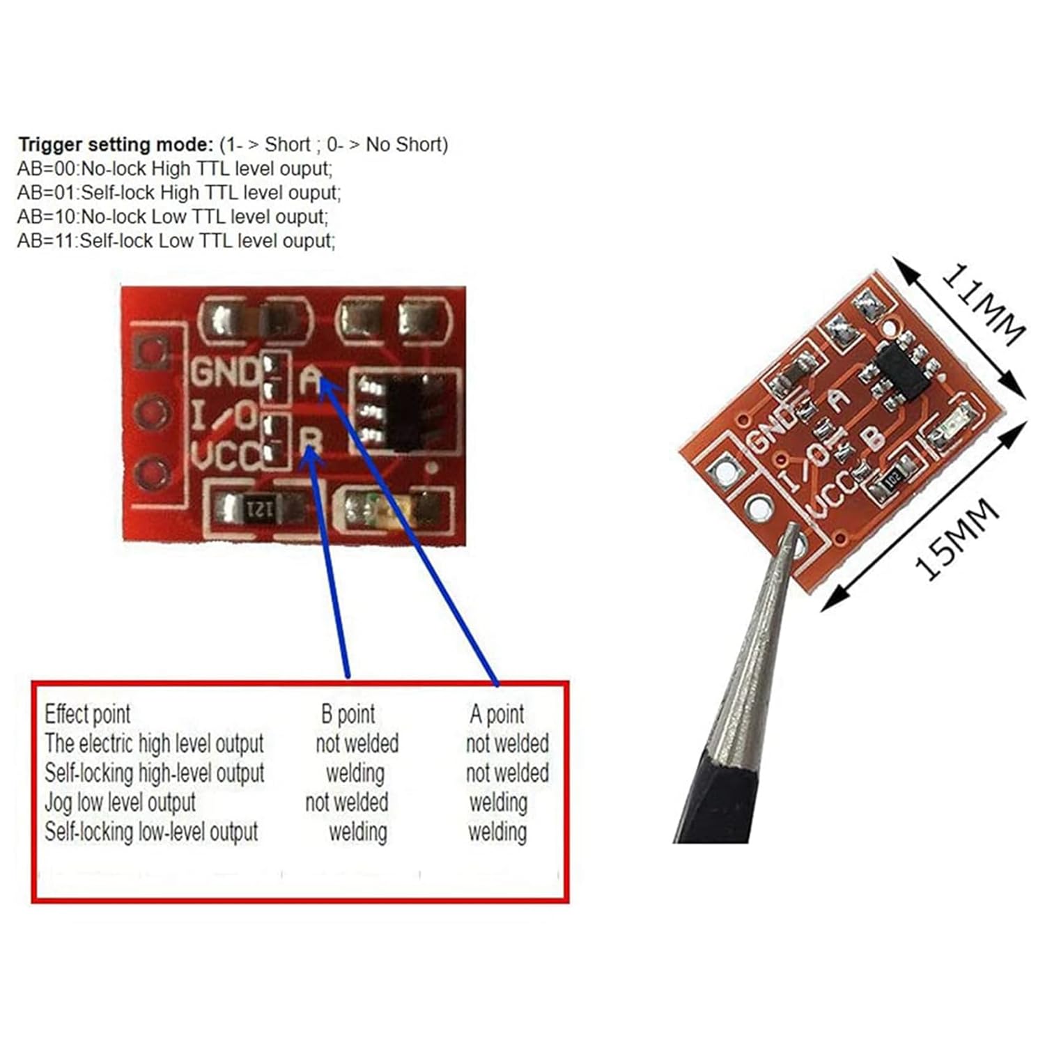 Alimentazione: 2,5 V-5,5 V/2 W Il modulo è basato su un modulo interruttore touch capacitivo IC TTP223 sensibile al tocco. Modalità di regolazione trigger: (1- Maggiore di Breve; 0- Maggiore di Nessun corto) Effetto di utilizzo: AB = 00: nessun blocco con uscita TTL livello; AB = 01: uscita autobloccante con livello TTL; AB = 10: nessun blocco a bassa uscita TTL; AB = 11: uscita autobloccante a basso livello TTL Modulo interruttore a sfioramento del corpo umano per sostituire i tradizionali di commutazione diretta.