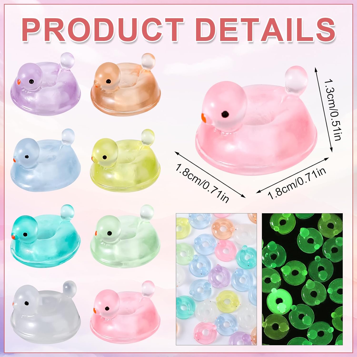 Prodotto incluso: riceverai 50 pezzi di mini anelli di nuoto luminosi in un pacchetto, quantità sufficiente per soddisfare le tue varie esigenze, come la mano fai -da -te, la creazione di micro paesaggi. Materiale affidabile: realizzato con materiale in resina superiore, il piccolo bagliore nell'anatra scuro è liscio a toccare, impermeabile, non facile da rompere o sbiadire, che può trattenere il suo bel colore e look carino per molto tempo. Design unico: prendendo l'anello di nuoto e le mini anatra di resina come tema del design, abbiamo progettato e realizzato queste mini anatre di resina ad anello di nuoto che possono brillare nel buio.Ci sono 7 colori, bianco, rosa, blu, giallo, viola, verde, arancione. Dimensione del prodotto: ogni anatra di micro resina luminosa misura circa 1,8x1,8x1,3 cm, dimensioni molto minuscole che possono essere impostate su qualsiasi punto, aggiungendo una sorta di ambiente estivo e divertimento per la tua casa delle bambole, bonsai ecc. Ampia applicazione: le nostre mini anelli di nuoto luminose possono essere utilizzate per decorare la casa delle bambole, il mini giardino, i bonsai, il terrario, il micro paesaggio.Può anche essere applicato per creare artigianato, come braccialetto, ciondoli, forcine e altro ancora.È un regalo molto carino per i tuoi amici che amano creare un mondo in miniatura.