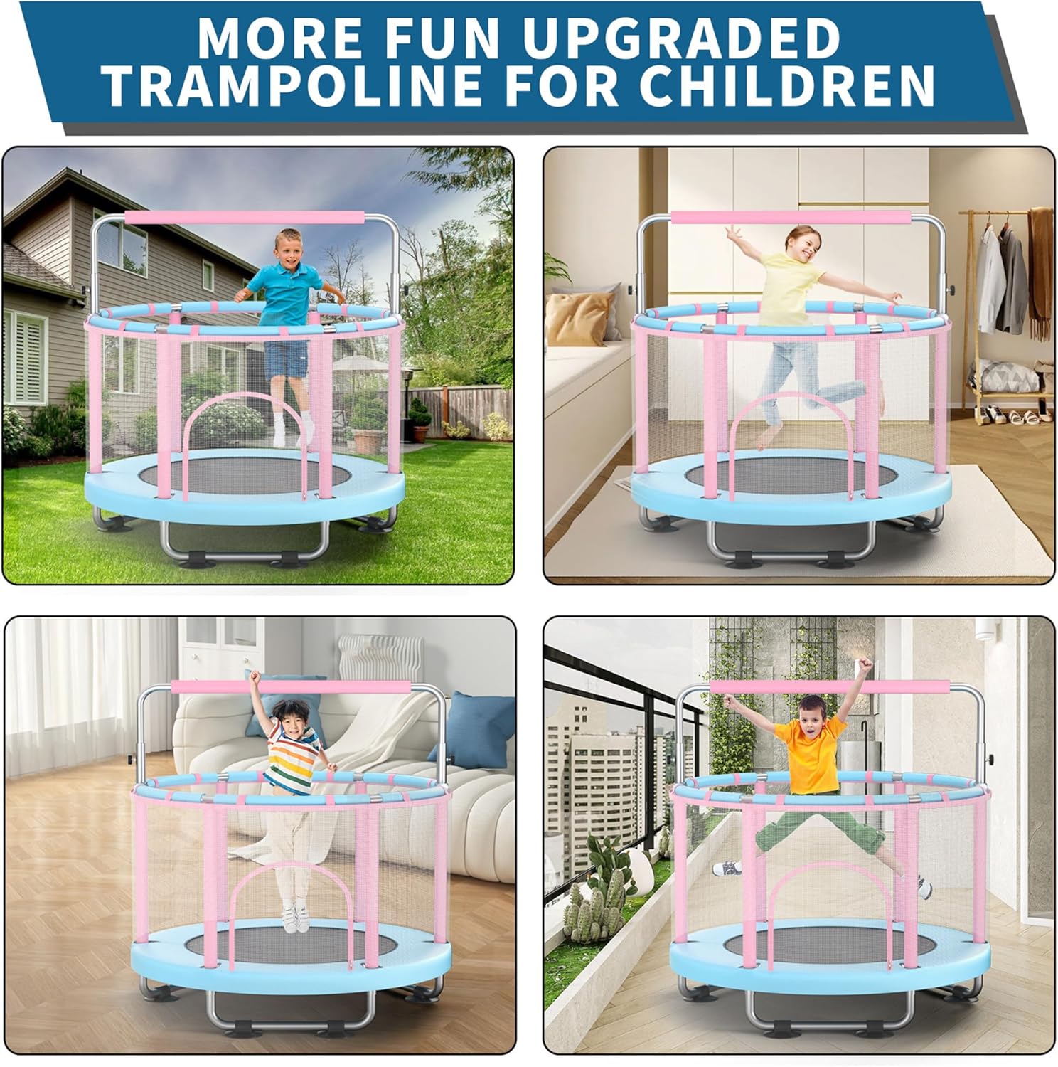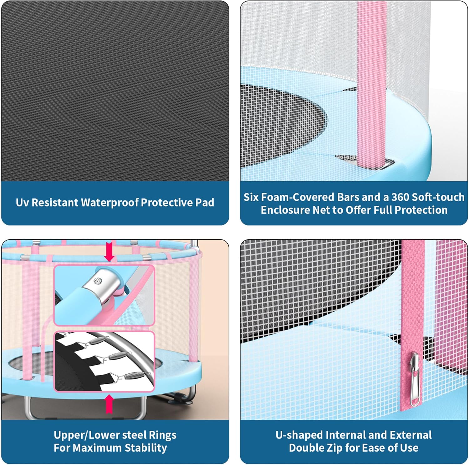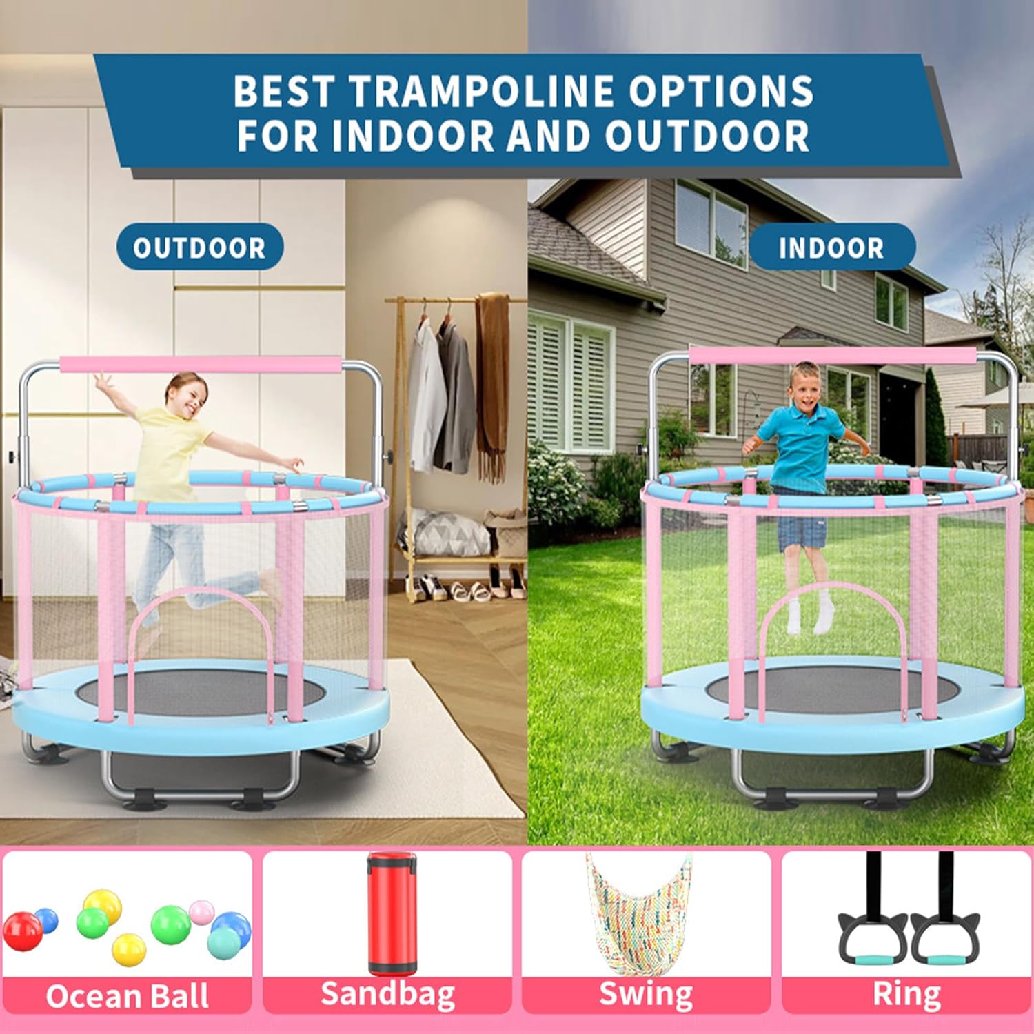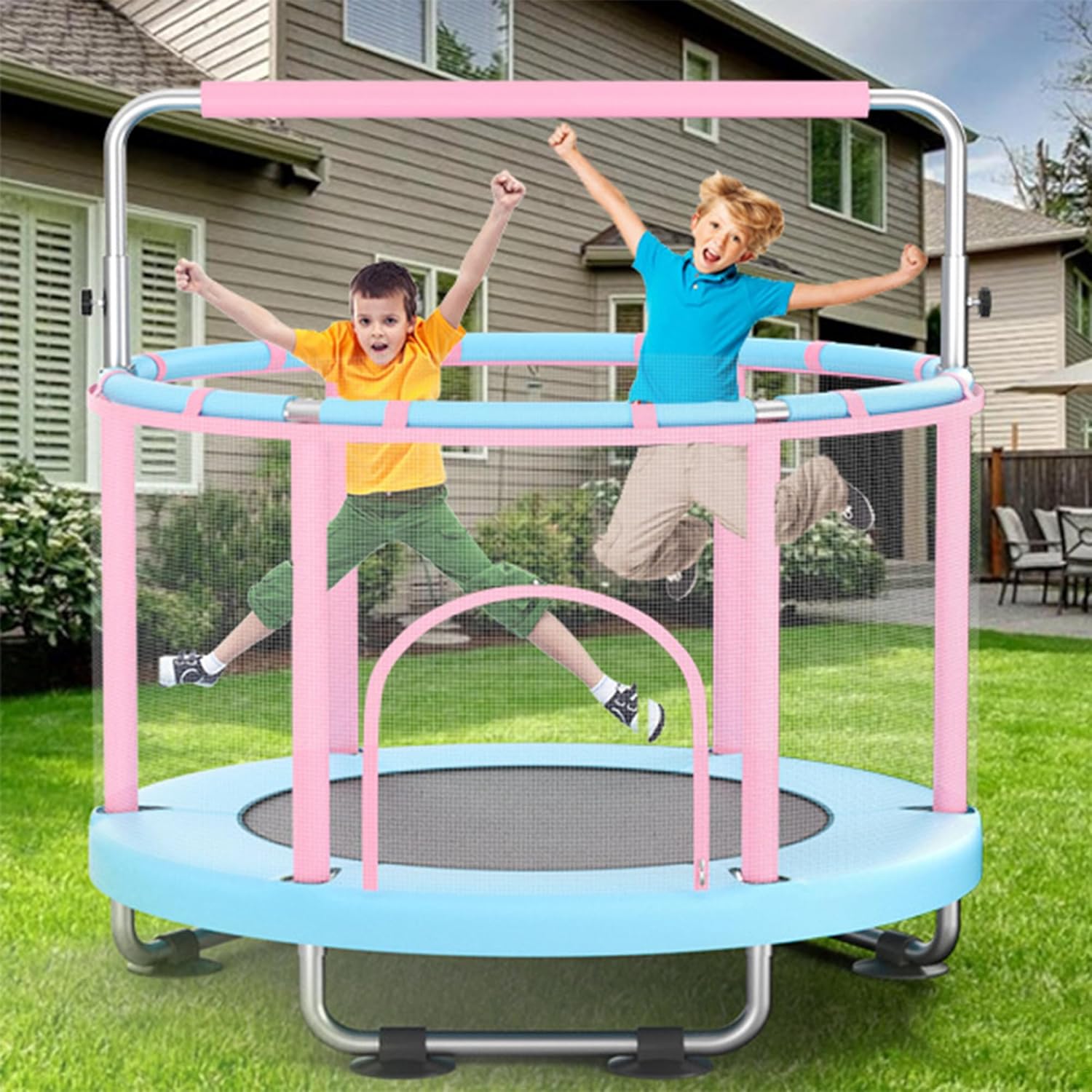Eccezionale esperienza di rimbalzo: con sorgenti trattate con calore ad alta resistenza per un rimbalzo robusto e resistente. Dotato di una barra regolabile a tre posizioni per adattarsi a diverse fasce d'età, aiutando i bambini a sviluppare capacità motorie e rilasciare energia attraverso il gioco. Struttura di sicurezza robusta: il design a base di treppiede rinforzata a U a forma di USing di scivolamento e movimento, mentre il telaio in acciaio in lega offre resistenza alla ruggine e durata. La struttura anti-tip a forma di C subisce test di sicurezza completi, supportando fino a 440 libbre. La base presenta scilpini silenziosi che proteggono il pavimento. Design di protezione a tutto tondo: una rete di sicurezza trasparente, inodore e facile da pulire. Sei maniglie avvolte in schiuma ispessita. Una barriera circolare fornisce una protezione completa, impedendo a mani o piedi di intrappolare. Ciò consente ai genitori la tranquillità mentre i bambini saltano. Assemblaggio comodo e ampi accessori: include istruzioni dettagliate e strumenti di installazione a molla. Viene fornito con sacchi di sabbia gratuiti, palline oceaniche, un'altalena e anelli. È caratterizzata l'installazione diagonale a molla per un assemblaggio senza sforzo, adatto all'uso interno/esterno da parte di bambini di età compresa tra 3 e 12 anni. Scelta a regali multi-scenario: il design aggiornato da 55 pollici offre flessibilità interna/esterna, rendendolo un regalo ideale per i bambini. Diversi accessori divertenti creano un ambiente di gioco sicuro, promuovendo lo sviluppo fisico e cognitivo nei bambini piccoli.