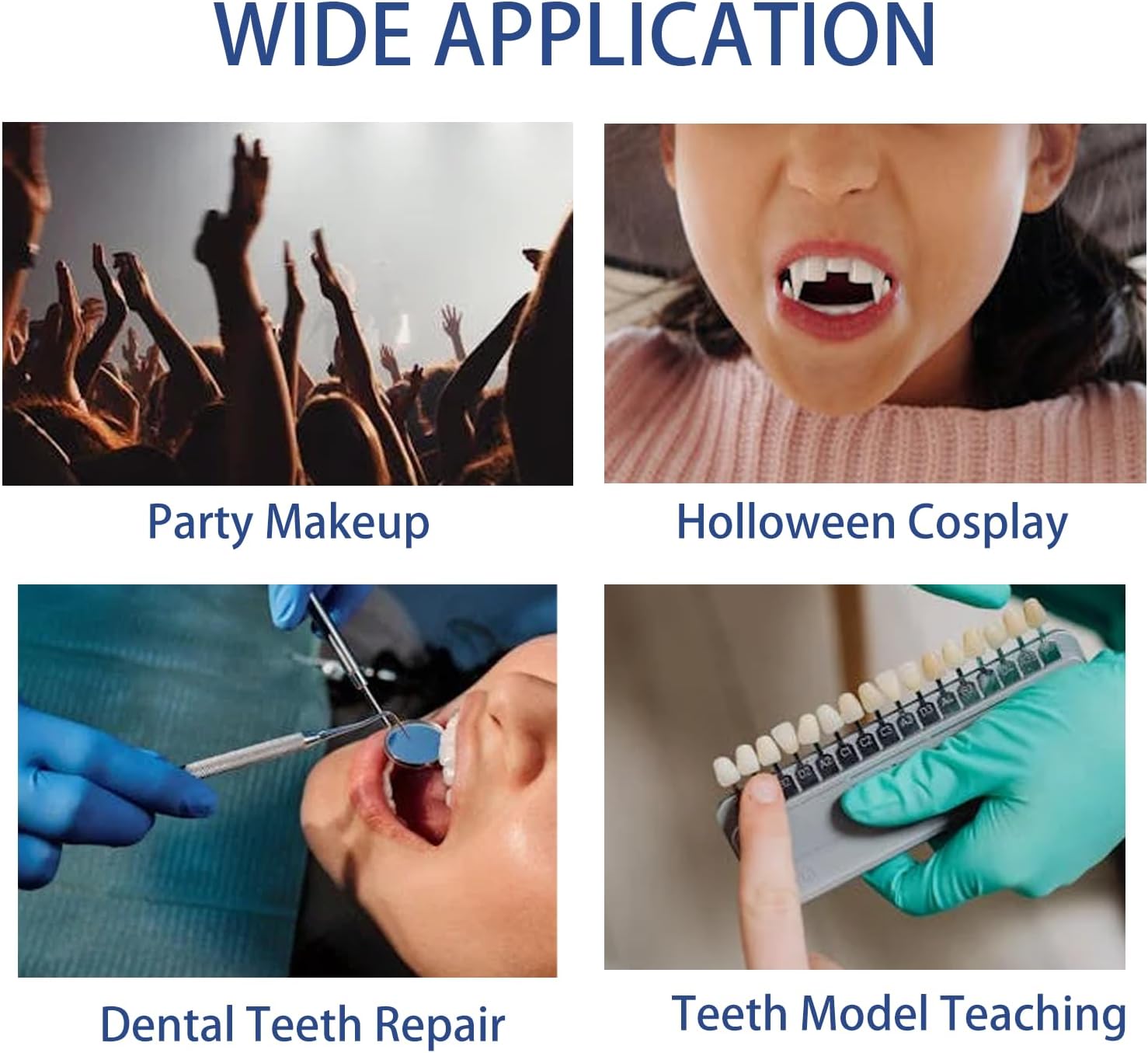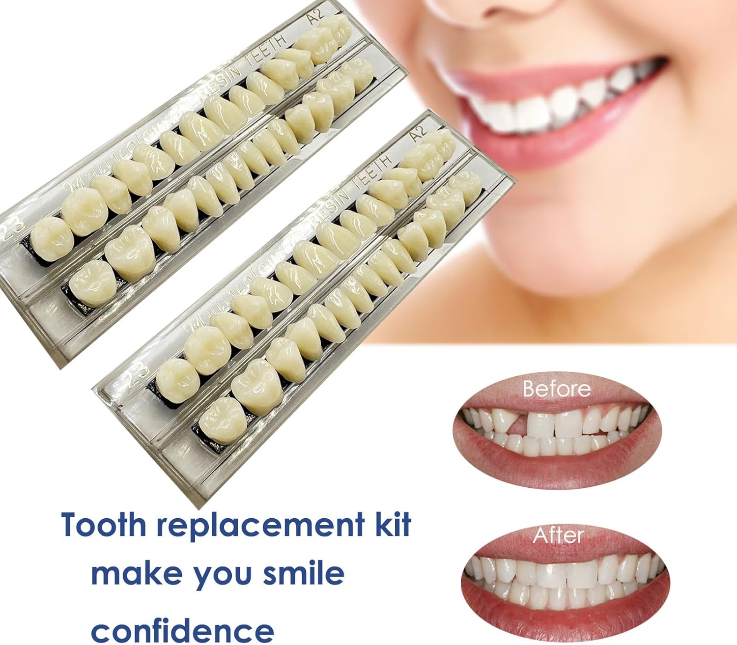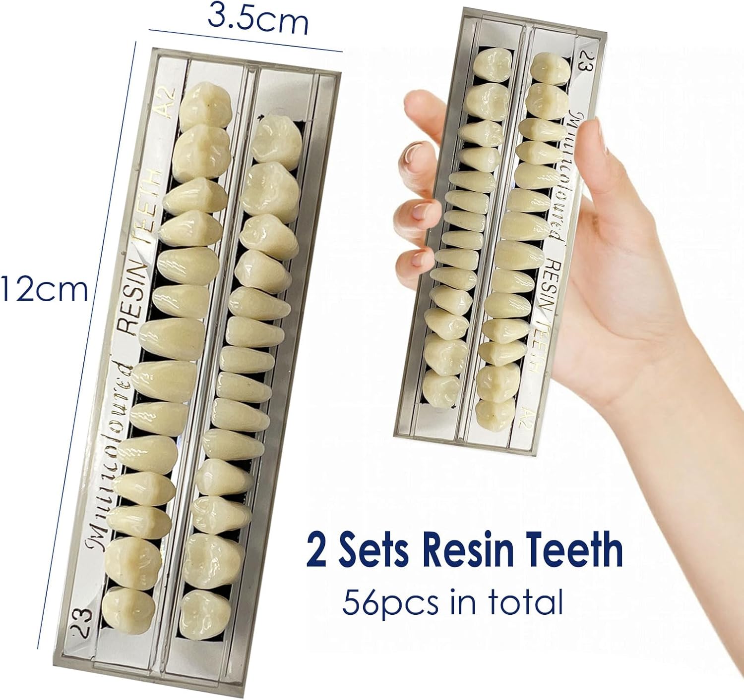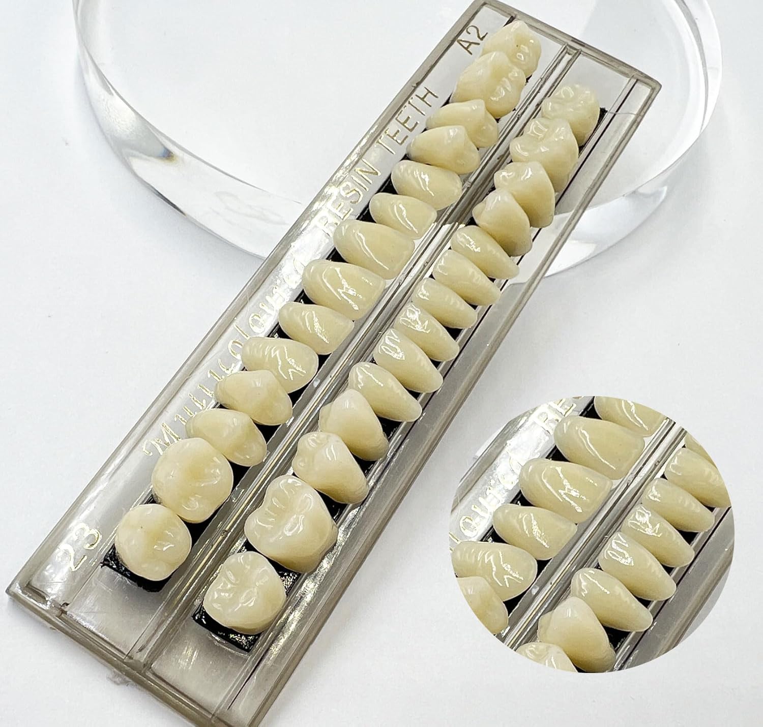 Quantità: 56 pezzi denti di ricambio (2 set, ogni set 28 pezzi compresi i denti superiore e inferiore) Dente per protesi in resina, solido per uso a lungo termine; colore: A2 Denti artificiali singolarmente perfetti per difetti dentali materiali di riparazione, per le persone che mancano i denti; anche come denti finti Queste protesi hanno un aspetto realistico, possono essere oggetti di scena fai da te, zucca fai da te, trucco horror, bambole fai da te I denti falsi non sono corone dentali, e non cave