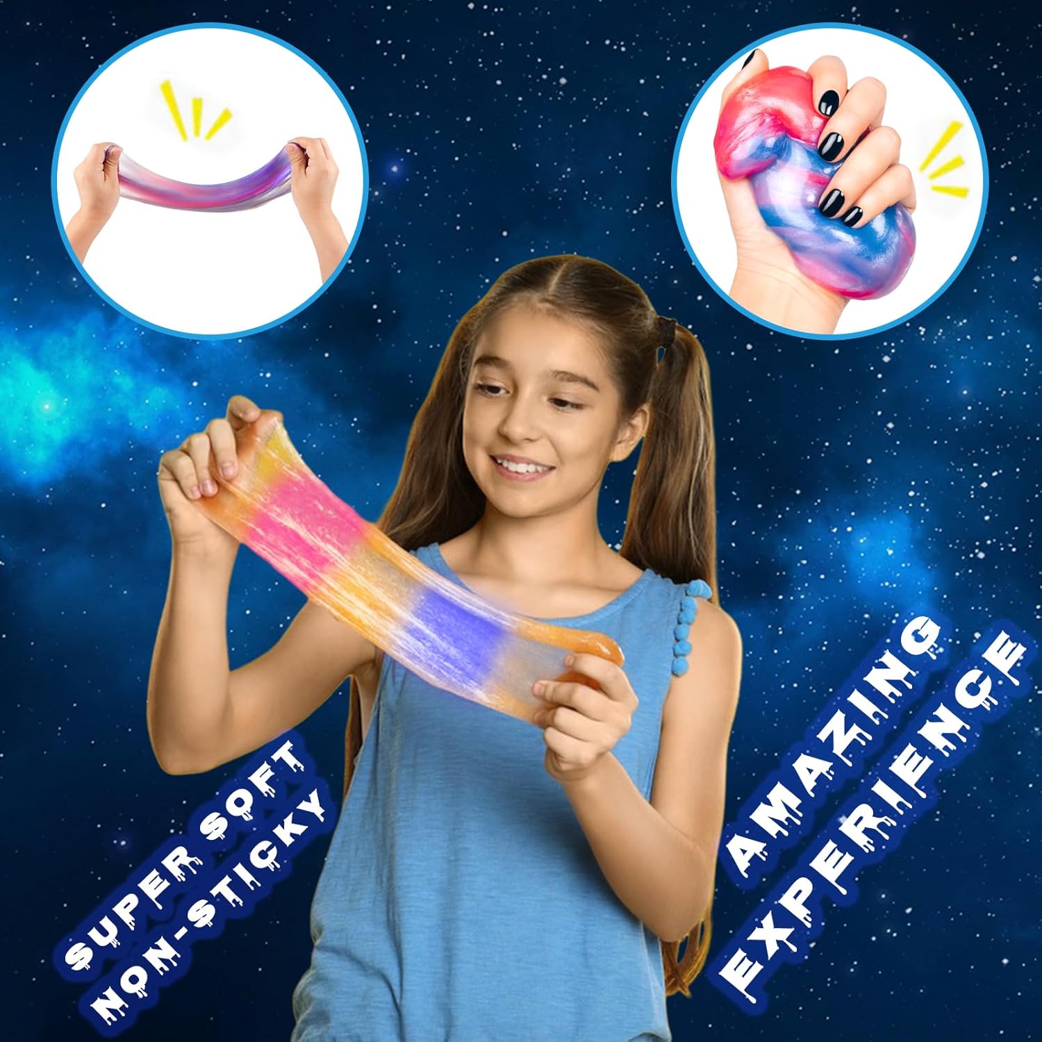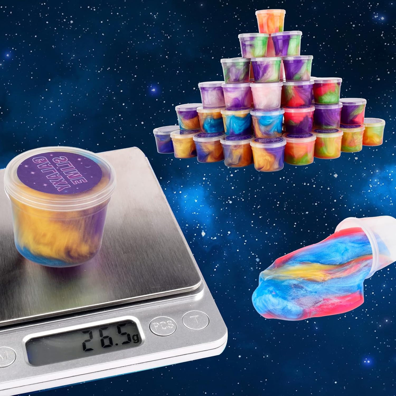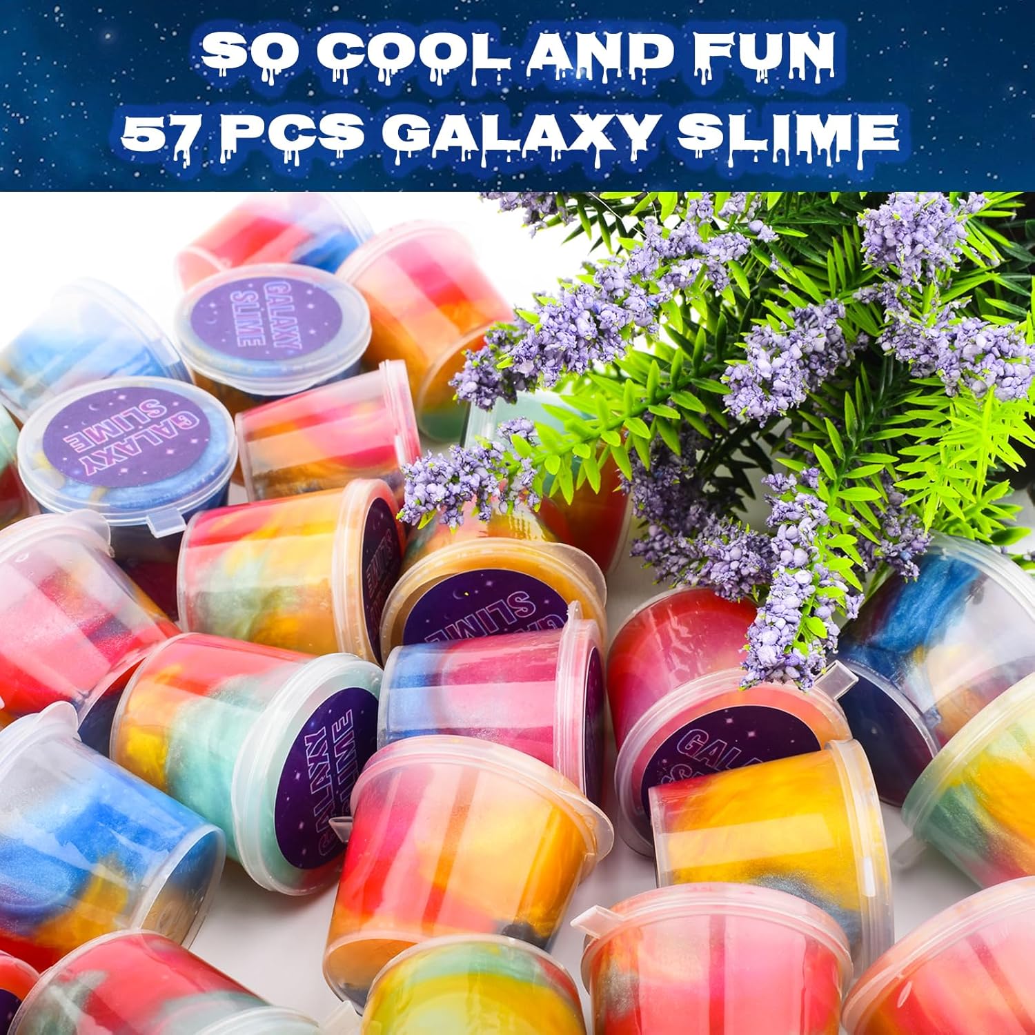 Contenuto della confezione: riceverai 57 kit di slime galassia. Ogni barattolo di slime è composto da tre colori. Sono super morbidi, elastici e antiaderenti, divertiti. Silente e sicuro: lo slime è certificato ASTM, realizzato in pura resina idrosolubile. Puoi stare tranquillo. Morbido e antiaderente: slime super morbido che non si attacca alle mani. Si prega di rimettere lo slime nel contenitore quando non lo si utilizza. La melma si asciugherà se esposta all'aria per un periodo piuttosto lungo. Sollievo dallo stress: questo slime è ideale per te. Puoi giocare o alleviare lo stress tirando e allungando lo slime galassia. Ottimo regalo: il kit per slime è molto adatto per i bambini. Il kit per la creazione di slime può sviluppare abilità pratiche e immaginazione dei bambini.