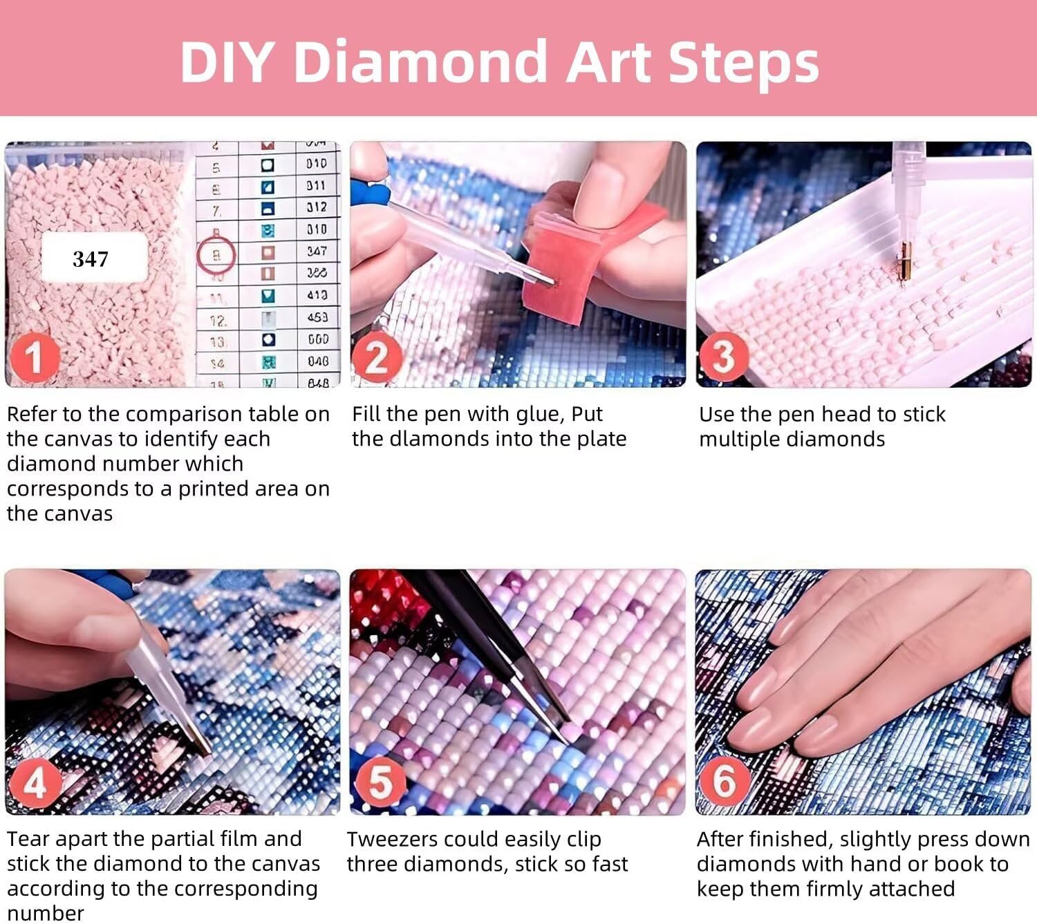 Cos'è la Diamond Painting? Come una combinazione di punto croce e pittura con i numeri, la pittura con i diamanti è il nuovo hobby creativo che sta conquistando il mondo dell'artigianato. Basta applicare strass in resina colorati su tele riccamente pigmentate. Il risultato? Opere d'arte a mosaico con diamanti visivamente abbaglianti che brillano, luccicano e brillano. Il pacchetto del kit Diamond Art include: 1. Tela colorata HD 2. Penna per diamanti 3. Vassoio per diamanti 4. Pasta adesiva rossa 5. Punte per penna sostituibili 6. Sacchetti sigillanti 7. Diamanti quadrati colorati 8. Pinzette Fasi di produzione del Diamond Art fai da te: 1. Fare riferimento alla tabella di confronto sulla tela per identificare il numero di ciascun diamante che corrisponde a un'area stampata sulla tela. 2. Riempire la penna di colla e posizionare i diamanti nella piastra. 3. Utilizzare la punta della penna per incollare più diamanti. 4. Strappare la pellicola parziale e attaccare il diamante alla tela in base al numero corrispondente. 5. Con una pinzetta si possono facilmente tagliare tre diamanti, incollandoli così velocemente. 6. Una volta terminato, premere leggermente i diamanti con la mano o un libro per mantenerli saldamente attaccati. Precauzioni per il Diamond Painting fai da te: 1. Il prodotto non include una cornice. 2. Non esporre troppa area non rifinita della tela per evitare una riduzione della viscosità. 3. A causa delle diverse impostazioni del monitor e degli effetti di luce, il colore effettivo dell'articolo potrebbe essere leggermente diverso da quello mostrato nelle immagini.