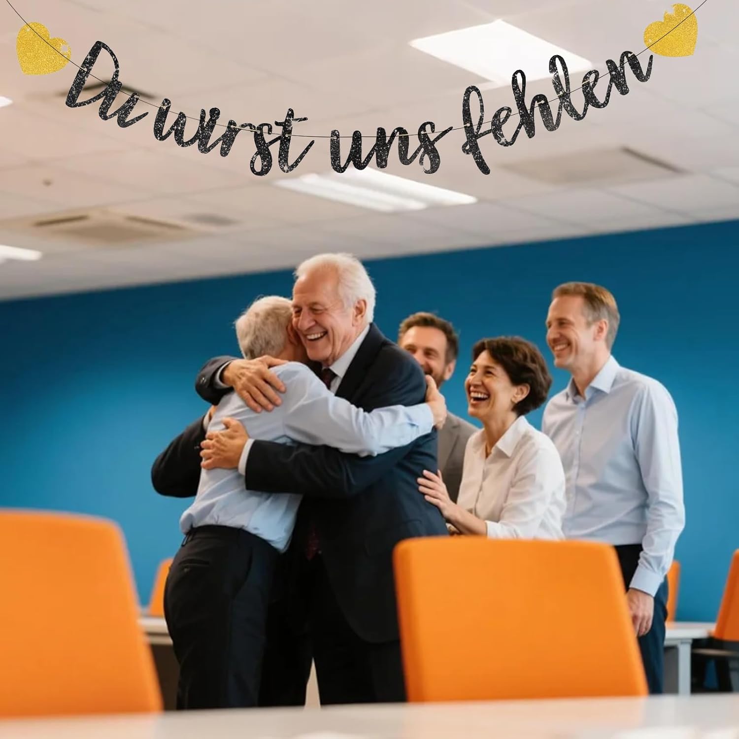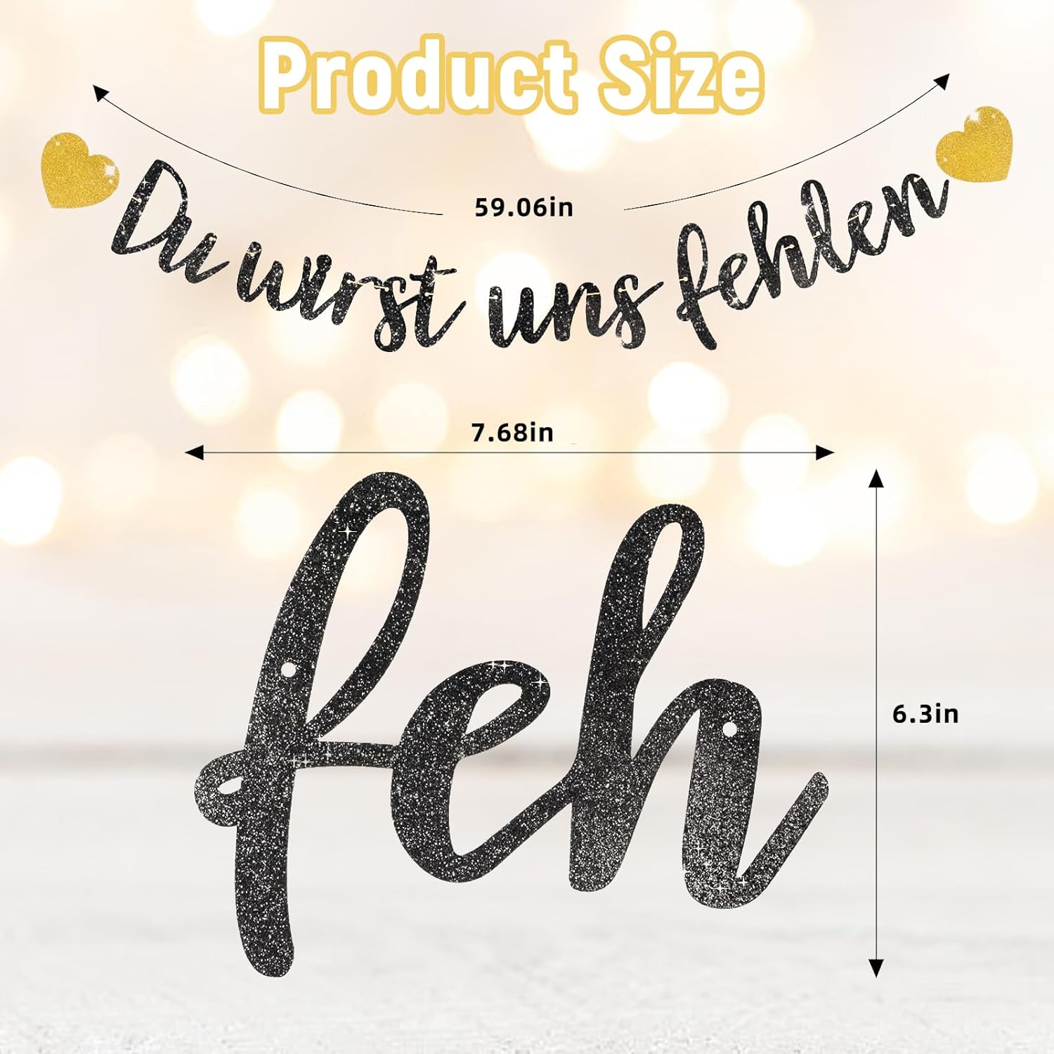 Pacchetto banner decorazione per pensionamento: riceverai 1 pezzo di decorazione per pensionamento x 5 m. Ti mancherà la ghirlanda ed è un eccellente supporto fotografico per la pensione, la laurea o il cambio di lavoro. Ghirlanda decorativa per la pensione - La ghirlanda con la scritta "Ci mancherai" esprime gratitudine e malinconia, perfetta per dare un caloroso addio ai colleghi. Materiale della ghirlanda d'addio: lo striscione decorativo è realizzato in cartone scintillante, la superficie nera glitterata conferisce alla ghirlanda un aspetto elegante e accattivante che non si cancella. Facile da montare: la ghirlanda viene fornita con un ago di plastica e una corda dorata da 5 metri in modo che possa essere facilmente infilata e appesa. Uso versatile: può essere appeso ovunque, ad es. Per esempio. all'aperto, soggiorno, studio, camera da letto, porta, finestra, mensola del camino, ringhiera delle scale, finestra, tavolo da dessert o anche come sfondo fotografico.