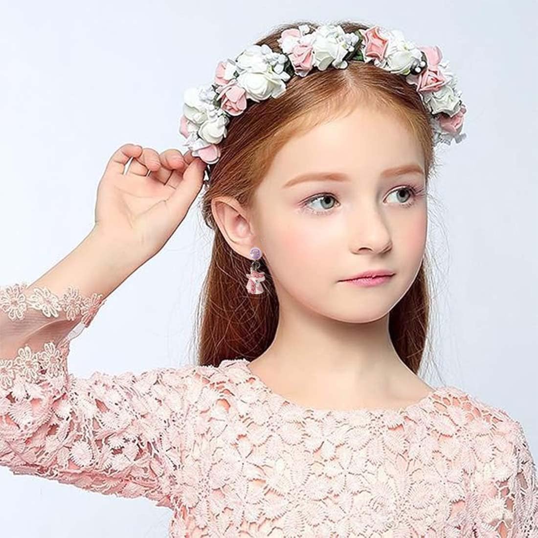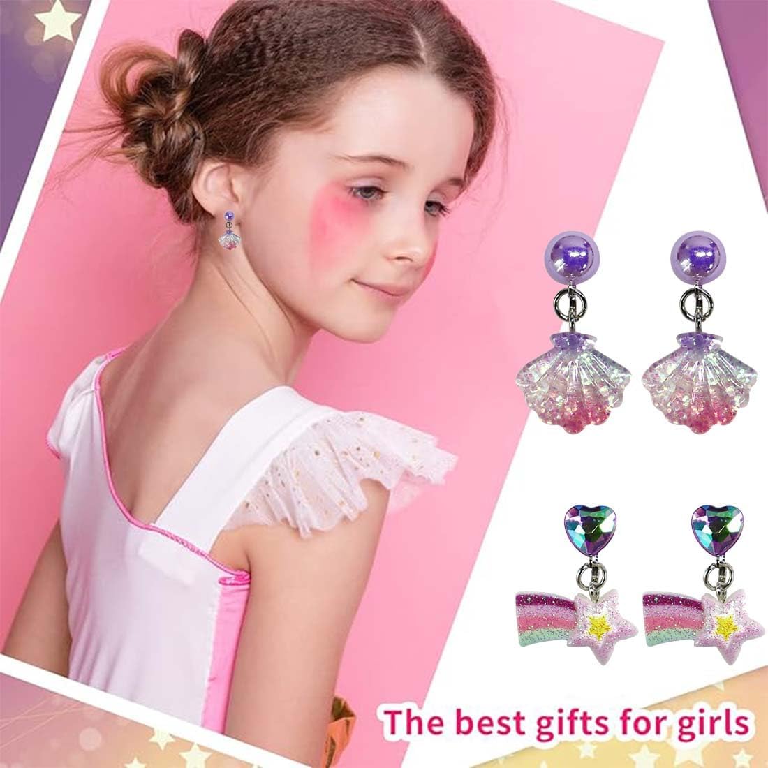 Set di orecchini a clip per bambini: 6 paia di orecchini a clip in diversi stili, tra cui diverse combinazioni di conchiglie, cavallucci marini, unicorni, arcobaleni, stelle cadenti e fiocchi. Gli stili sono ricchi e possono essere combinati a piacimento. Comodo da indossare: i morbidi cuscinetti auricolari in gomma sono progettati per evitare di bruciare le orecchie dei bambini. Gli orecchini a clip per bambine sono facili da indossare e da togliere grazie alla chiusura a clip. È molto comodo da indossare, può essere indossato a lungo e non cade facilmente. È molto adatto per i bambini che non hanno lobi forati. Sicuro e comodo: questi orecchini a clip per bambine senza fori sono realizzati in plastica e resina, sono sicuri e atossici, forti e affidabili, non sbiadiscono o si deformano facilmente, hanno una superficie liscia e non danneggiano le orecchie se indossati per lunghi periodi di tempo. Ampiamente utilizzati: questi orecchini a clip per ragazze sono raffinati e carini, non solo possono essere indossati quotidianamente, ma sono adatti anche per feste, compleanni, festa dei bambini, Natale, Halloween, ecc. Una varietà di stili interessanti e colori brillanti rispondono alle diverse esigenze delle ragazze e rendono unica la vita quotidiana dei bambini. Regalo perfetto: gli orecchini a clip per bambini e bambine sono squisiti e belli e sono molto adatti come regalo per figlie, nipoti e bambine per compleanni, feste dei bambini, Natale, ecc.