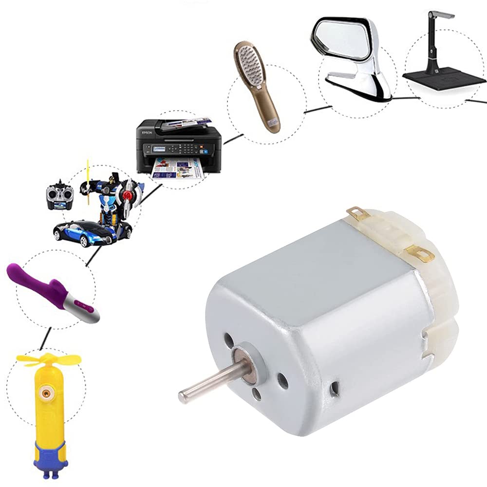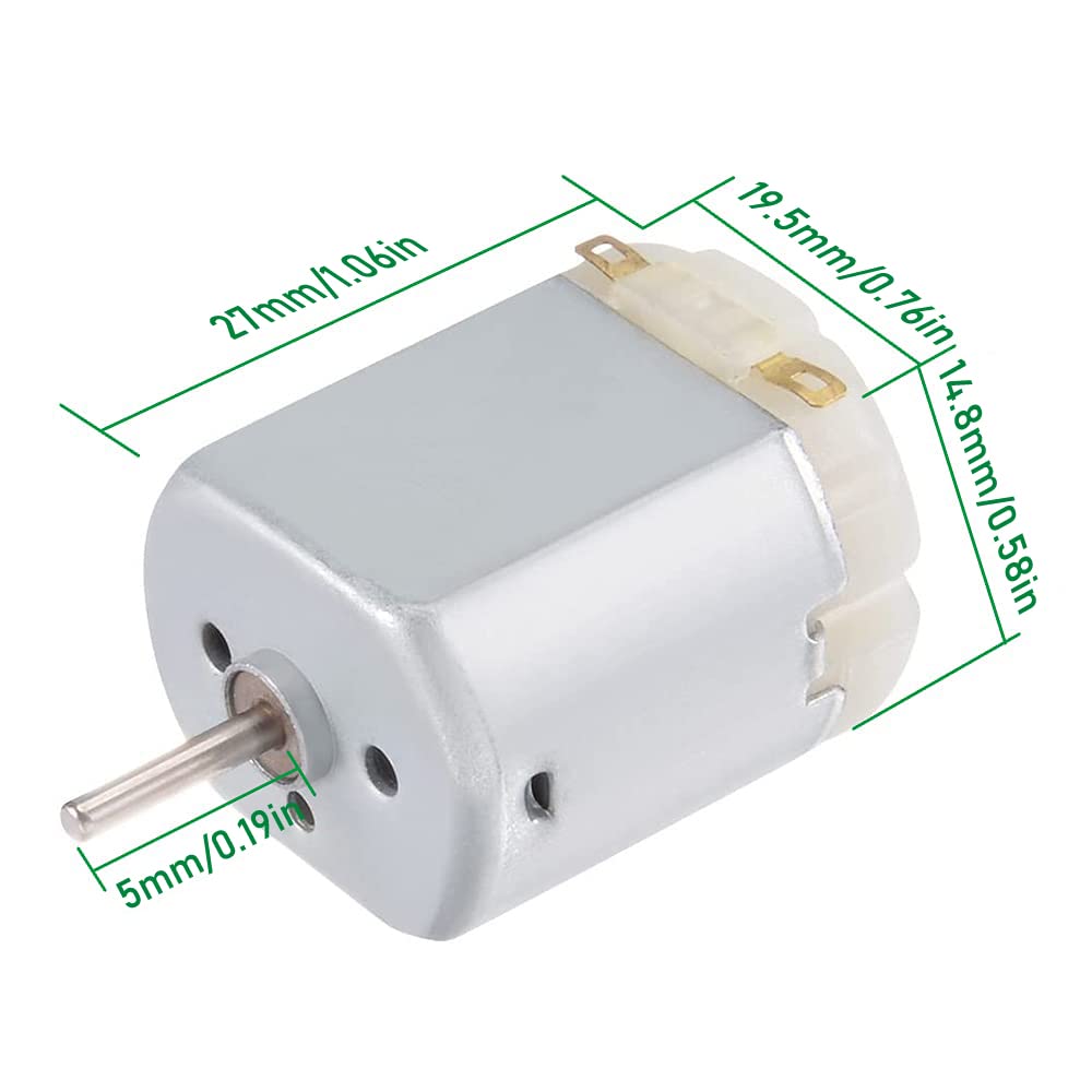 La tensione nominale è 3V; corrente nominale: 0,2; velocità: 15000 giri/min. Dimensioni albero (L*P*A): 3,3*1,95*1,5 cm; Lunghezza dell'asse: 0,5 cm; Diametro dell'albero: 0,17 cm; Colore: argento. I piccoli motori sono realizzati in rame e ferro di alta qualità, funzionano perfettamente con un guscio metallico di alta qualità e hanno una lunga durata. Facile da installare e smontare, utilizza il motore Micro DC per sostituire i vecchi motori nei giocattoli telecomandati. Riempi i tuoi giocattoli di energia. Ideale per giocattoli robot, progetti di laboratorio studenteschi, lezioni STEM, automobili a motore, lezioni di ingegneria e altro ancora.