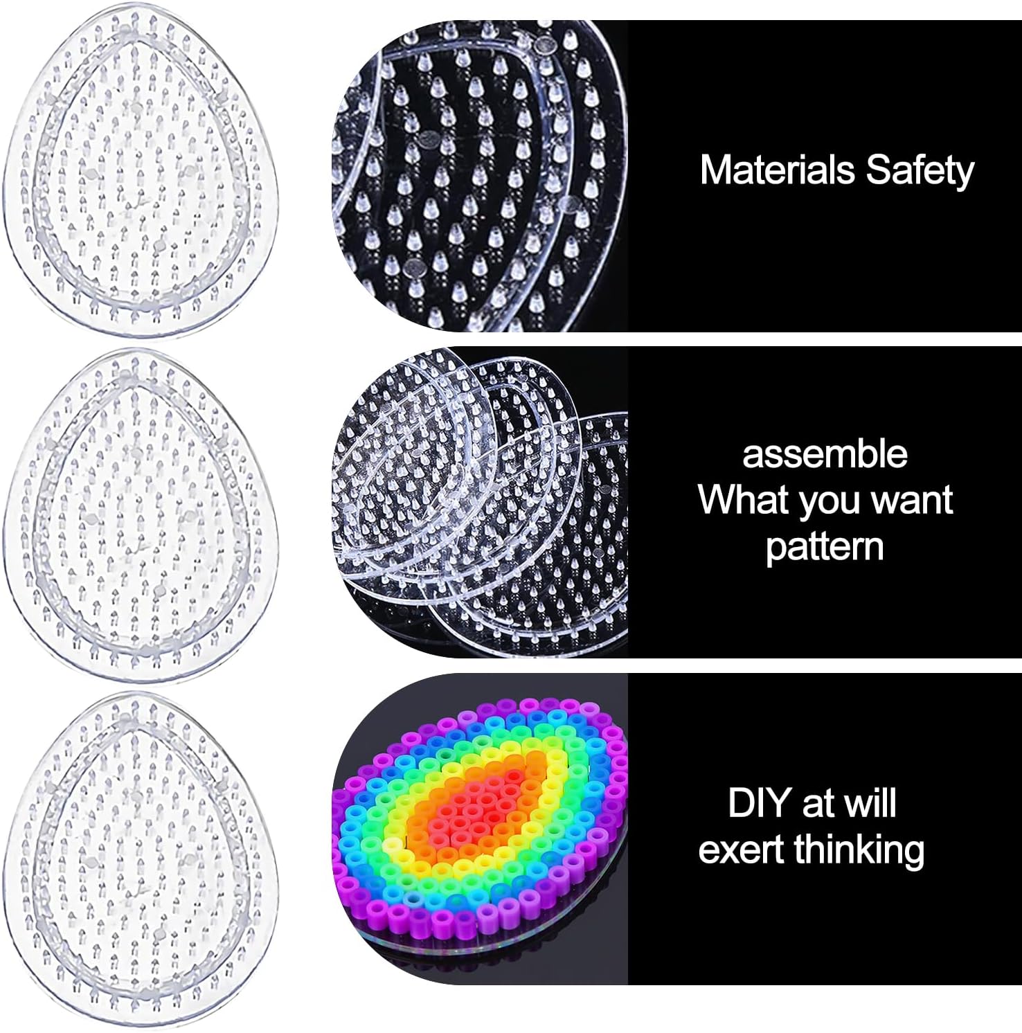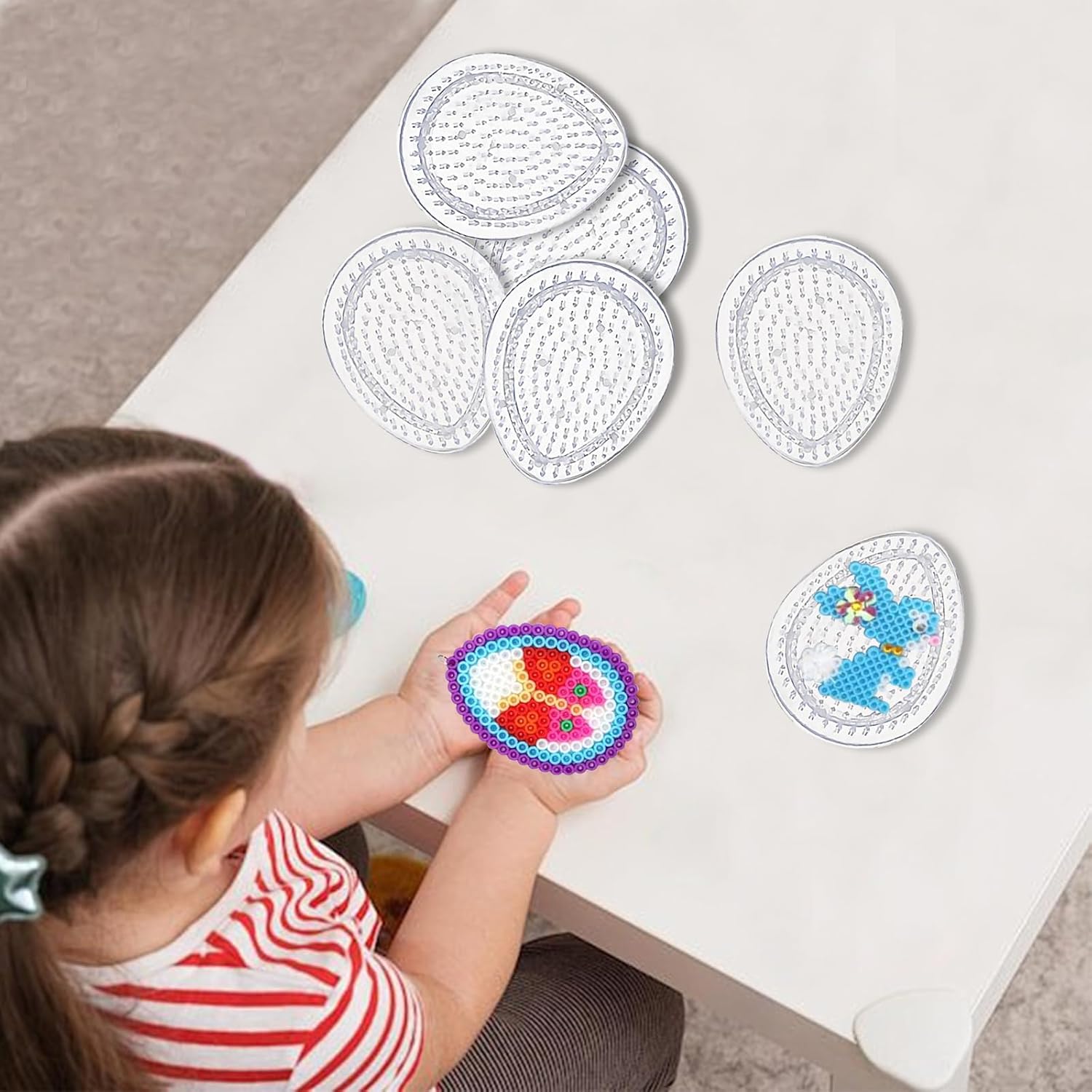 Set Completo per il Fai da Te: Il set include 6 basi trasparenti per perline da stirare (9x7 cm), perfette per progetti creativi DIY e lavoretti pasquali. Ideale per creare decorazioni, portachiavi, spille e molto altro. Materiali di Alta Qualità: Queste basi per perline da stirare sono realizzate in plastica robusta e trasparente, resistente al calore. Non si fondono né si deformano durante l'uso con il ferro da stiro, garantendo risultati sicuri e durevoli. Stimola la Creatività e le Abilità Motorie: Con queste basi per perline, i bambini possono migliorare la coordinazione occhio-mano e la creatività sviluppando i propri design. Anche gli adulti possono divertirsi con attività creative, perfetto per momenti di bricolage in famiglia. Facile da Usare: Posiziona le perline sulle basi per perline da stirare, coprile con carta da forno e stira delicatamente per creare le tue opere d’arte in pochi minuti. Ideale sia per principianti che per esperti di fai da te. Perfetto per Attività di Gruppo: Questo set è ideale per lavoretti pasquali o altre festività. Crea decorazioni e regali unici insieme ad amici e familiari. Un’attività creativa perfetta per celebrare le festività in compagnia!
