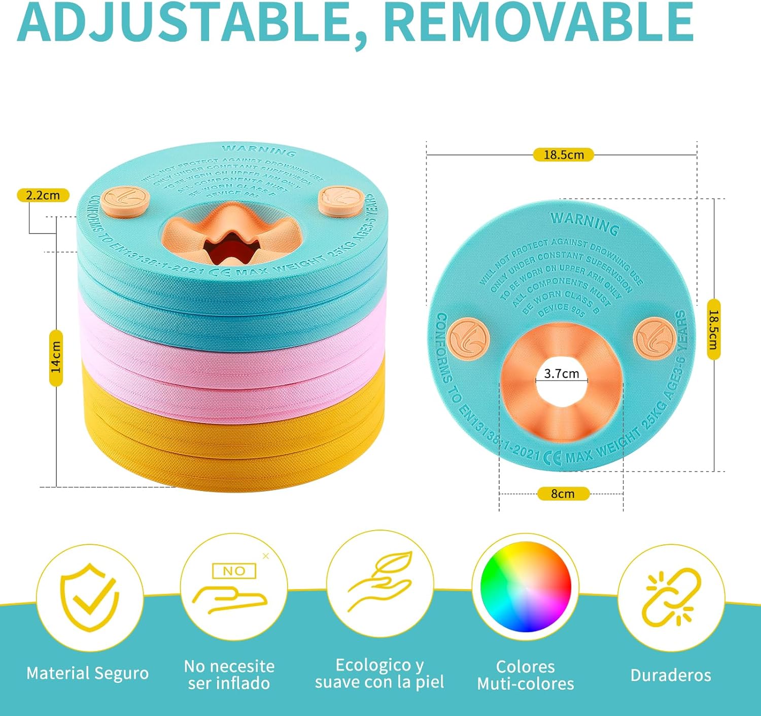 1. Materiale: manicotti bambino Realizzato in materiali schiumogeni EVA, la capacità di carico può raggiungere da 10 a 30 kg, adatto per i bambini di nuotare Antiaderente e non assorbente, più sicuri e affidabili dei normali prodotti gonfiabili.Il materiale delicato sulla pelle garantisce il miglior comfort e previene lo sfregamento sulla pelle. 2. Configurazione del prodotto: manicotti sughero con un solo diametro di 18,5 cm, spessore 2 cm, composto da tre colori di giallo, rosa e blu, colori brillanti, molto bello. 3. Adatto per: È molto adatto per persone che stanno imparando a nuotare e la cui circonferenza del braccio è inferiore a 8 cm 4. Caratteristiche del prodotto: non è necessario gonfiare prima dell'uso, è facile da usare. La posizione dell'acqua ottimizzata ha aumentato la sicurezza dei bambini e dei bambini piccoli nell'acqua. 5. Promemoria amichevole: questo prodotto è adatto solo per i bambini per imparare a nuotare e può essere utilizzato solo come strumento ausiliario.
