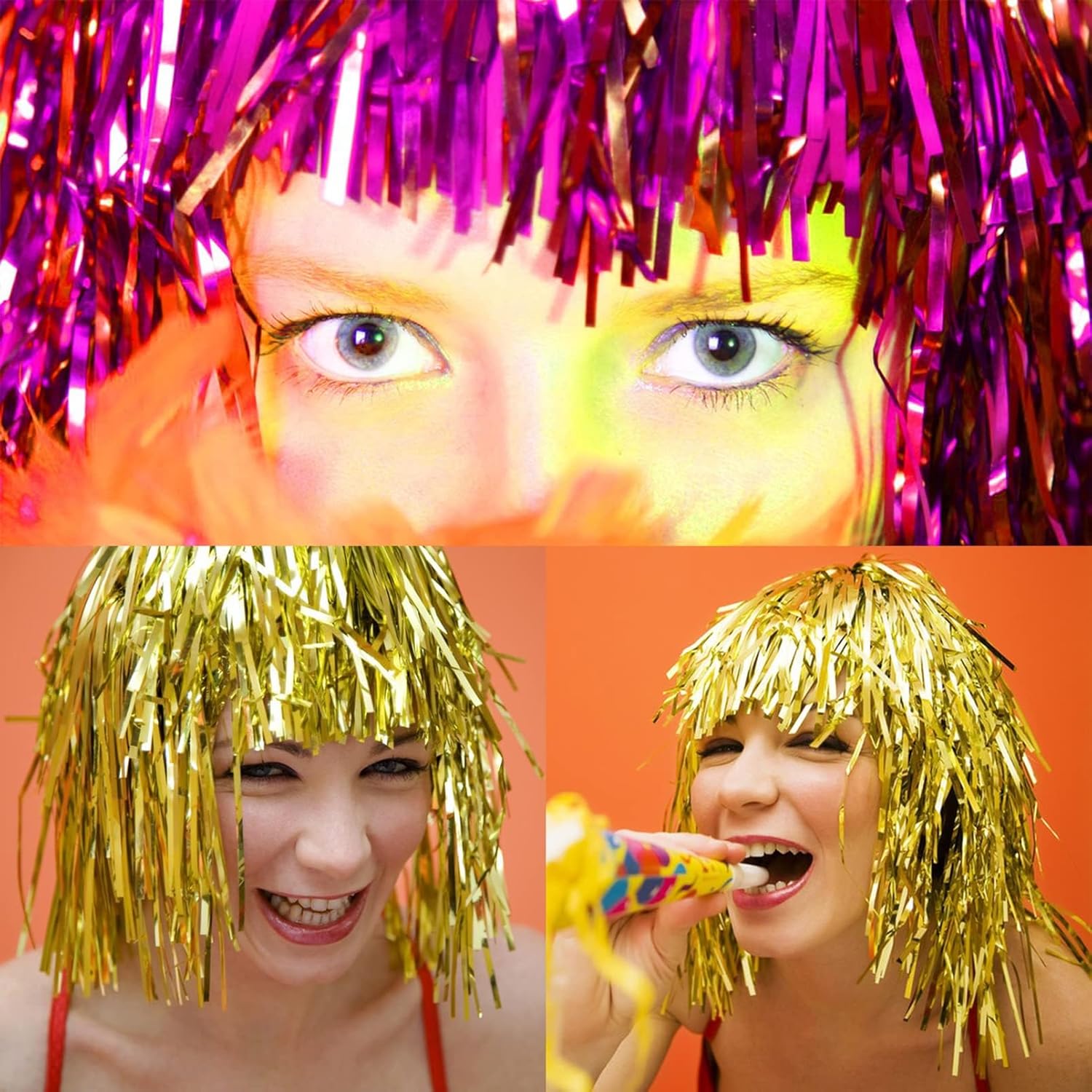 [Contiene 6 colori abbaglianti]: rosso metallizzato, argento, oro, colori abbaglianti, rosa e blu. Il materiale in lamina metallica ad alta lucentezza è riflettente e brillante e crea un look accattivante per la palla da discoteca! [Leggero e resistente] :Realizzato in lamina metallica ultrasottile, leggero, traspirante, resistente al sudore e pieghevole per essere riposto. Brilla ancora come nuovo anche dopo diversi utilizzi! [Dimensione universale] :Si adatta saldamente alla maggior parte delle circonferenze della testa (adulti e ragazzi). Unisex, regalo ideale per la famiglia e gli amici o per una festa di gruppo! [Tema della festa tutto in uno] :Trasformati in una punk rock star, in una regina del carnevale o in un personaggio di Halloween in un secondo! Adatto per feste in discoteca, cosplay, feste in maschera, feste electro, brevi riprese video. [Set di 6 pezzi] :Un set di 6 parrucche abbinate a piacere, puoi condividere il divertimento! Pronte all'uso, prima scelta per i regali di Natale, accendono l'atmosfera della festa!